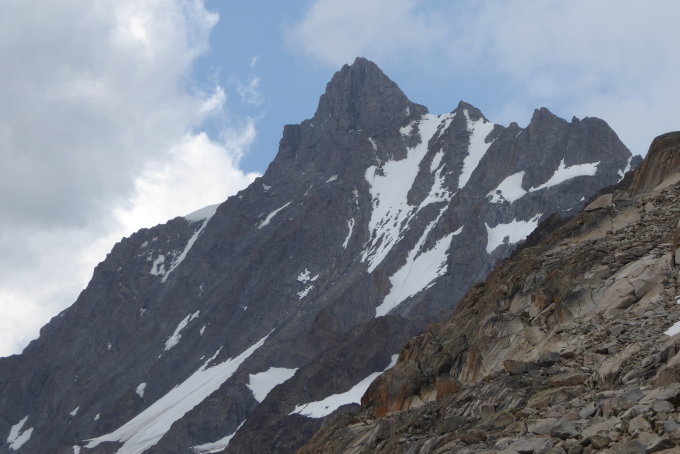 Danach den Überblick verloren und einmal quer durch die Wand zum Grat hoch. Ziemliches Schutt- und Absturzgelände. Von dort wegen dem fortgeschrittenen Tagesverlauf heikel wieder abgestiegen . Der Zugang zum Aarbiwak ist sensationell.Schon allein dieser war die Tour wert.