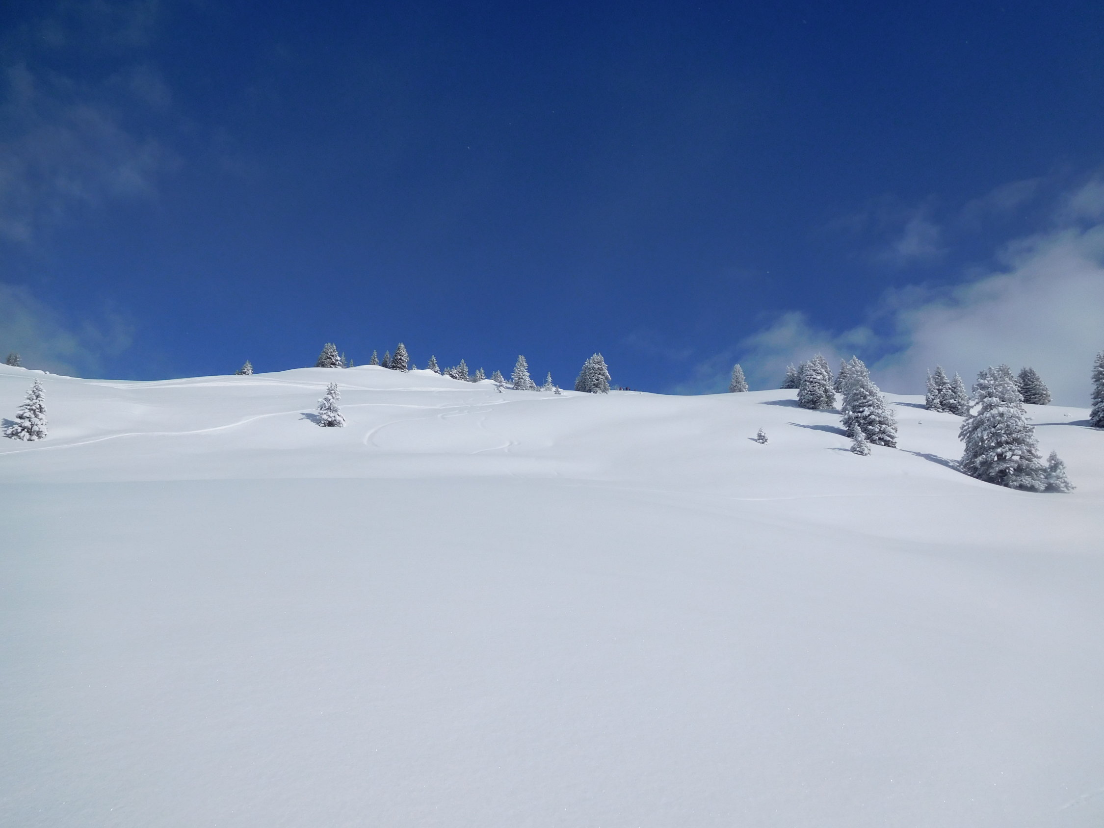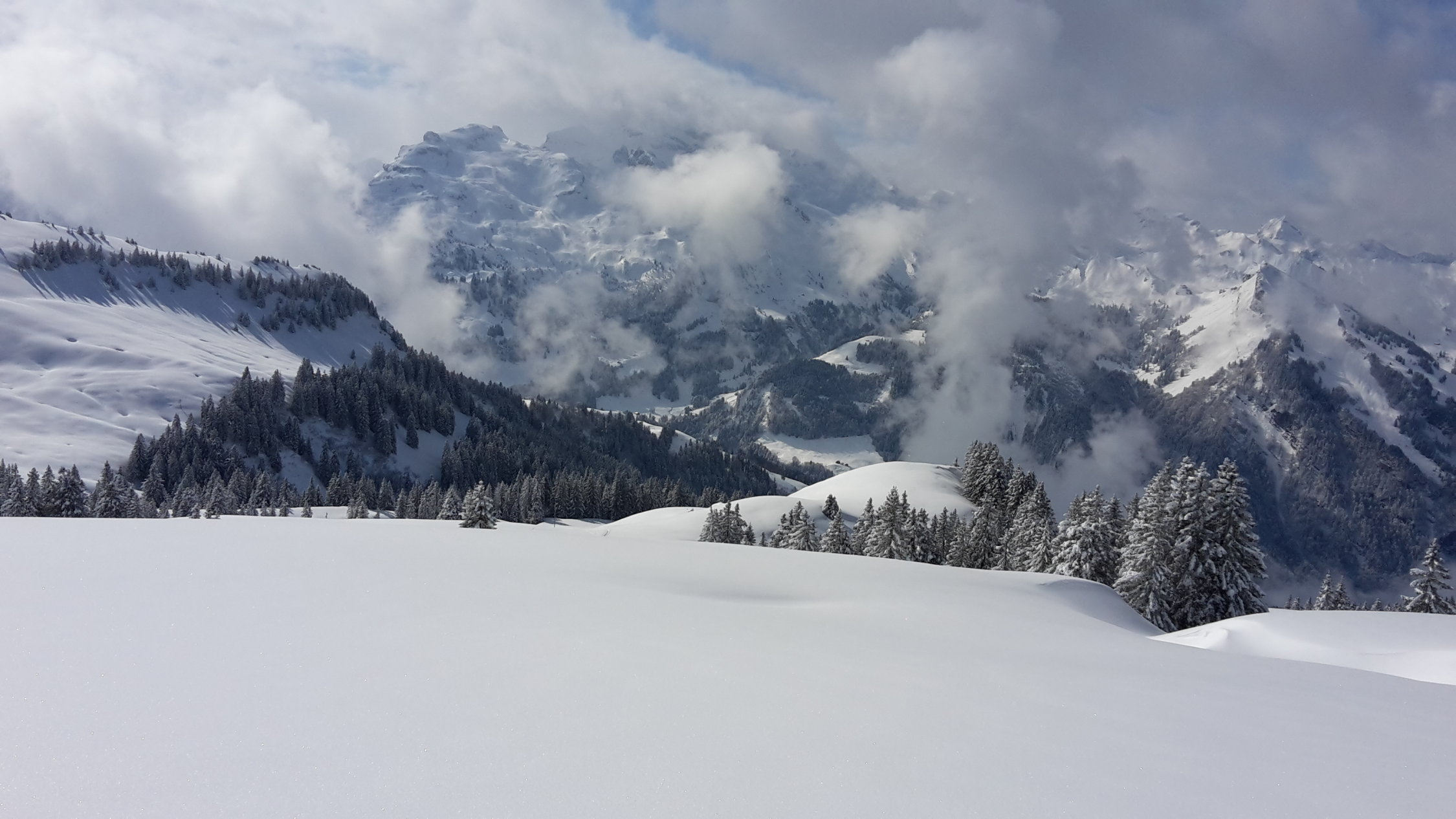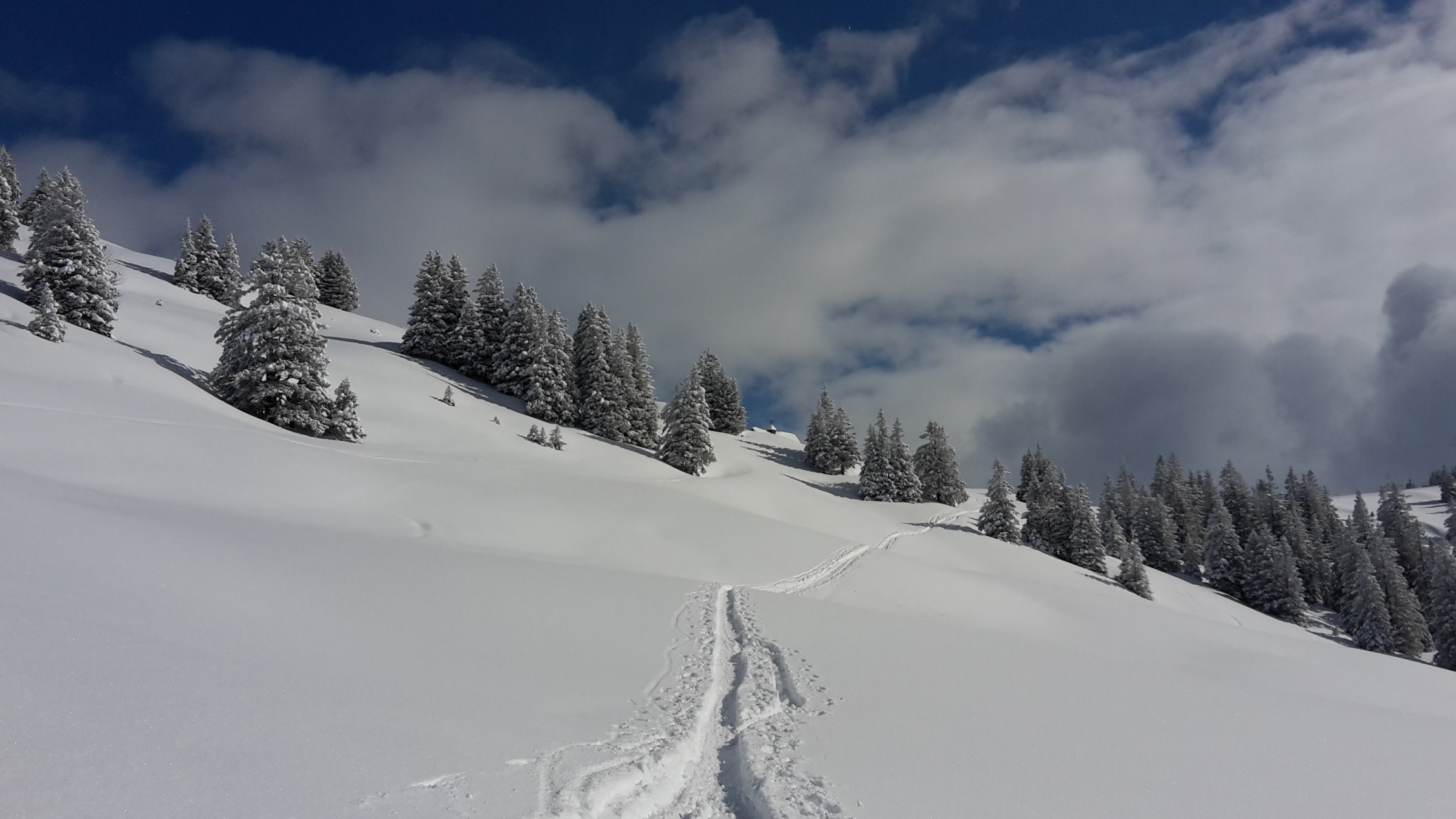Start der Tour am 8.15 Uhr bei leichtem Schneefall, durch die frisch verschneite Landschaft zum Gipfel vom Laucherenstöckli und zum Spirstock, bald zeigte sich die Sonne, die Schneequalität war heute recht gut, 20-50 cm Neuschnee ohne Windeinfluss, die Tage für Laucherenstöckli Abfahrt Südseit bei Pulverschnee sind bald sicher vorbei.
