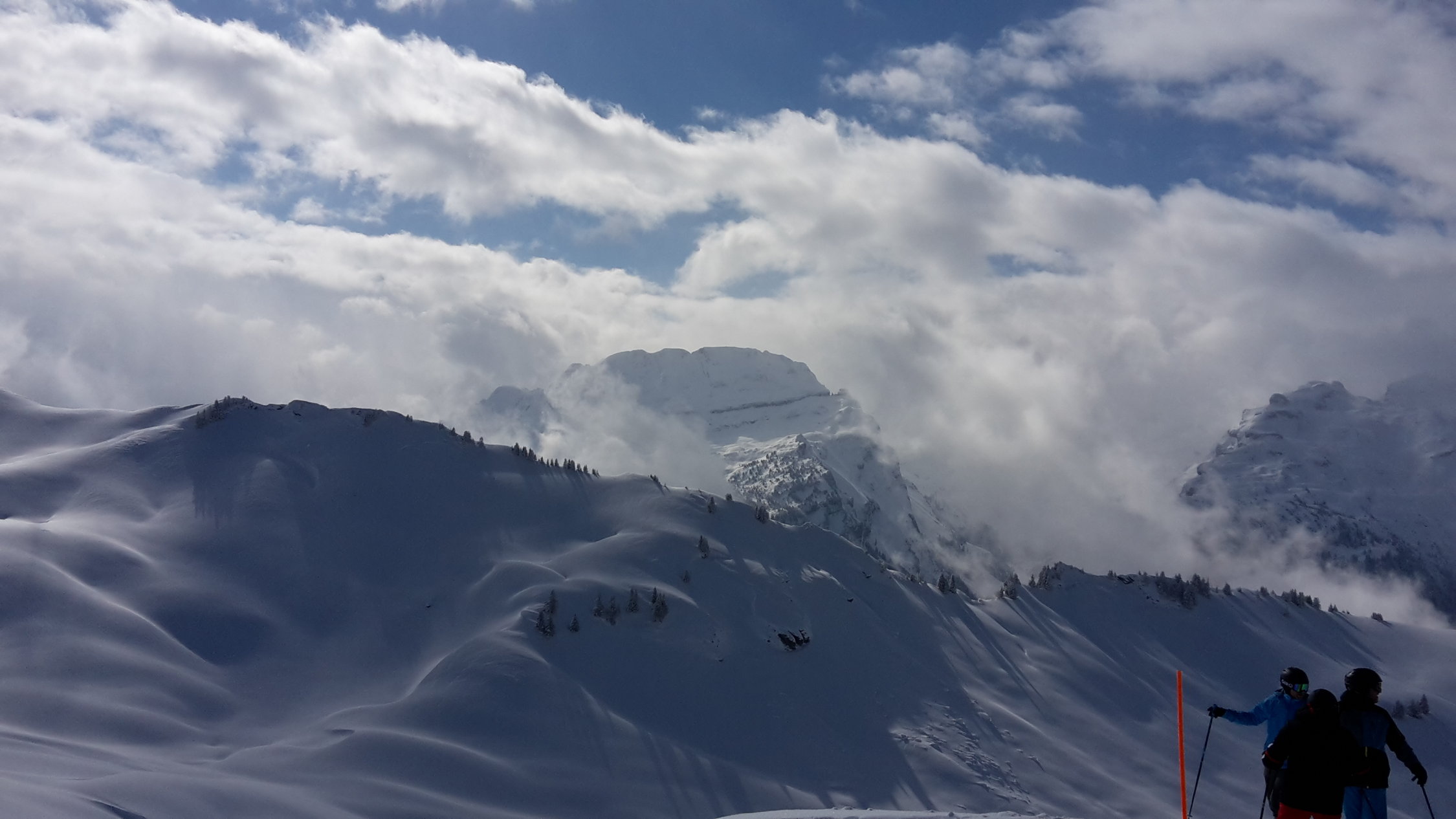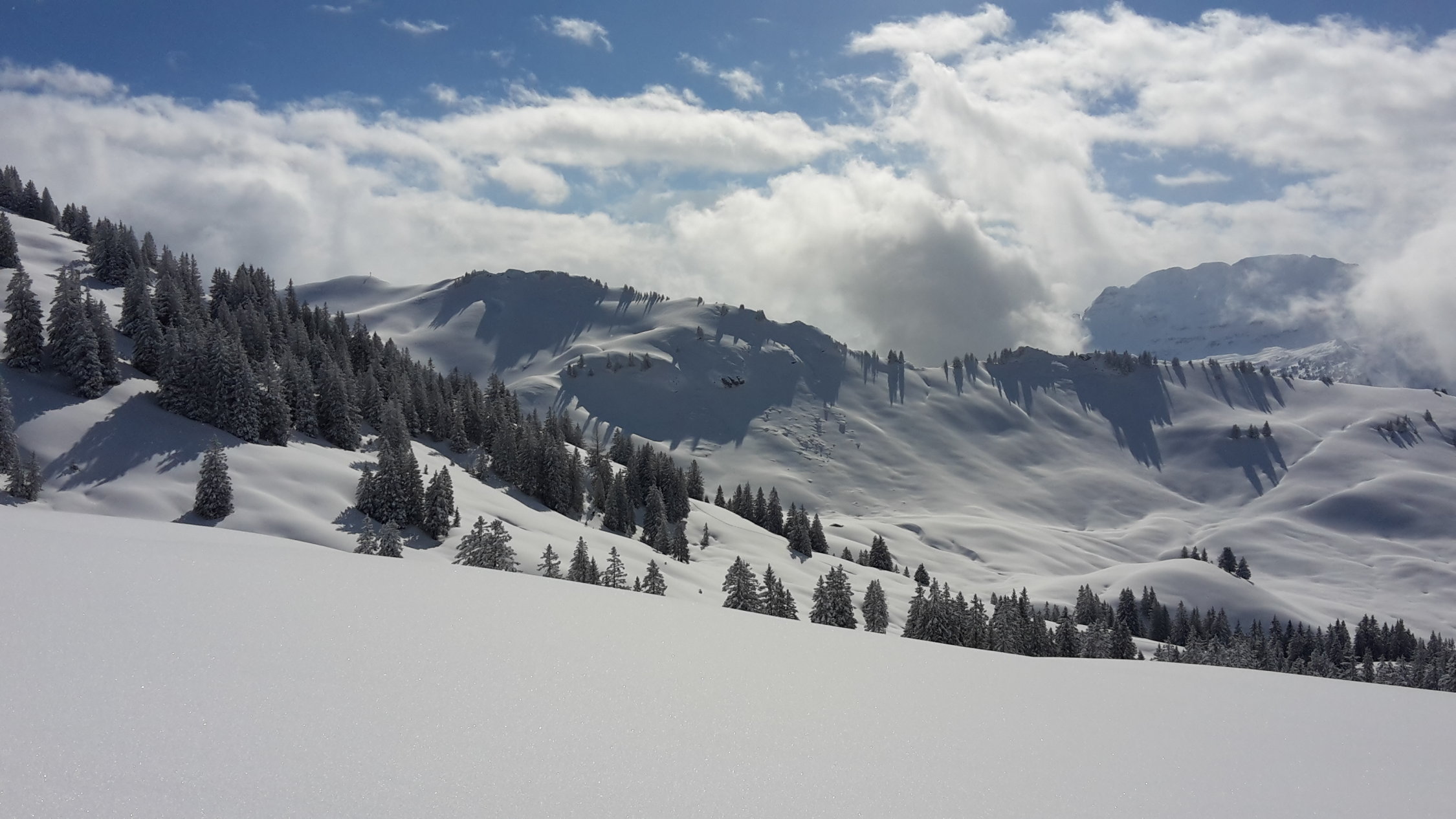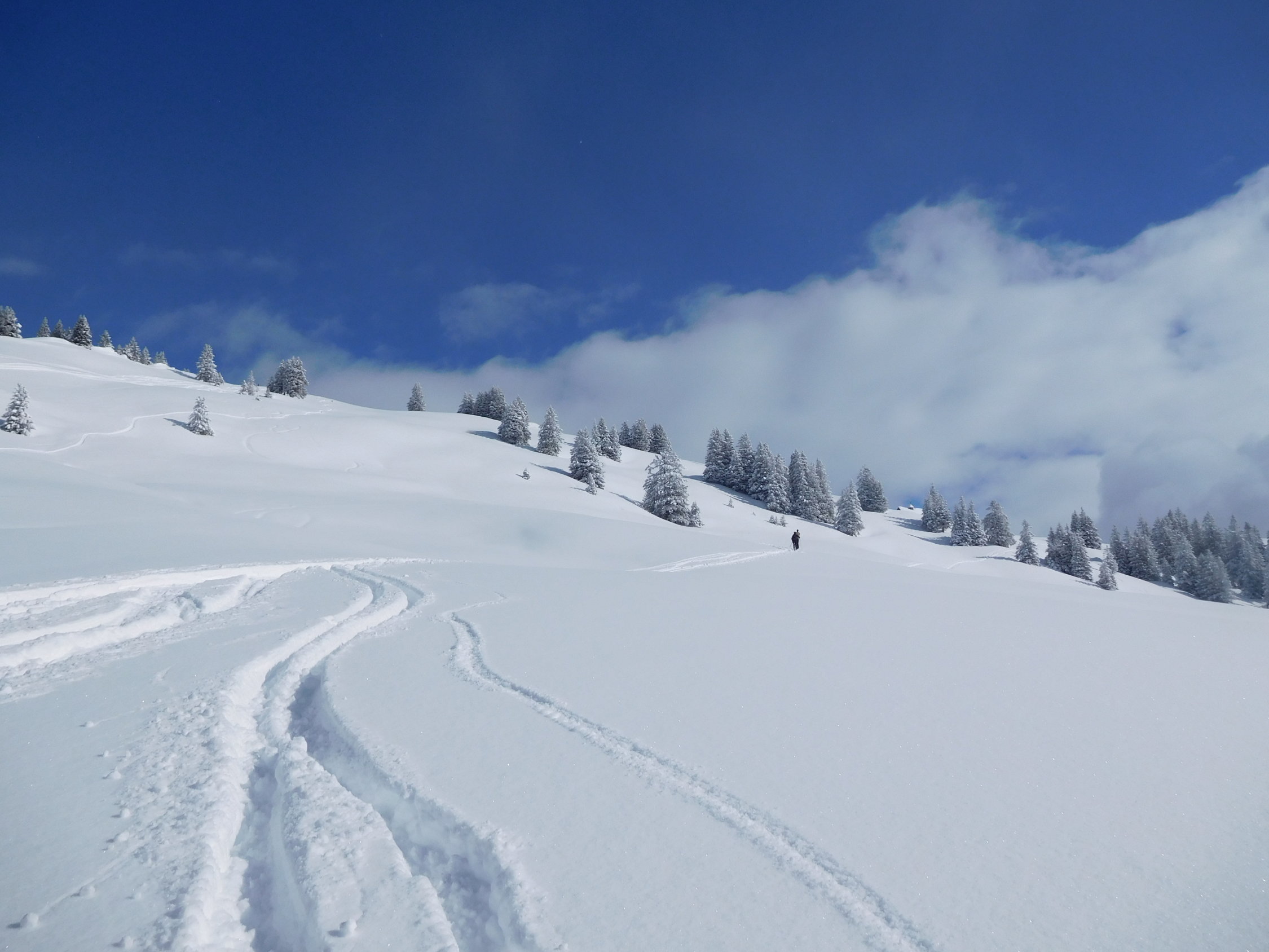 Start der Tour am 8.15 Uhr bei leichtem Schneefall, durch die frisch verschneite Landschaft zum Gipfel vom Laucherenstöckli und zum Spirstock, bald zeigte sich die Sonne, die Schneequalität war heute recht gut, 20-50 cm Neuschnee ohne Windeinfluss, die Tage für Laucherenstöckli Abfahrt Südseit bei Pulverschnee sind bald sicher vorbei.