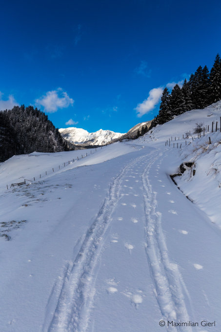 Die Abfahrt ein Traum, stetiges powdersurfen bis hinab zur Fahrstrasse. Abfahrt Bianca 950 m. Den Rest dann den Ski zu liebe zu Fuss. Wunderbar!