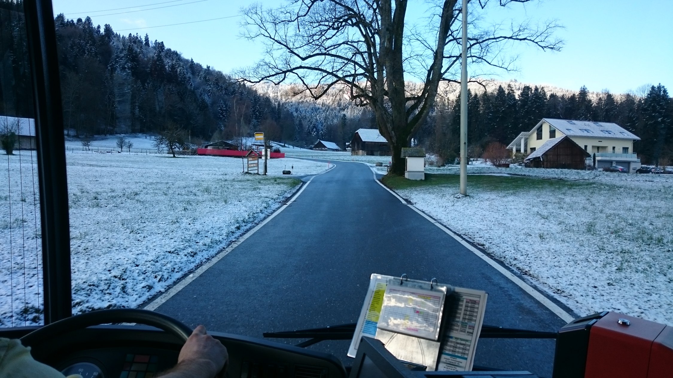 Direkt bei der Busschleife, Talboden Eigenthal, die Ski angeschnallt.