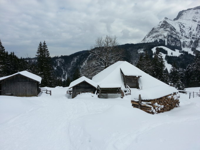 Bis Alp Gumm eine breite Winterwanderautobahn, die auch mit Wanderschuhen gut zu begehen ist. ab Alp Gumm diverse Schneeschuh- und Skispuren bis auf den Gipfel. Ich bin zum ersten Mal über den Südhang aufgestiegen. Ca. 20 cm guter Pulver, der im Lauf des Nachmittags aber durch die Wärmeeinwirkung stark zusammenfiel.