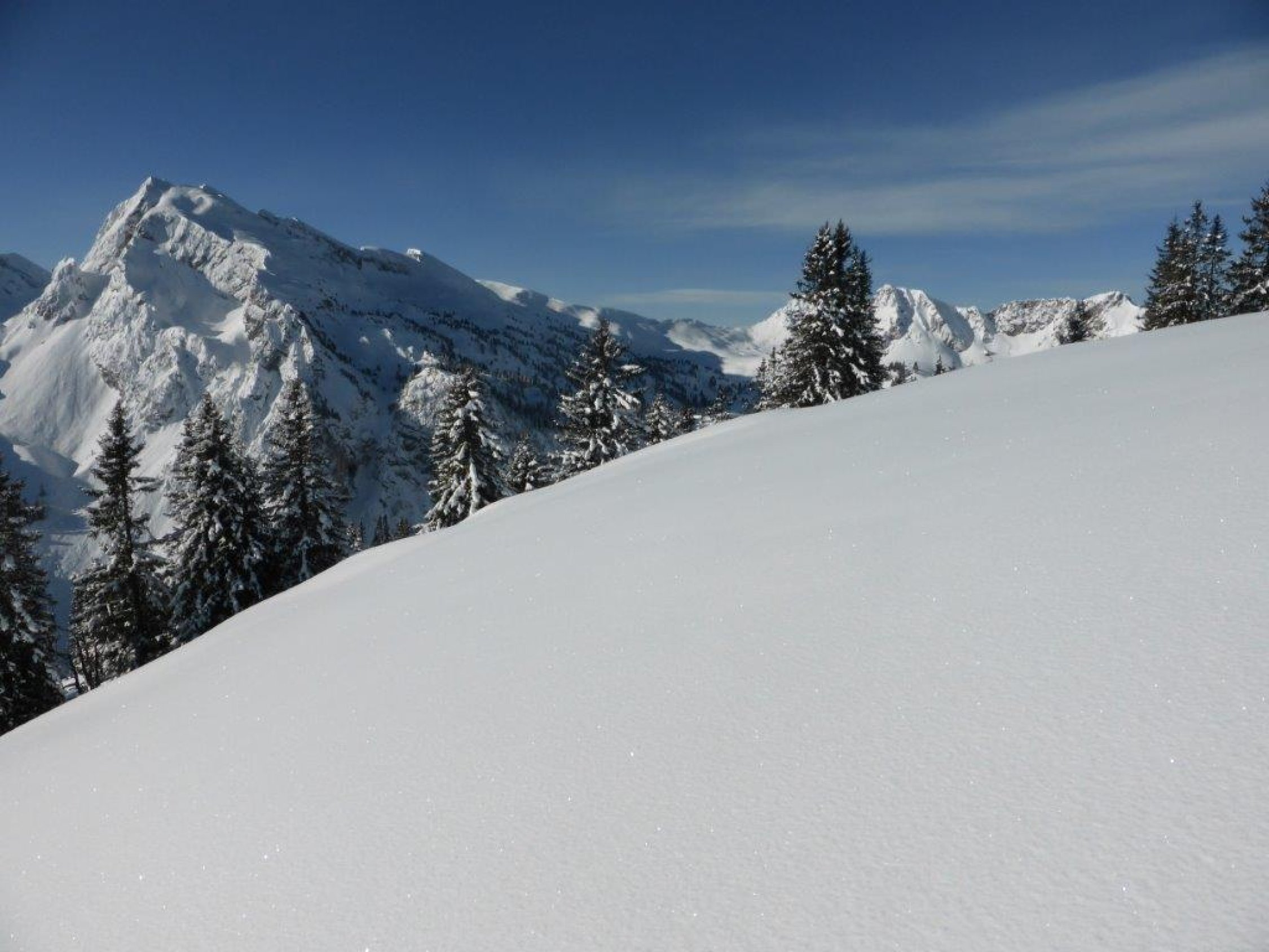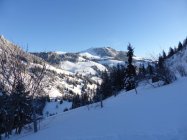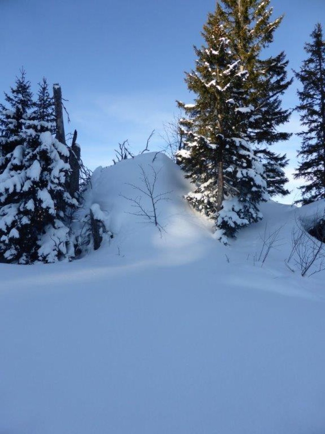 Abfahrt direkt nach Menigwald zu den unteren Hütten - durch steileren lichten Wald. Herrlich.