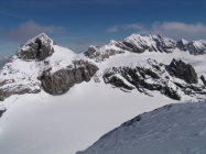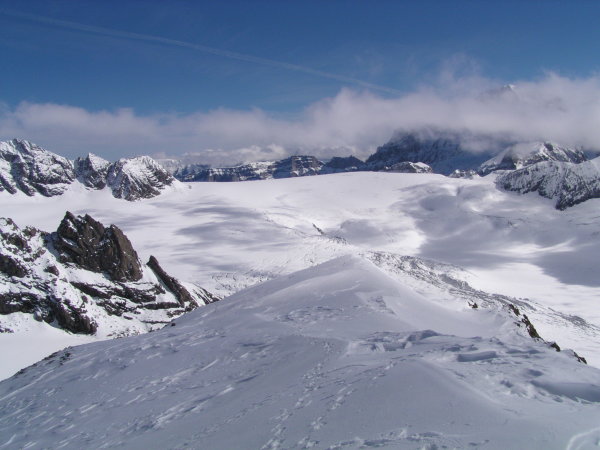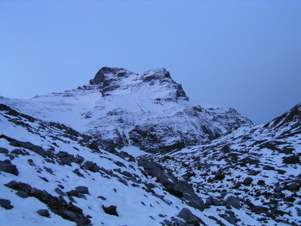 Schwierige Verhältnisse. Ab 2300m stellenweise bis 50cm, in Löchern und Mulden bis 80cm Schnee. Nach 6 Stunden Spuren (grösstenteils Bruchharst, schwer zu tretender Schnee) auf dem Ostgrat auf 3100m umgekehrt. Frühzeitige Rückkehr war notwendig, um der Spaltensturz- und Steinschlaggefahr auszuweichen. Uns hätte es auch sonst gereicht. Eine Spur ist jetzt vorhanden!