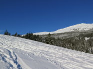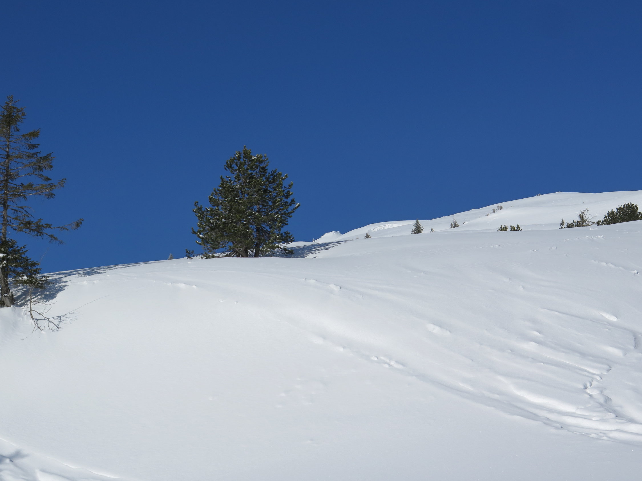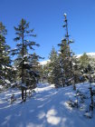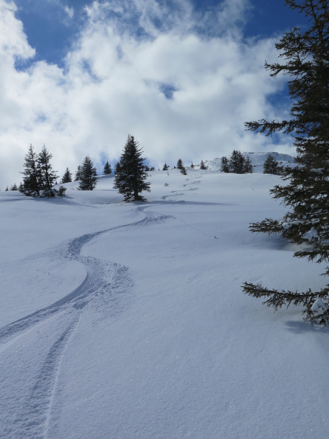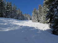 In der Nacht auf Heute hatte es ab ca.1300m.ü.m. noch ein paar cm Schnee gegeben. je nach Lage vielleicht 10-20 cm. unten weniger. Oben war der Wind leicht am Werk. Der Winddeckel störte das Abfahrtvergnügen kaum.