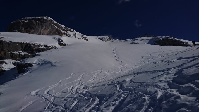 Pulver, windstill, relativ kalt. Genug Schnee von unten bis oben. Oberhalb von Rinderweid hats noch viel Platz für neue Spuren.