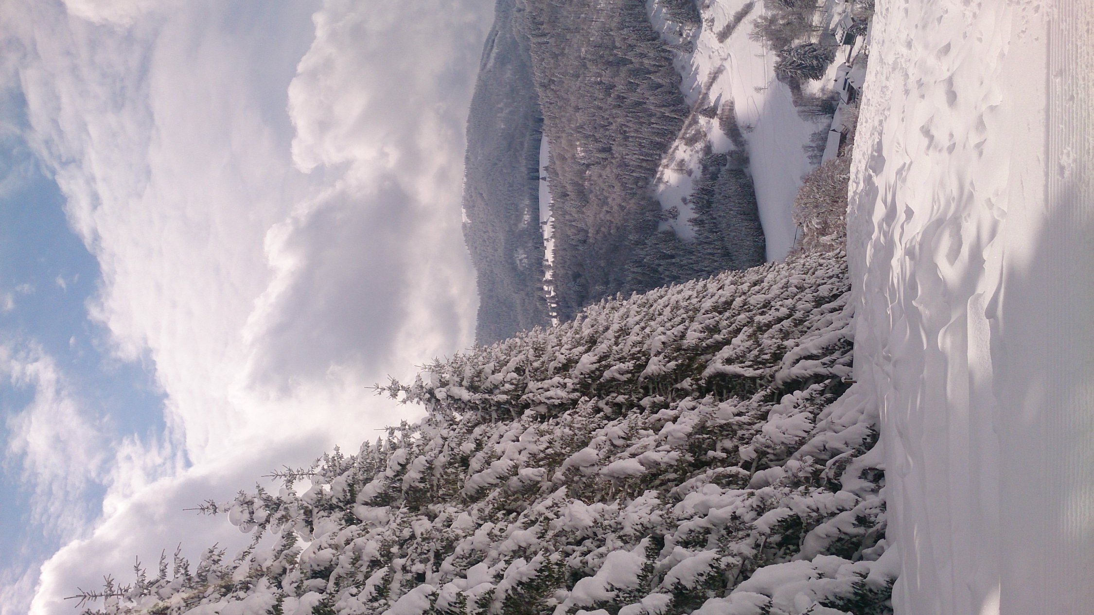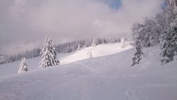 Angenehm in der Temperatur, Start um 11 Uhr bei Sonnenschein, Schnee schon recht kompakt im Dorfhang. In der Schneise und im Gipfelhang gut für diese Tages- und Jahreszeit. Auf dem Gipfel noch gute Sicht und ausnahmsweise fast kein Wind.