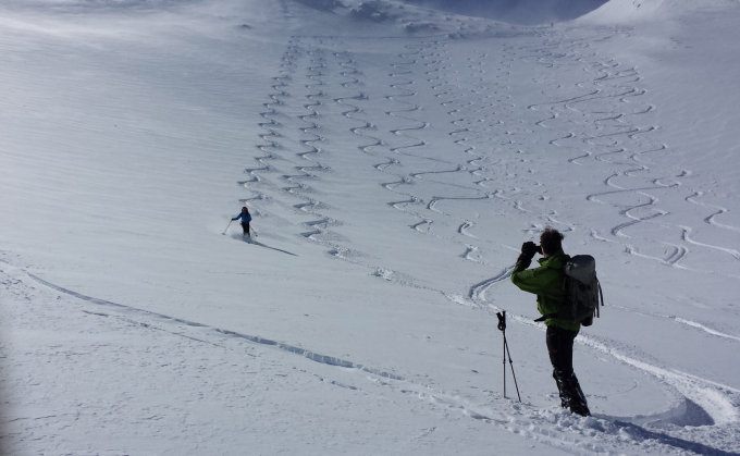 Fantastische Pulverschnee-Verhältnisse. Im mittleren Bereich leicht vom starken SW-Wind bearbeitet. Die oberen Hänge aber einfach nur schön.