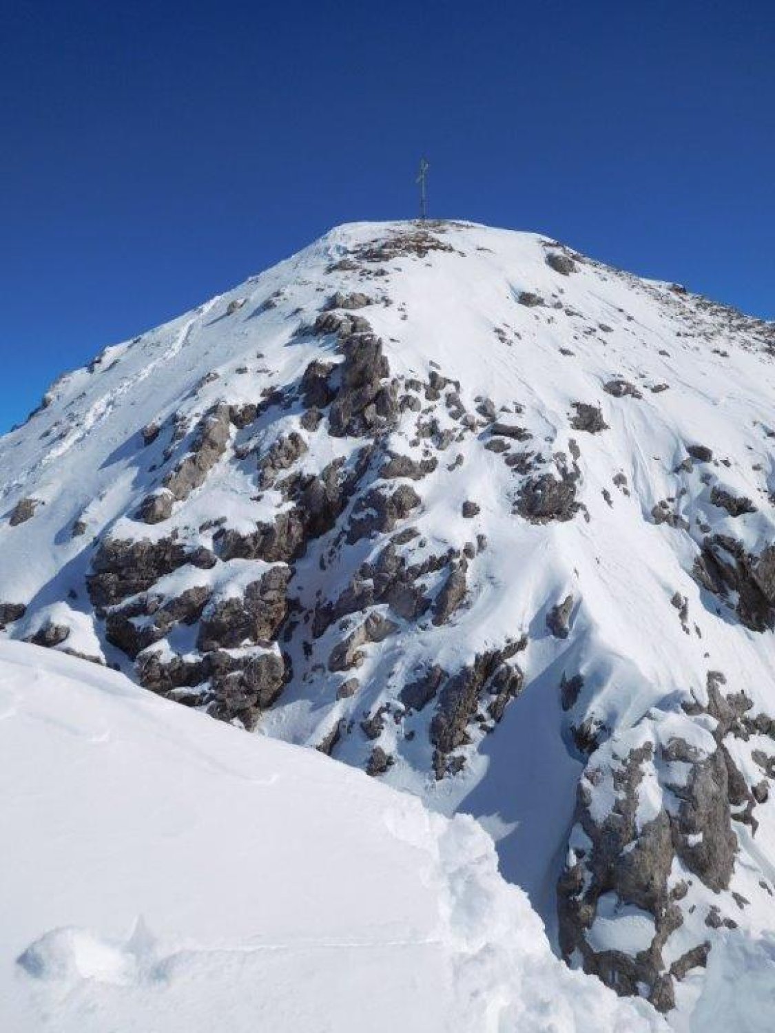 Gipfelaufstieg gespurt - Drahtseile sind meist frei.