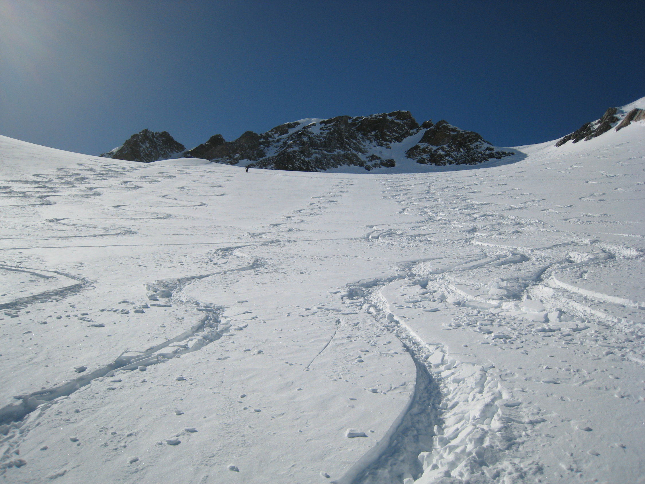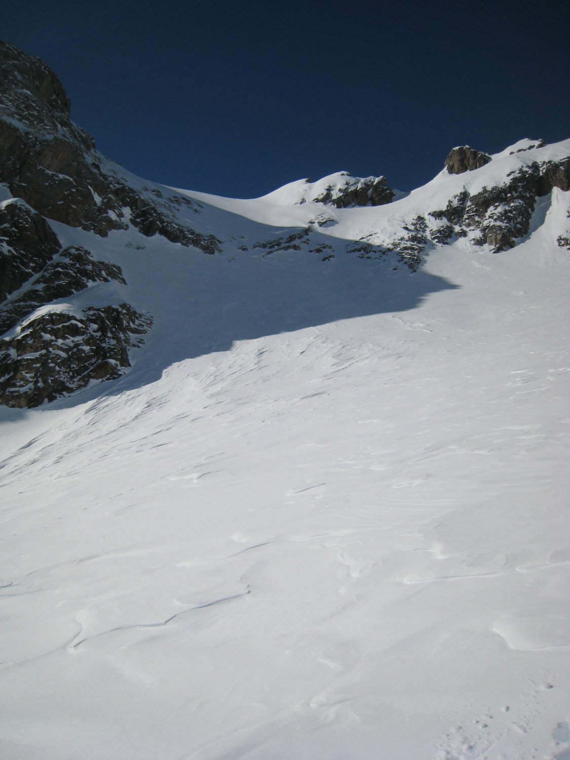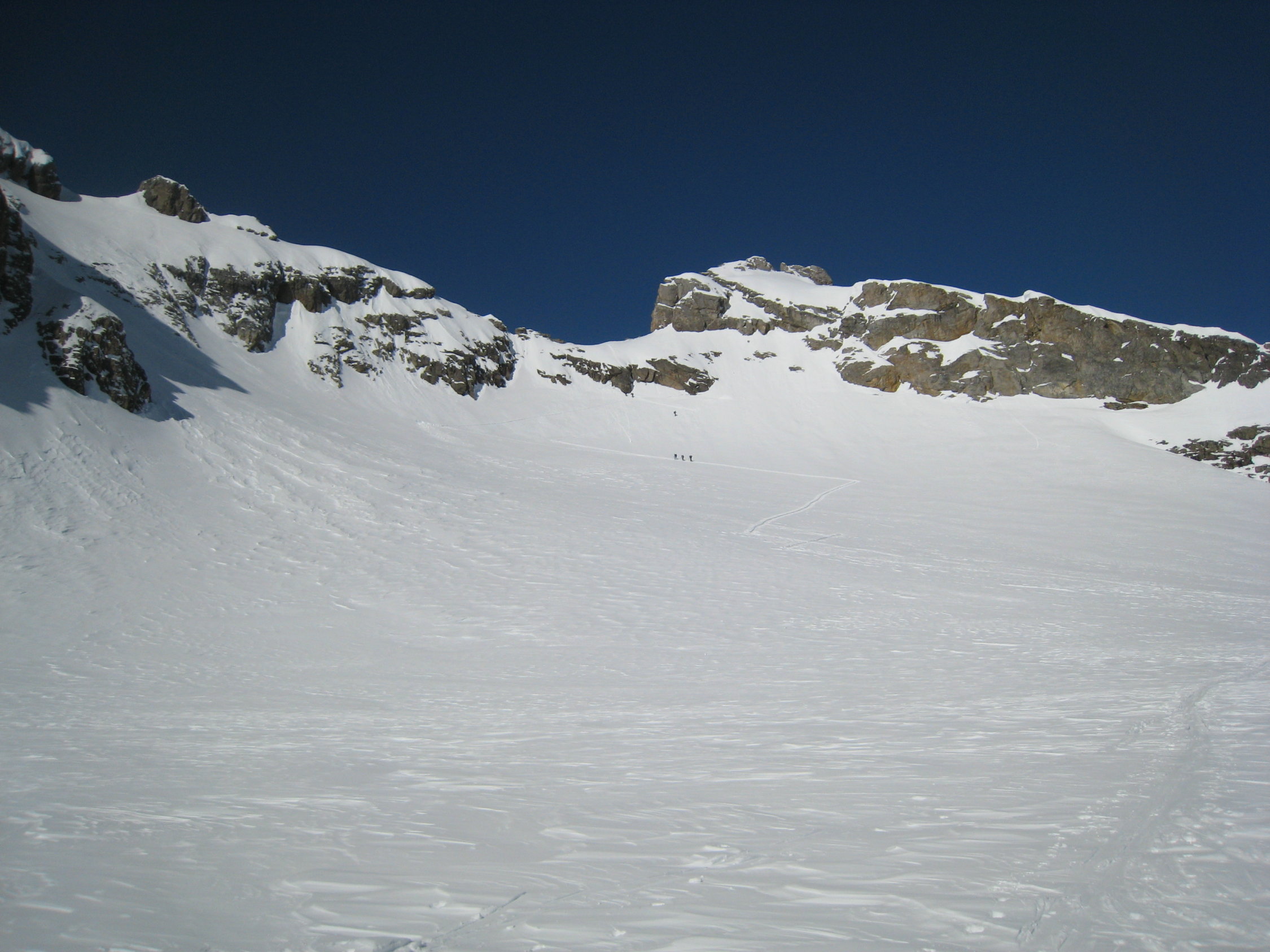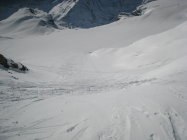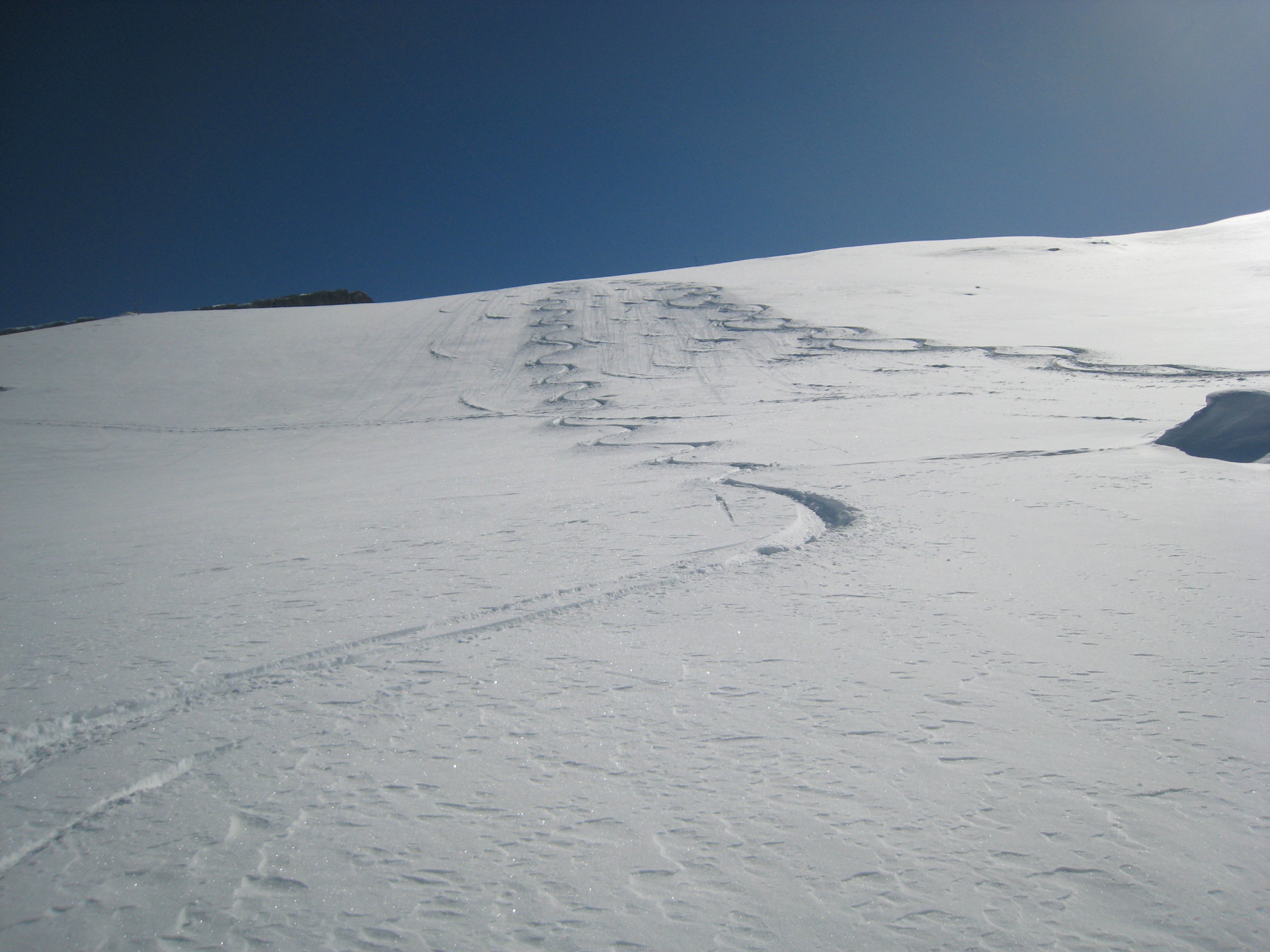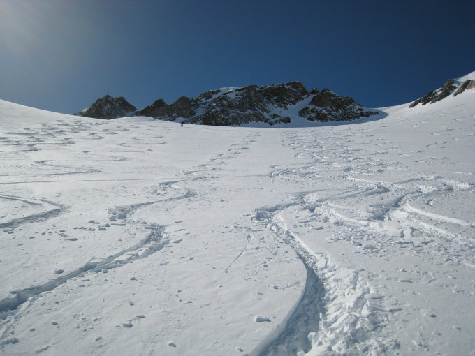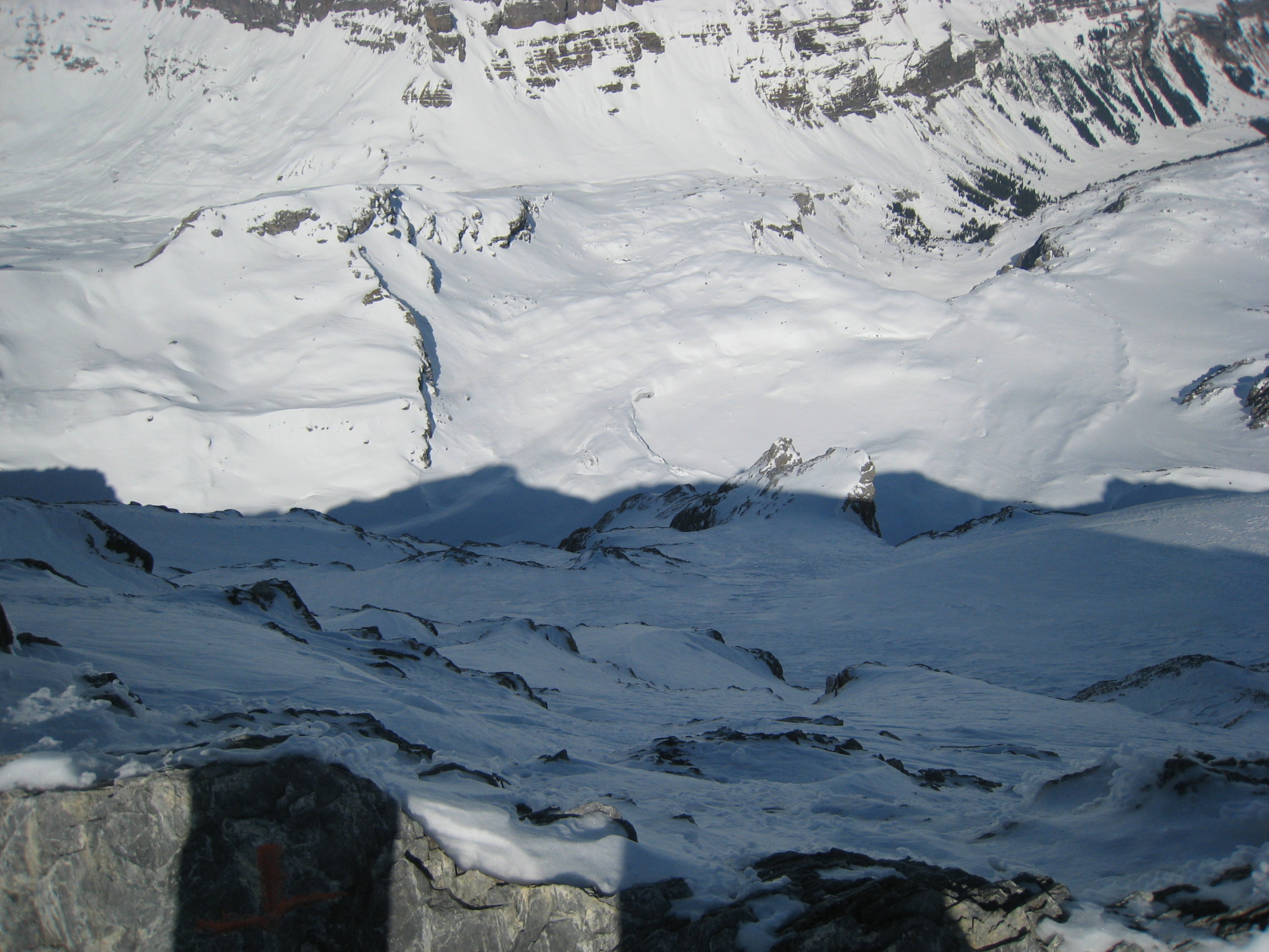 Mal so mal so. Sonne, windstill am Start. Bis Gemsfairen sehr gute Spur (leider ein wenig zugeweht), würde wohl auch in der Abfahrt gehen, ohne sich die Ski zu ruinieren. Am Gipfel kühl, aber nicht unangenehm. Abfahrt Ri Claridenfirn ein Satz mit x. Unten ebenfalls windstill und fast schon "warm". Bin dann zuerst Ri Clariden hoch, war auch eine super Spur angelegt. Abfahrt vom Clariden zurück Ri Tüfelsjoch stark windbearbeiteter Pulver, nicht so prickelnd. Dann noch Bocktschingel angeschaut, hat mich nicht angemacht: da fehlt einfach Schnee, es gibt so zwei kleine Durchschlupfe zwischen den Felsbändern (siehe Foto), aber bei so semi-lockerem Schnee ist das nicht der Hit. Ist noch unbefahren dieses Jahr, keine einzige Spur ausgemacht. Weiter Ri Tüfelsjoch (musste sogar 10min warten, weil heute doch ein paar Leute unterwegs), alles frei, gut begehbar. Abstieg ohne Steigeisen einwandfrei. Hatte dann auf mega-Powder gehofft...die Hoffnung starb zuletzt :(. Zwar den Spuren westlich des Roten Nossen nach (bin ich bisher noch nie so gefahren), aber da war dann entweder Pulver (oder gar Gletscher) oder windgedeckelter Pulver, mal komplett tragender Deckel und dann wieder *zack* eingebrochen und der Ski das Graben angefangen. Nicht so einfach zu fahren. Schade...der Wind, das himmlische Kind.