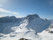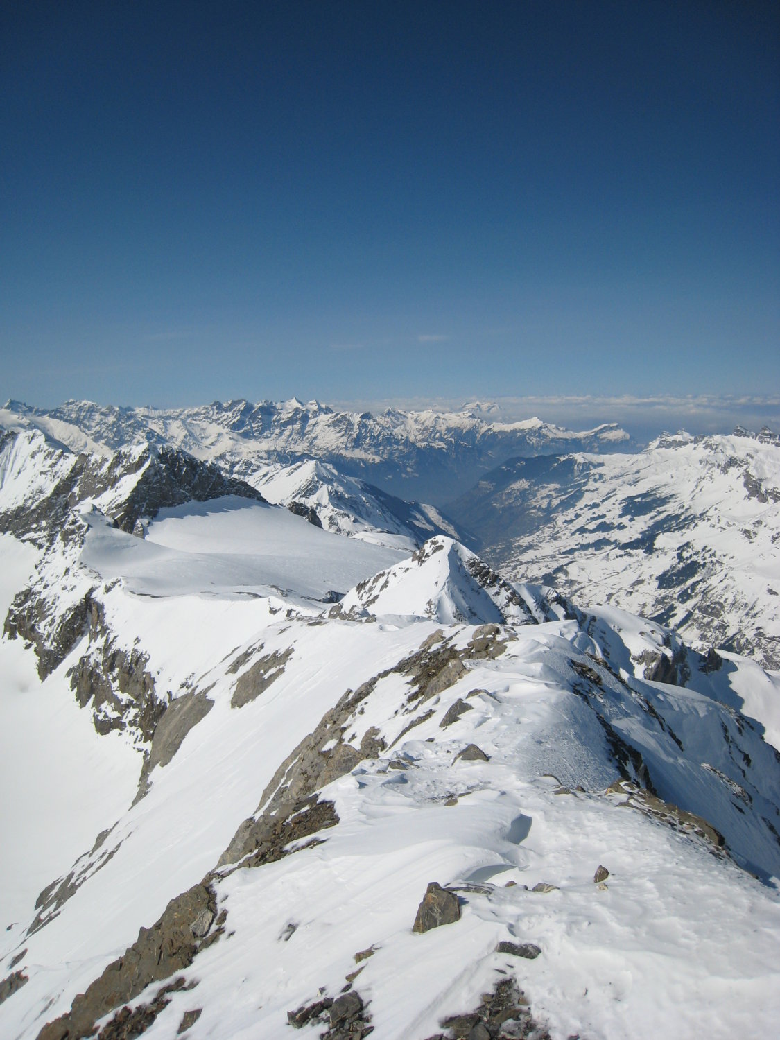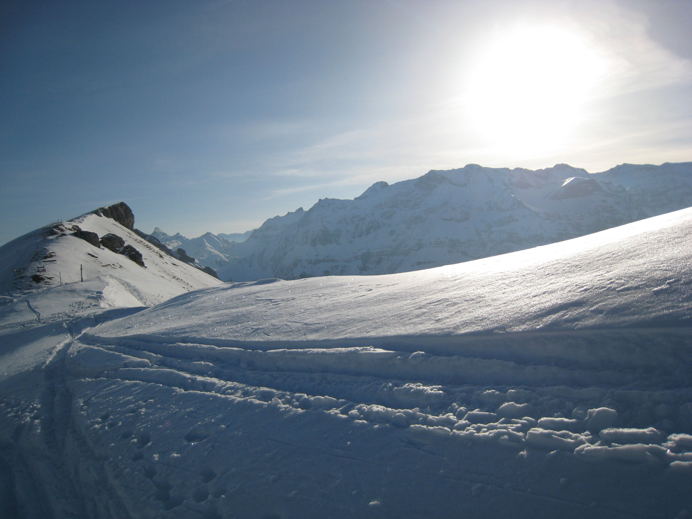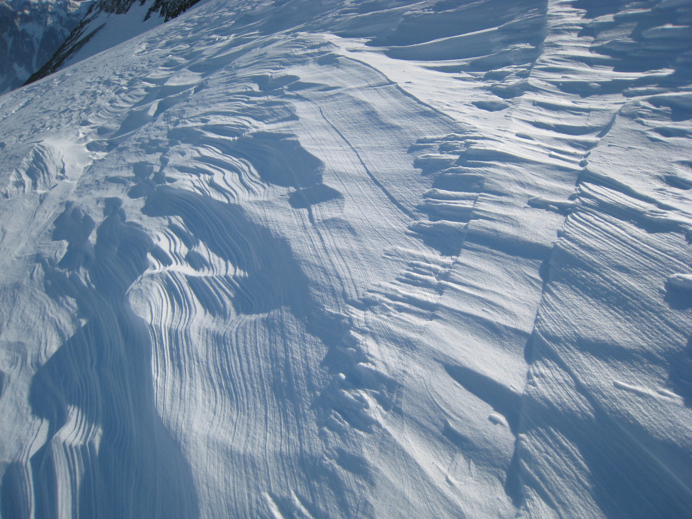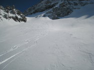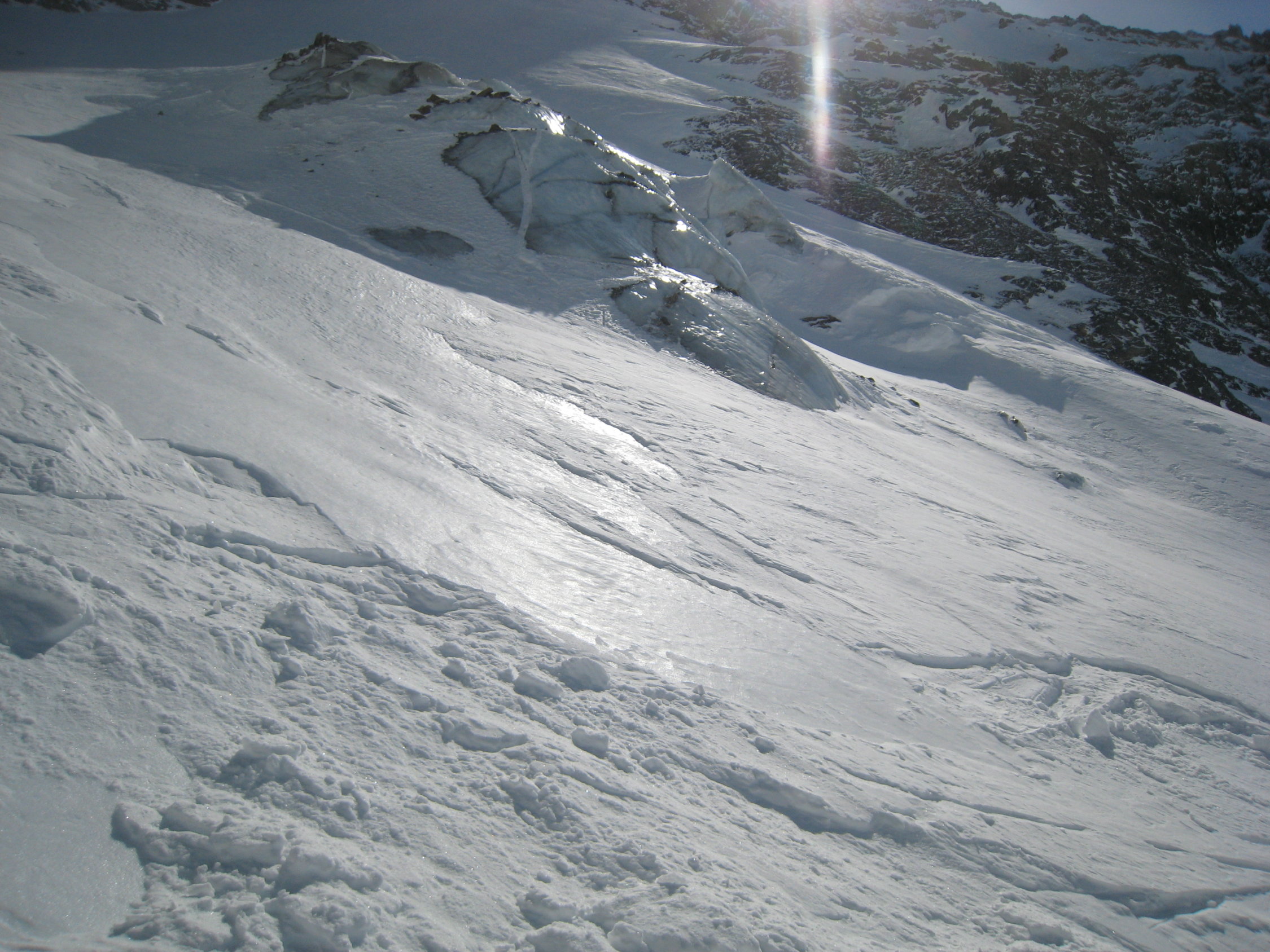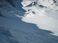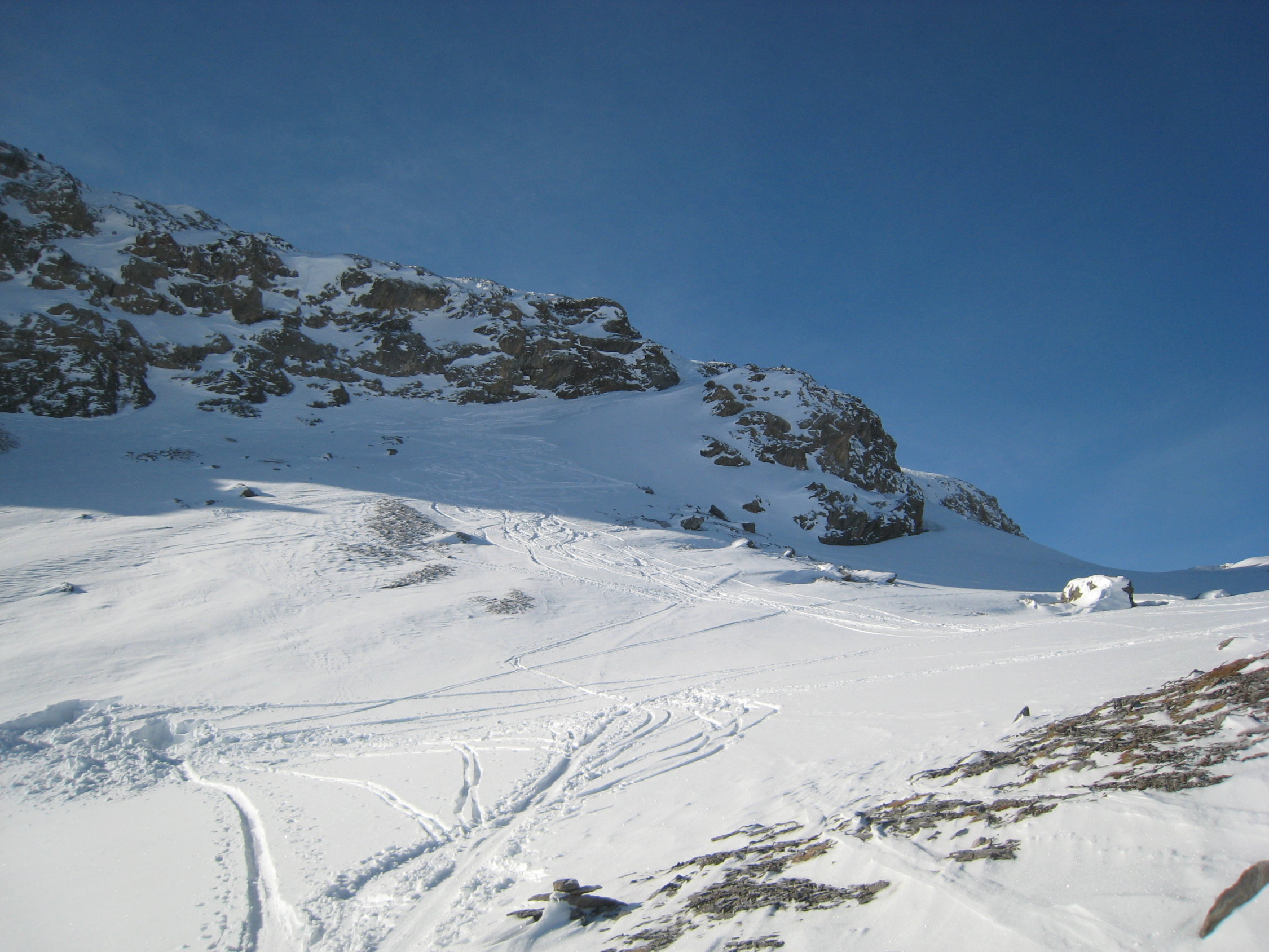 Mal so mal so. Sonne, windstill am Start. Bis Gemsfairen sehr gute Spur (leider ein wenig zugeweht), würde wohl auch in der Abfahrt gehen, ohne sich die Ski zu ruinieren. Am Gipfel kühl, aber nicht unangenehm. Abfahrt Ri Claridenfirn ein Satz mit x. Unten ebenfalls windstill und fast schon "warm". Bin dann zuerst Ri Clariden hoch, war auch eine super Spur angelegt. Abfahrt vom Clariden zurück Ri Tüfelsjoch stark windbearbeiteter Pulver, nicht so prickelnd. Dann noch Bocktschingel angeschaut, hat mich nicht angemacht: da fehlt einfach Schnee, es gibt so zwei kleine Durchschlupfe zwischen den Felsbändern (siehe Foto), aber bei so semi-lockerem Schnee ist das nicht der Hit. Ist noch unbefahren dieses Jahr, keine einzige Spur ausgemacht. Weiter Ri Tüfelsjoch (musste sogar 10min warten, weil heute doch ein paar Leute unterwegs), alles frei, gut begehbar. Abstieg ohne Steigeisen einwandfrei. Hatte dann auf mega-Powder gehofft...die Hoffnung starb zuletzt :(. Zwar den Spuren westlich des Roten Nossen nach (bin ich bisher noch nie so gefahren), aber da war dann entweder Pulver (oder gar Gletscher) oder windgedeckelter Pulver, mal komplett tragender Deckel und dann wieder *zack* eingebrochen und der Ski das Graben angefangen. Nicht so einfach zu fahren. Schade...der Wind, das himmlische Kind.