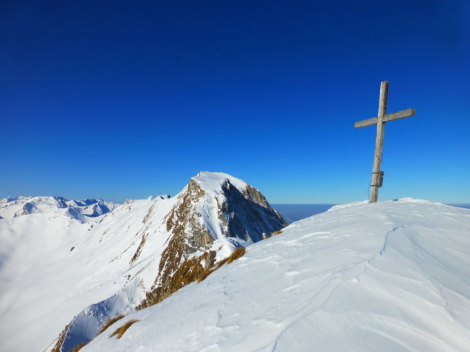 Bei leichter Bise sonnig und kühl. Hochnebel von ca. 1700m ansteigend. Gute Spur Richtung Chrummfadenflue, bis zum Einstieg dann z.T. gedeckelter Pulver. In der NE-Flanke guter Trittschnee (Aufstieg) bzw. griffiger Presspulver (Abfahrt). Mit der Sonneneinstrahlung kleine Lockerschneerutsche v.a. über dem Einstieg. Wohl in den letzten Tagen Abgang einer grösseren Grundlawine in der Girisberg E-Flanke.