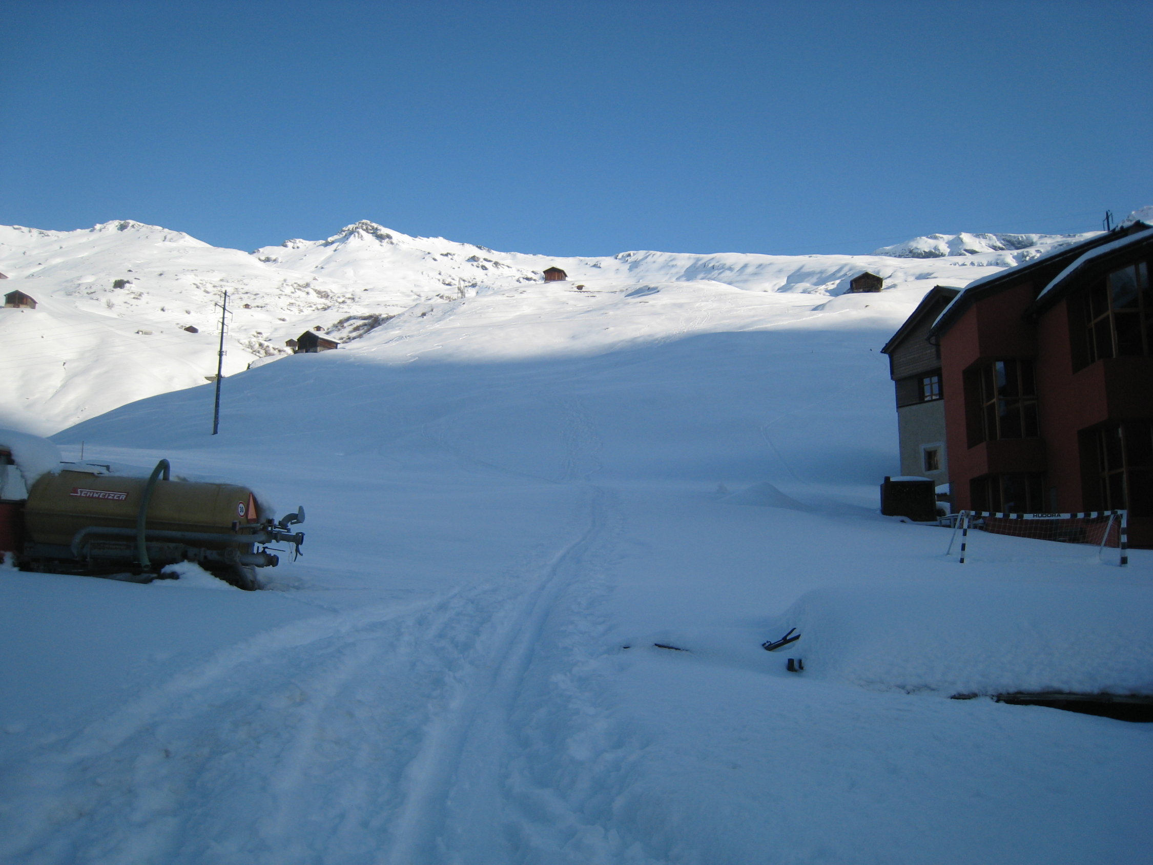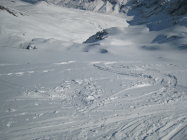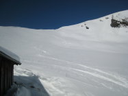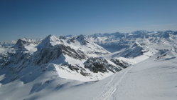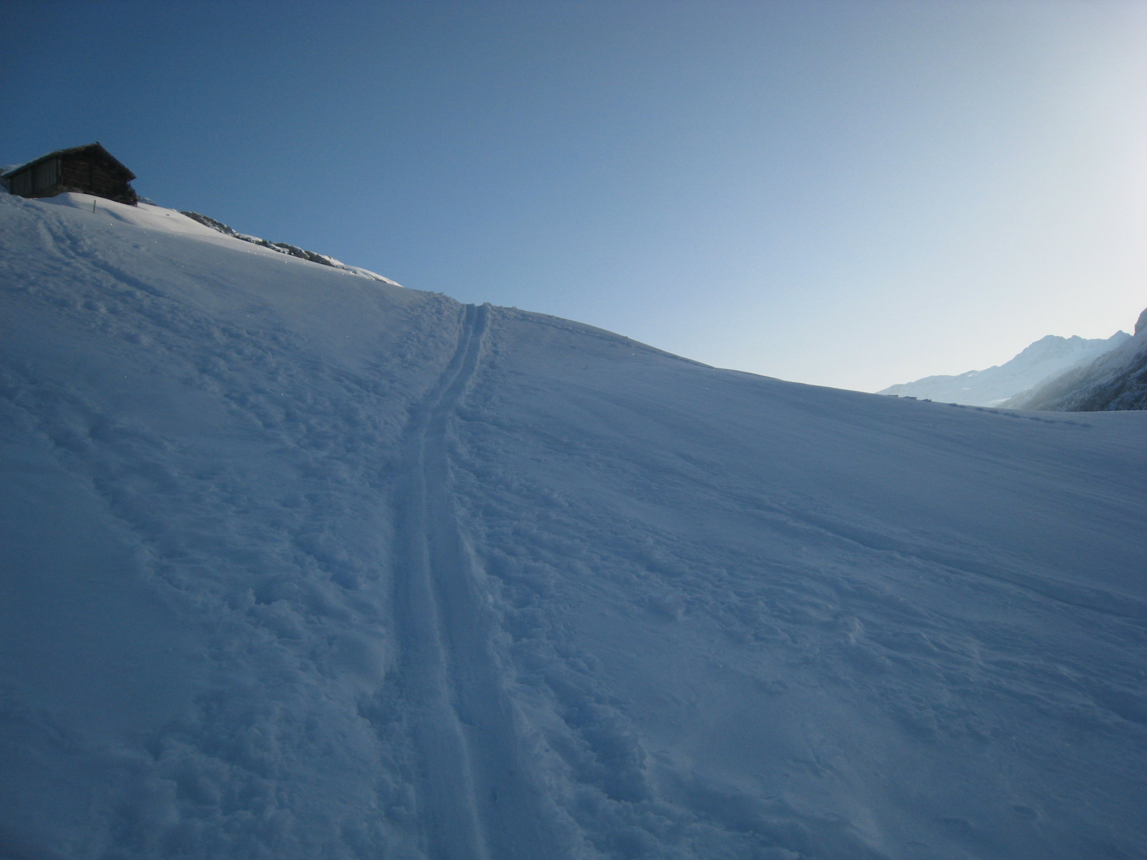 so schnell sind (Pulver-)Freud und (Deckel-) Leid beieinander (siehe Eintrag Chilchalphorn). Insgesamt aber doch ganz in Ordnung. Gute, gefrorene Spur von Nufenen aus, einmal kurz über den Bach und rauf die Hänge. Ab ca. 2600m ein schneidend kalter Nordwind bis zum Gipfel, abgesehen davon eher Frühlingsverhältnisse. Man muss wieder den richtigen Moment der Abfahrt abwarten, dann hat man fast schon Sulz, bzw. heute eher drehbaren Feuchtschnee, in Nordhängen Pulver. Heute ca. 20 Leute auf der Route unterwegs und noch welche von Route 325 oder 324 kommend - das wäre abfahrtstechnisch sicherlich schöner gewesen.