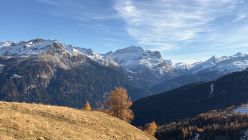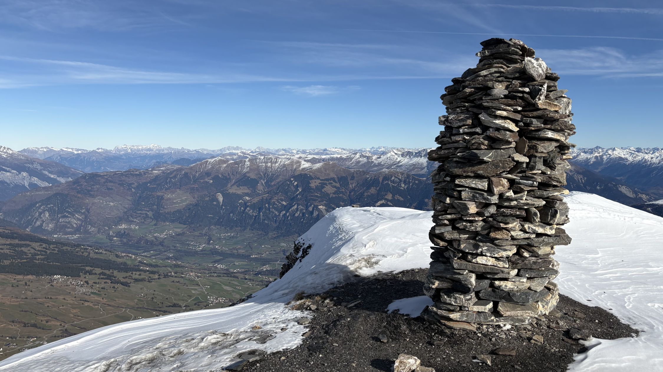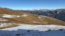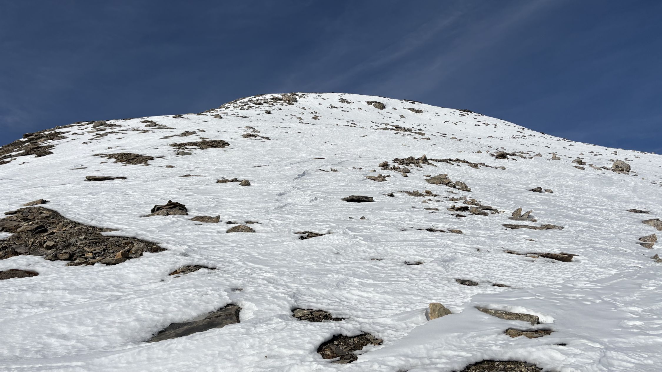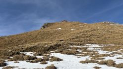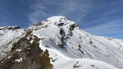 Für den Pintg im Aufstieg ab P. 2121 direkt den aperen und steilen Osthang hinauf. Felsriegel T5/ll.