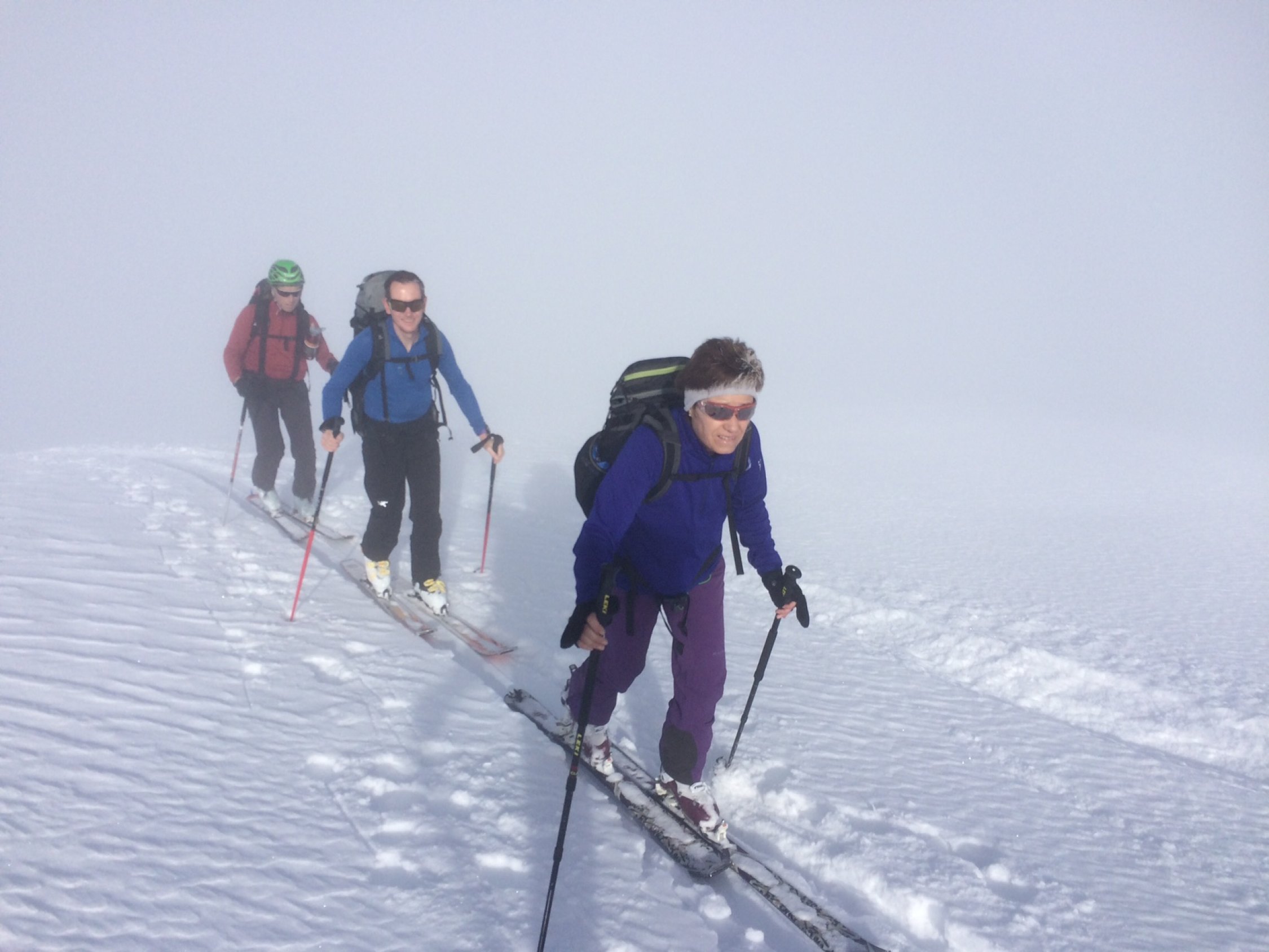 Die Abfahrt durch den Nebel war abenteuerlich, die Gruppe folgte der Aufstiegsspur und blieb dicht zusammen. Zeitweise war es nicht möglich, einen Bogen zu machen und man musste stehen bleiben, um die Ski in die andere Richtung zu drehen.