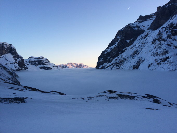 Ab Tierfehd liegt genug Schnee, so dass es keine Tragepassagen gibt. Start kurz nach 4 Uhr in Tierfehd. Gute Spur vorhanden. Schneerus mit bestem Trittschnee (keine Steigeisen nötig). Oberhalb der Schneerus Sonnenkontakt mit blauem Himmel. Weiter problemlos bis zum Gipfel. Durch eiskalten wehenden Wind sind wir nicht lange geblieben.