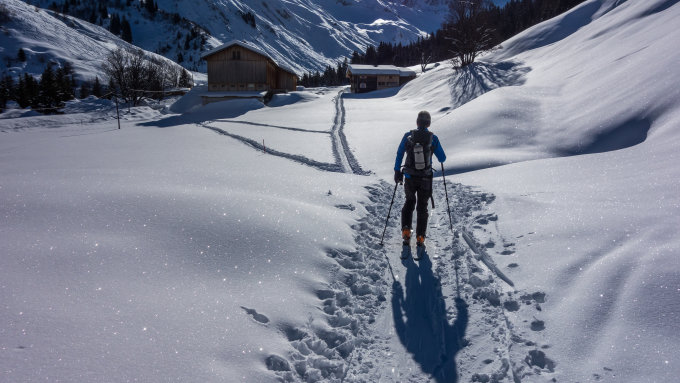 pulvrige Nordhänge stark verfahren, Südhänge noch nicht tragend