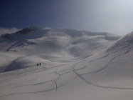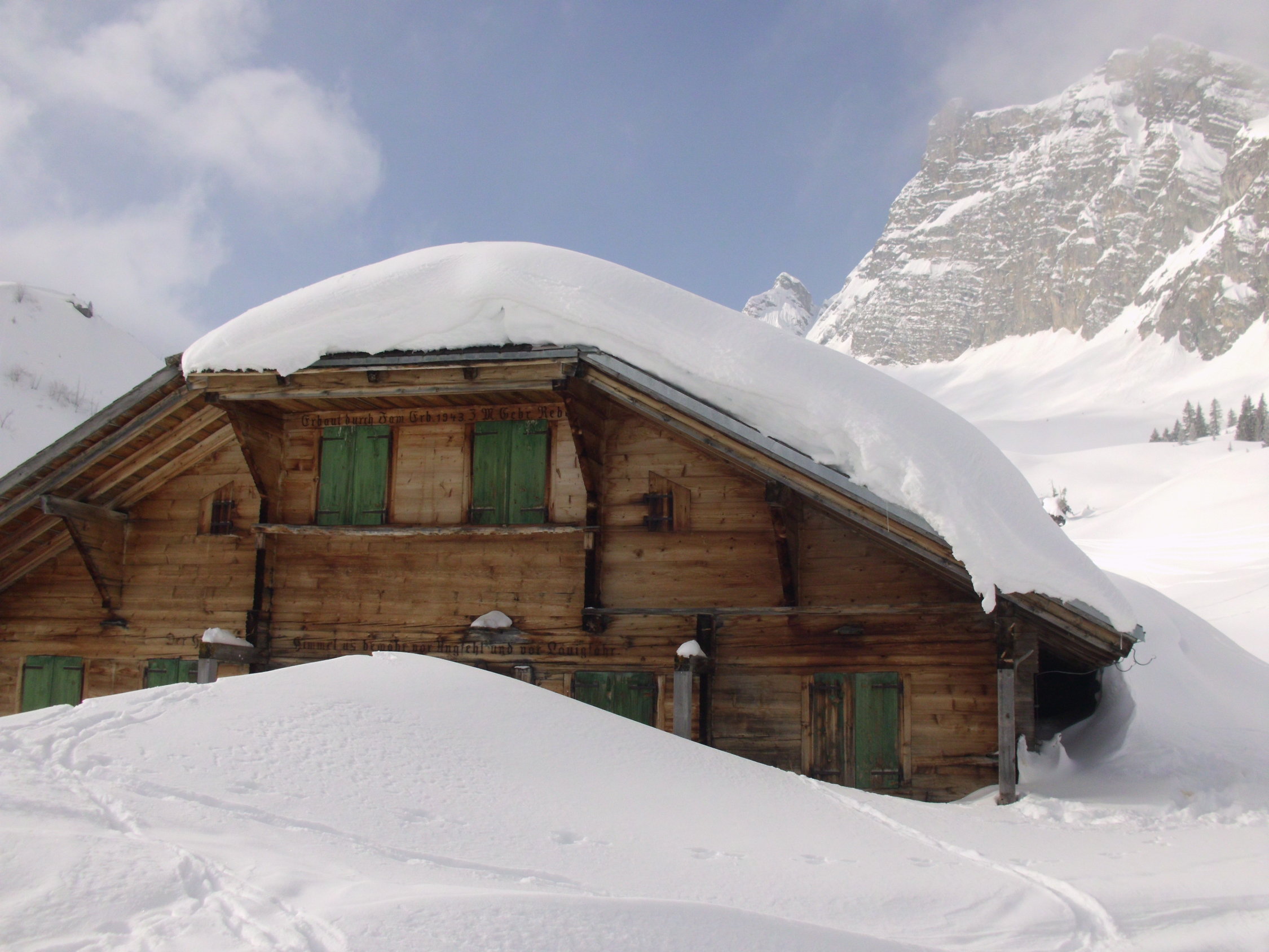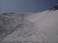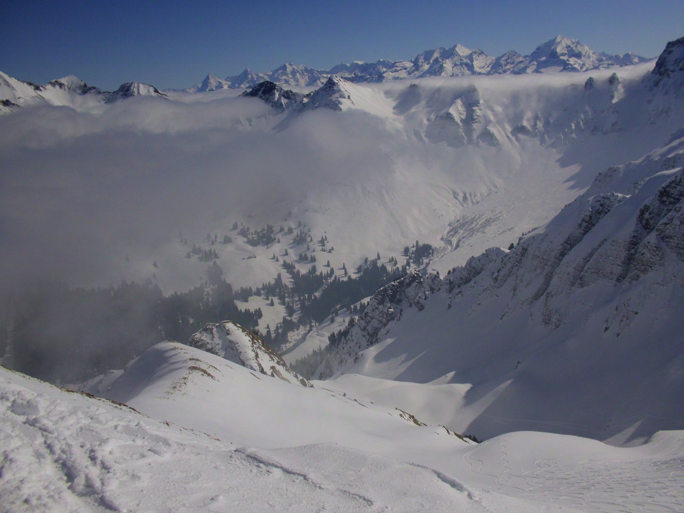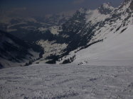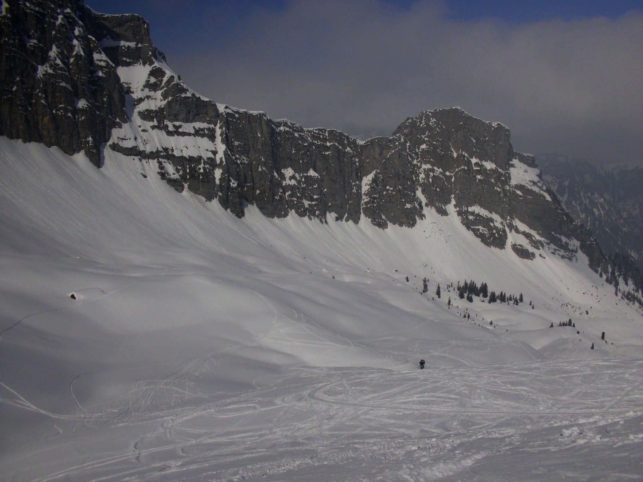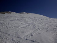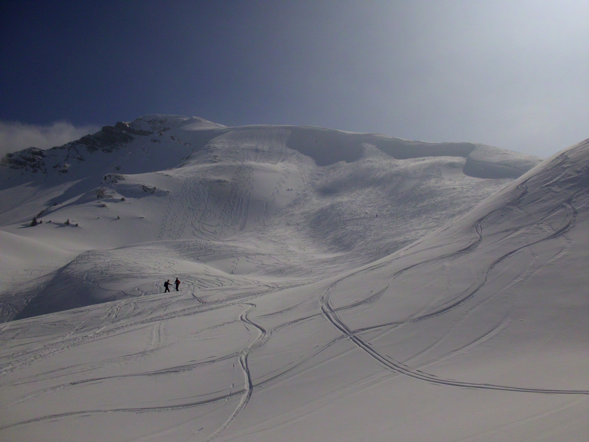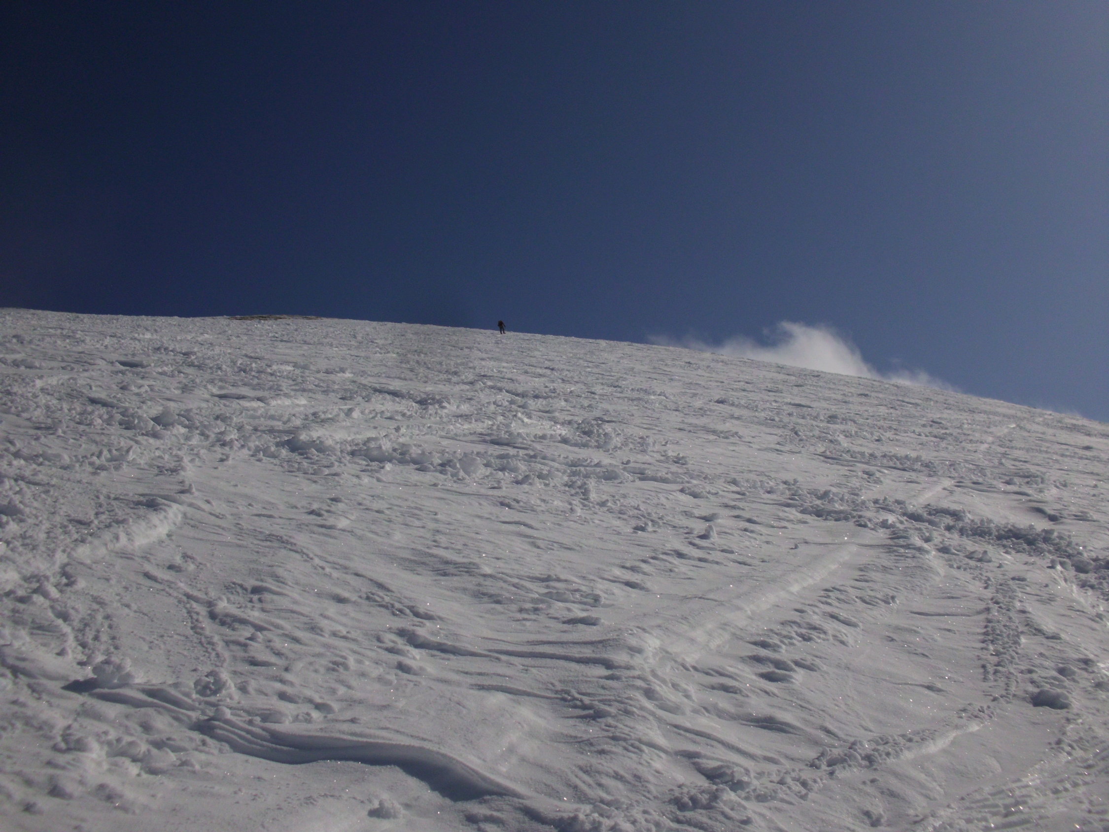 Im grossen und ganzen gute Verhältnisse, die Route ist von unten weg gut eingeschneit. Der Gipfelhang wie üblich stark vom Wind bearbeitet, dadurch etwas schwierig zu fahren...