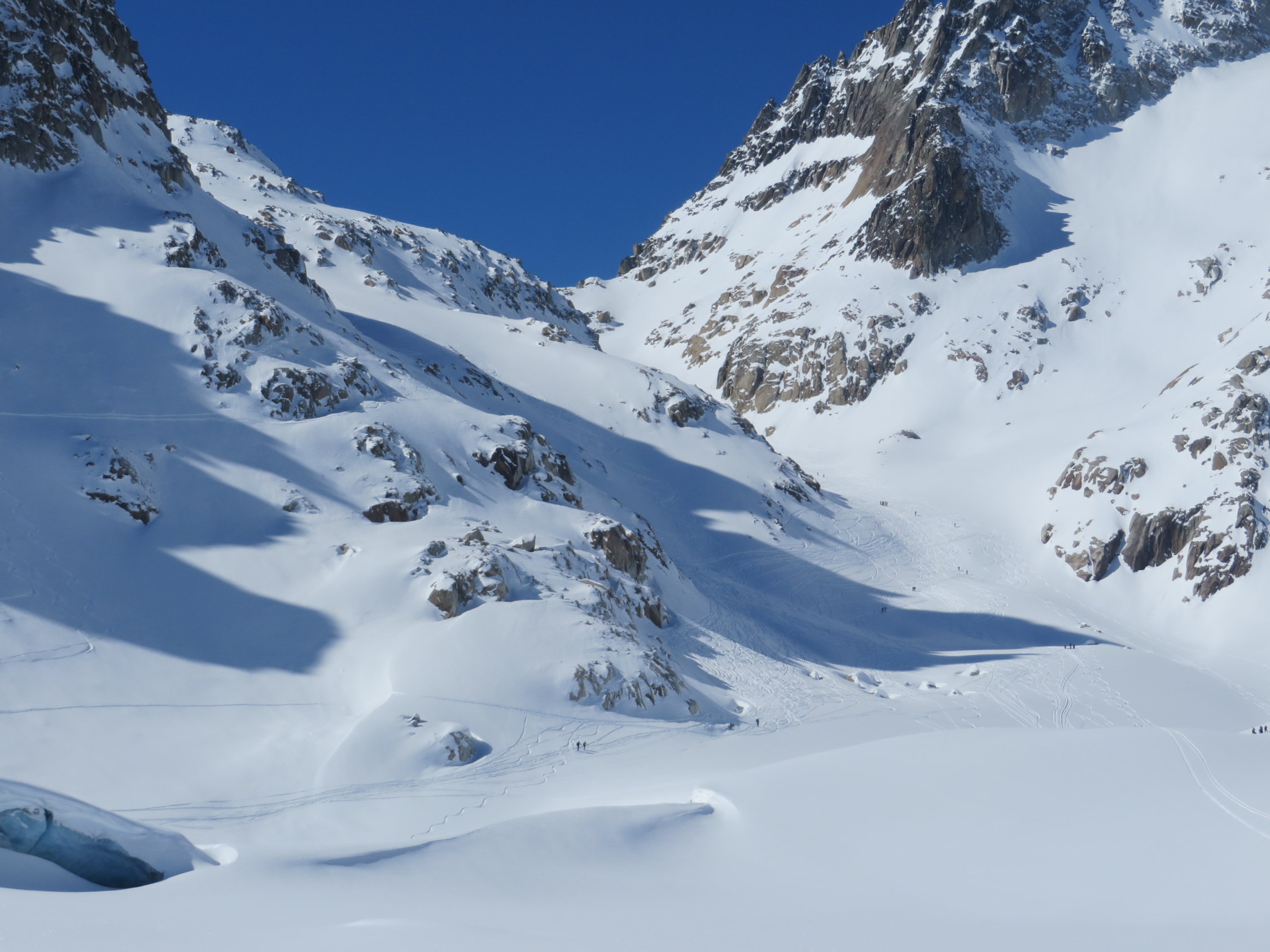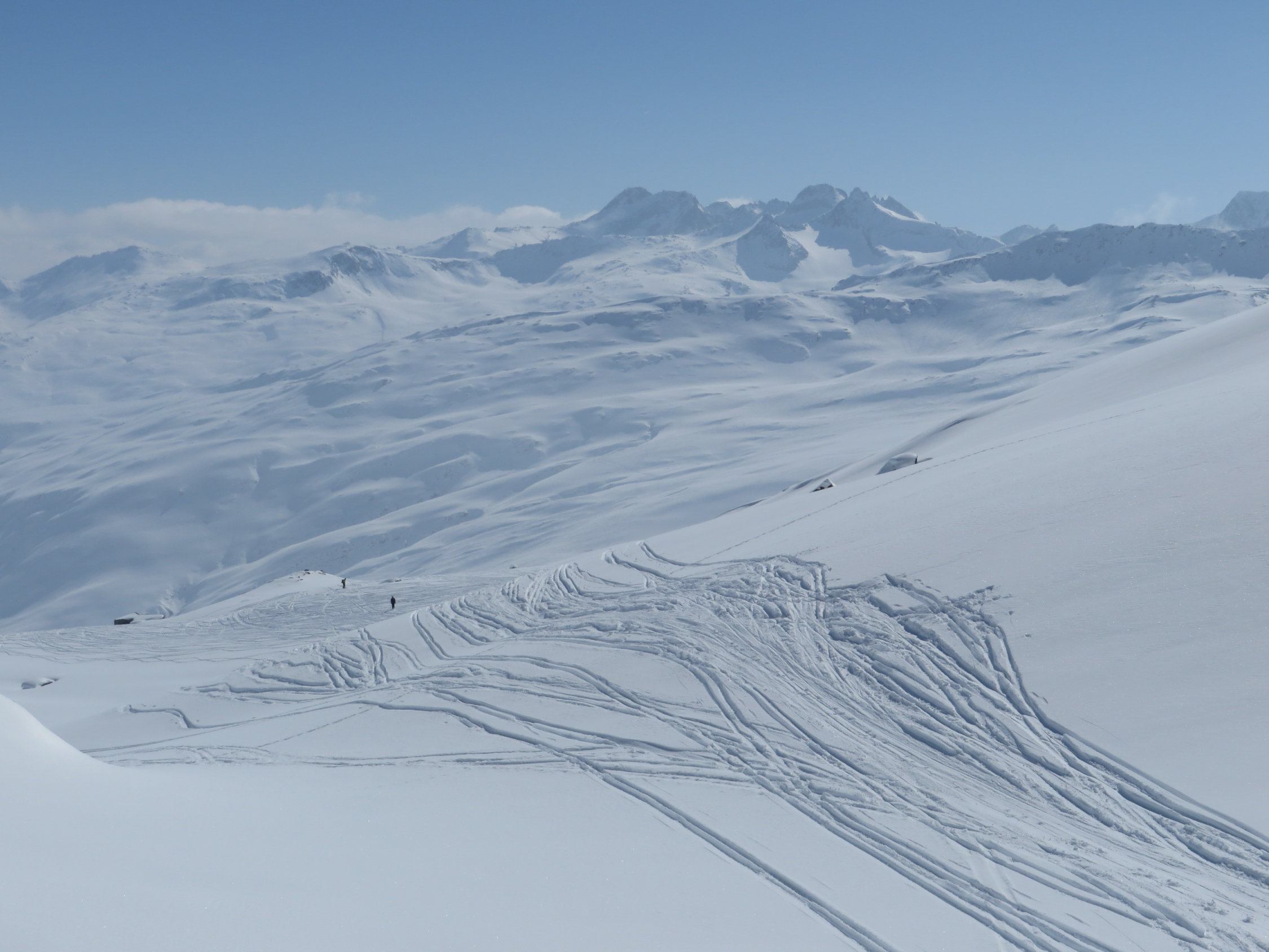 Vom Gipfel sind wir nördlich vom P. 2827m wieder runter, im verfahrtem Pulverschnee, Richtung Tiefengletscher gefahren.