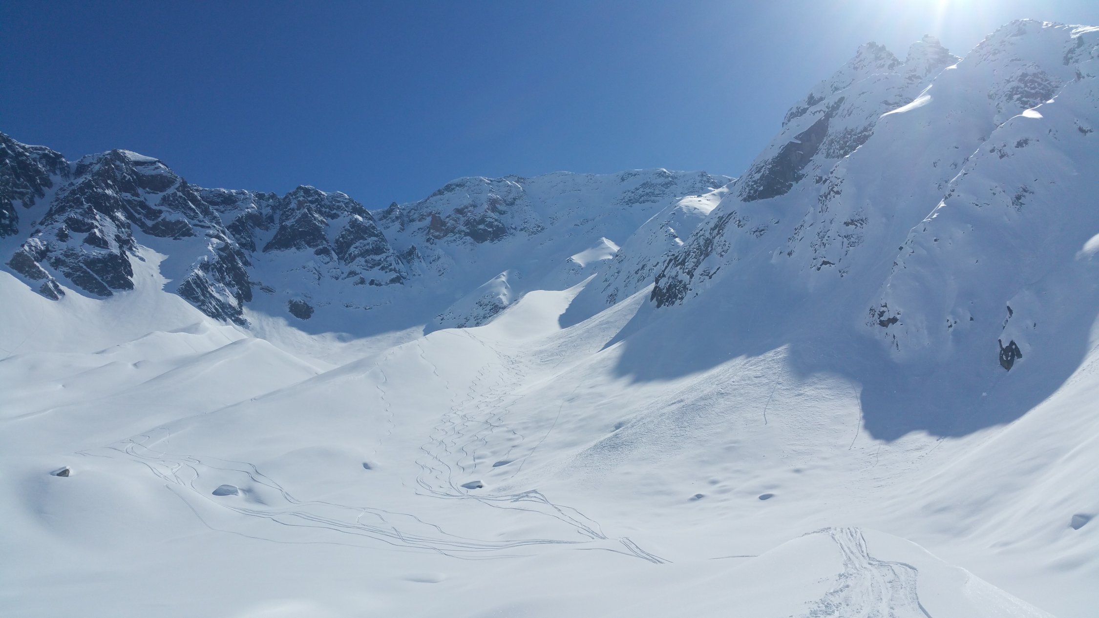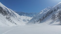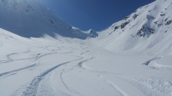 Aufstieg über die Route 560. Abfahrt dann durch das Merezebachtal. Im ganzen Tal an den Expositionen Nord bis Ost traumhafter Pulver.