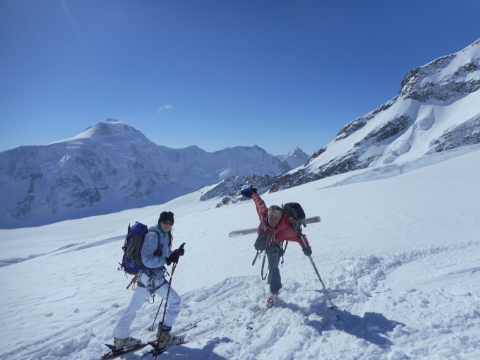 Abfahrt: Bei guter Routenwahl fand man immer wieder Pulverschnee Passagen. Kranzberg-, Aletsch- und Langgletscher sehr gut eingeschneit.