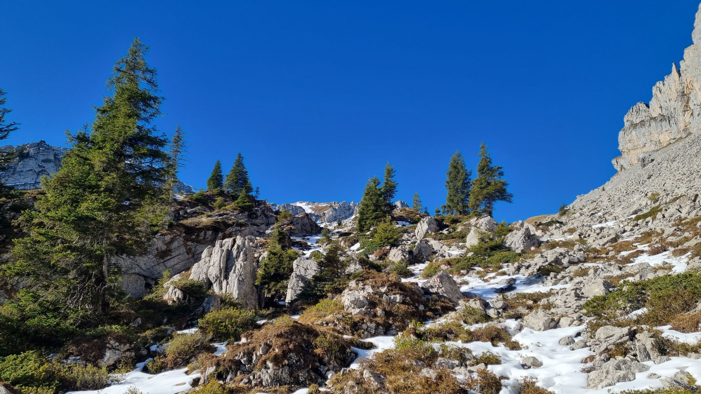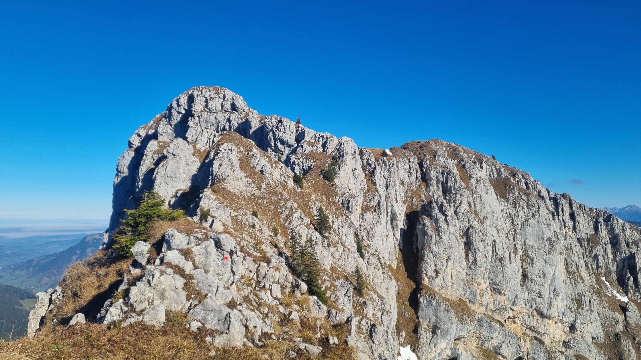 Schneefrei und angenehm bis über 1500m. Bei Ober Gumme eine geschlossene, aber gut passierbare Schneedecke. Hoch zur Ober Gummenegg dann schneefrei. Der Aufstieg zum Strick tw. mit Schnee, aber problemlos machbar, auch ohne Grödel. Der Weiterweg zum Heftiboden dann perfekt trocken und sehr schön. Wir sind wegen des doch überraschend vielen Schnees auf 1900m um den Turm herum gegangen und vom T3-Wanderweg halbwegs der Skiroute folgend hoch zur Hächle gestiegen, was im Nachhinein die falsche Entscheidung war. Zwar ging das auch, aber der Direktaufstieg nördlich von Turm 1919 wäre abgesehen vom 1. Hang wesentlich schneeärmer und genussvoller gewesen. Henusode. Der Übergang vom Vor- auf den Hauptgipfel ist spannend und gibt der Wamderung das gewisse etwas. Die Stelle lässt sich für Geübte trotz Schnee gut machen.