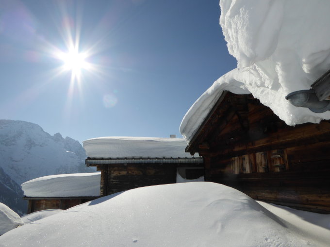 Die Abfahrt erfolgte in schönstem Pulver zur Faldumalp. Es hat noch Platz für eigene Spuren! Ab Faldumalp zur Alperschliessungsstrasse und über diese nach Ferden. Die Hänge entlang des Strässchens waren um 1330 schon recht aufgeweicht. Viel später sollte man dort nicht unterwegs sein.