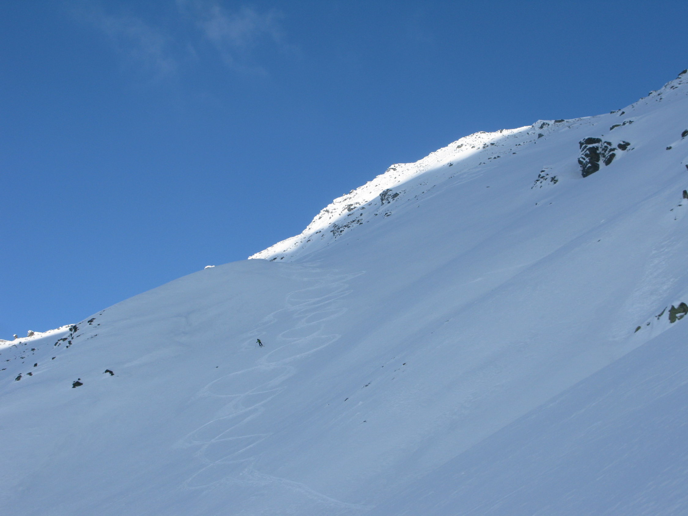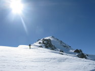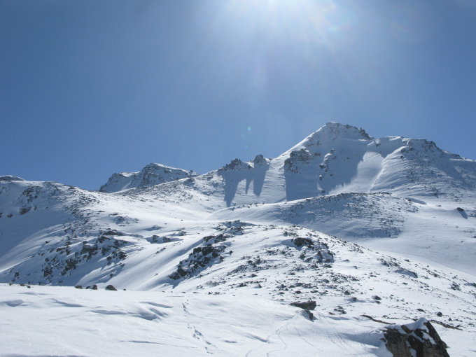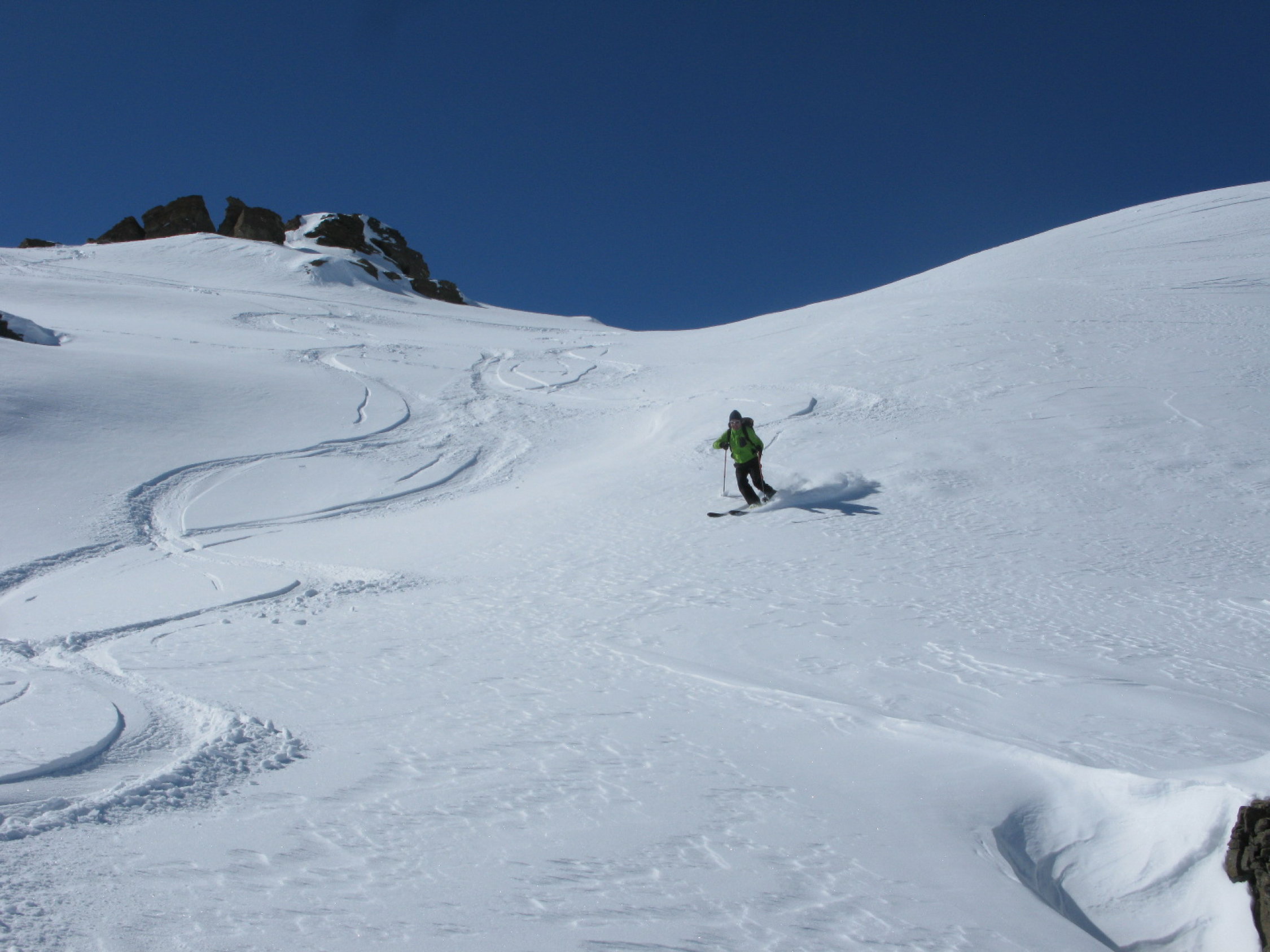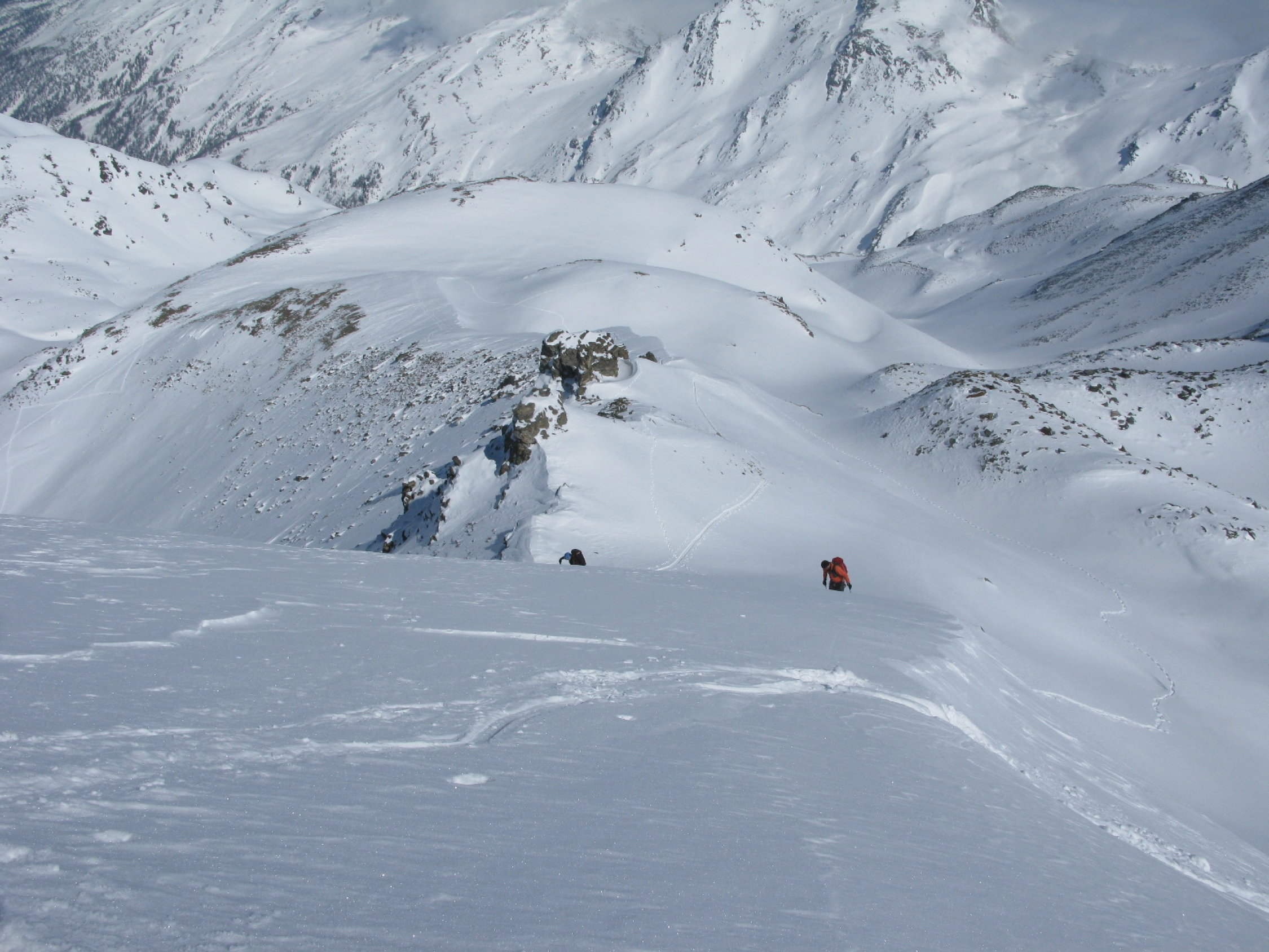 Der Tourenbericht vom gleichen Tag zum Mattwaldhorn gilt wirklich nur für den Schlussaufstieg. Die beschriebene Rundtour kann mit etwas Vorsicht in den abgeblasenen Übergängen (Steine) wohl noch längere Zeit gemacht werden.