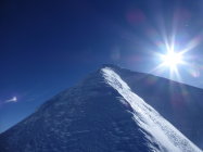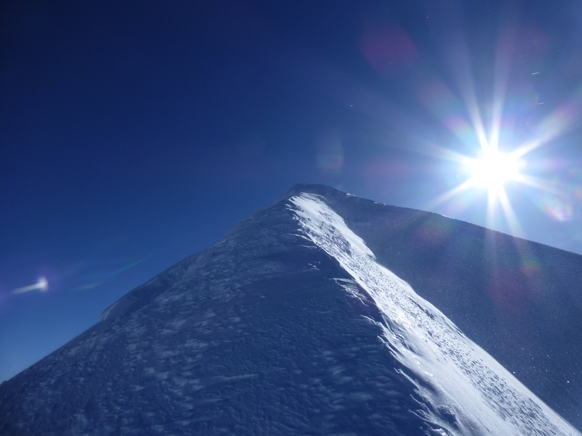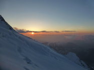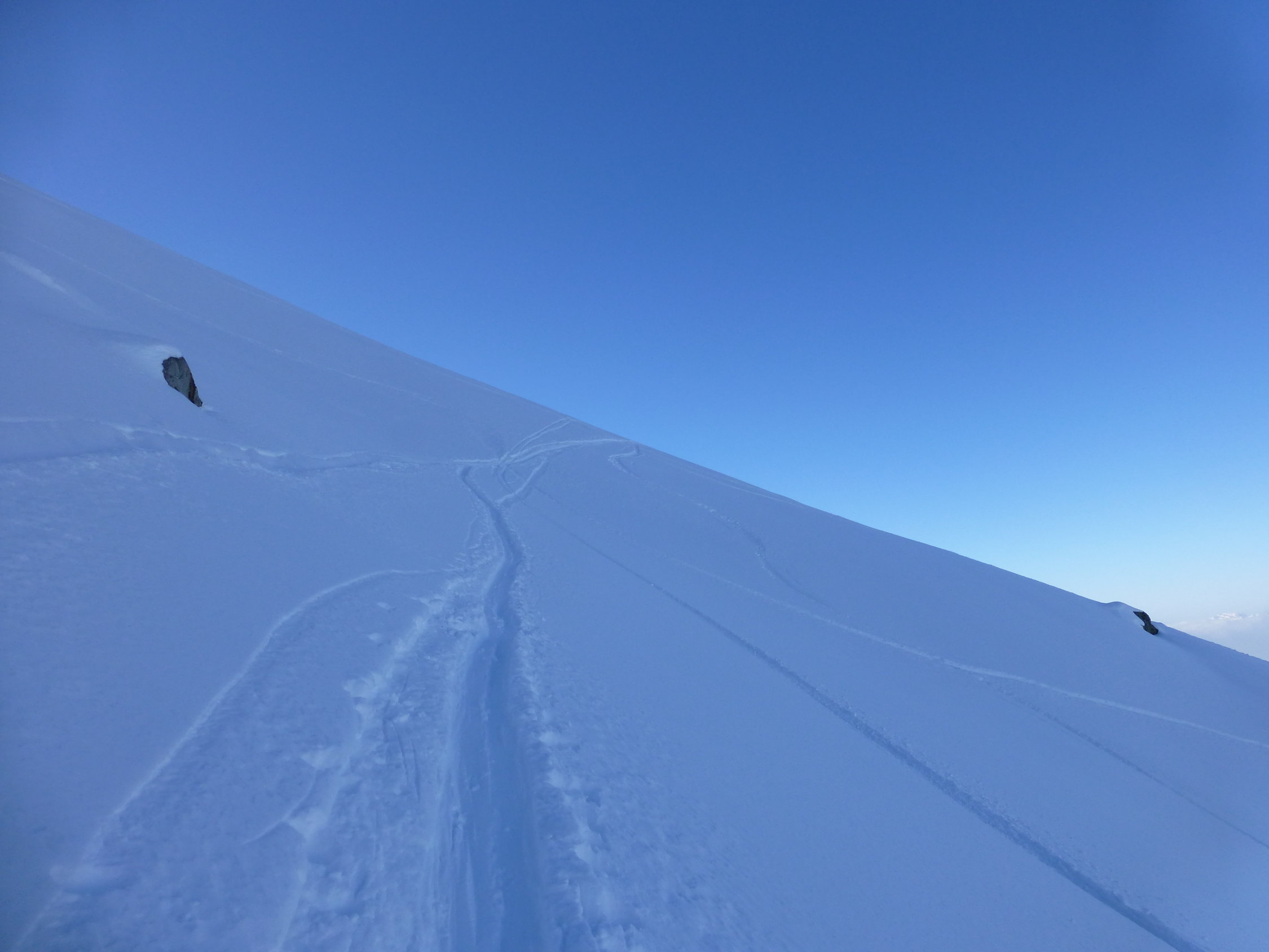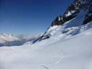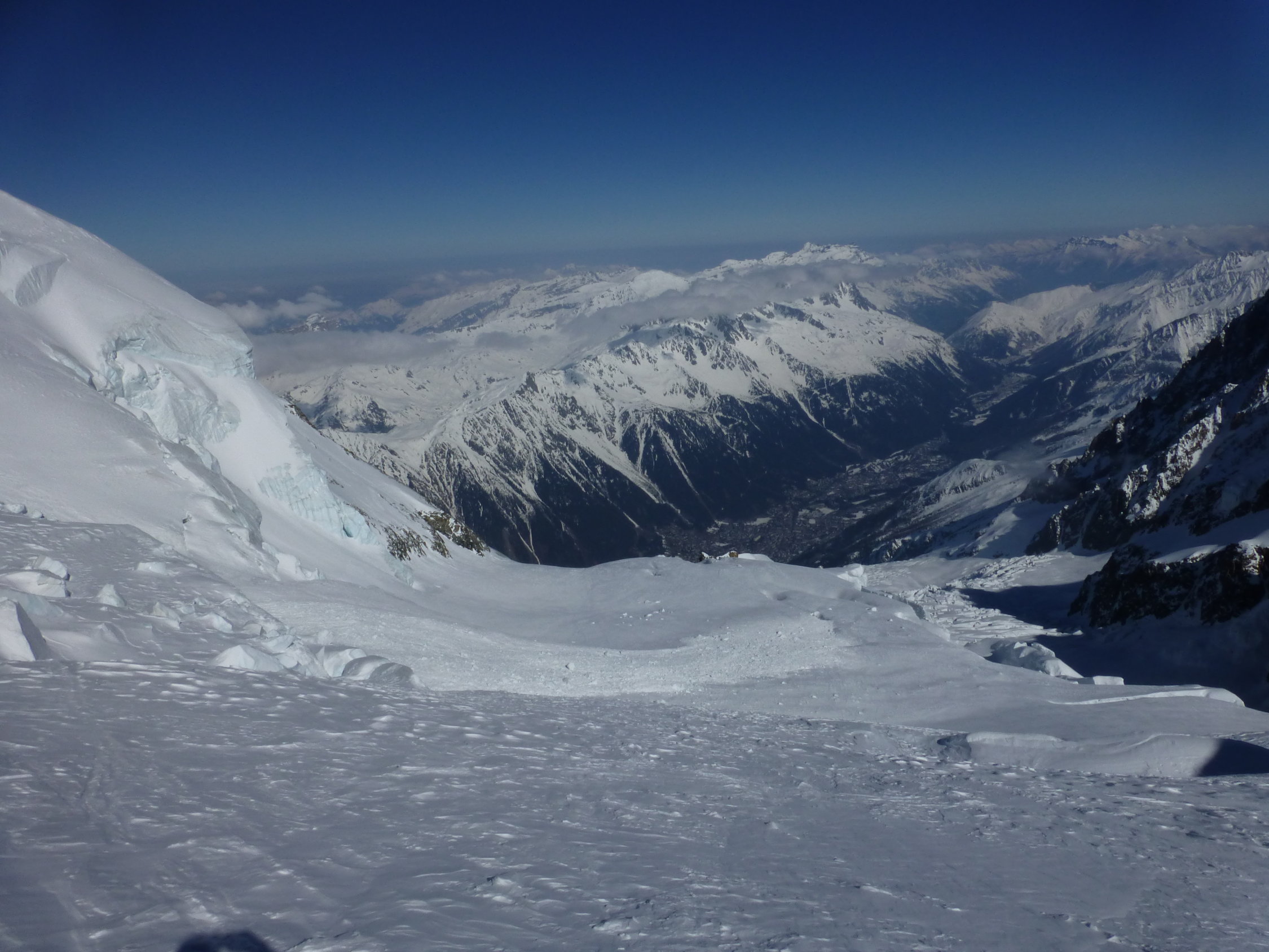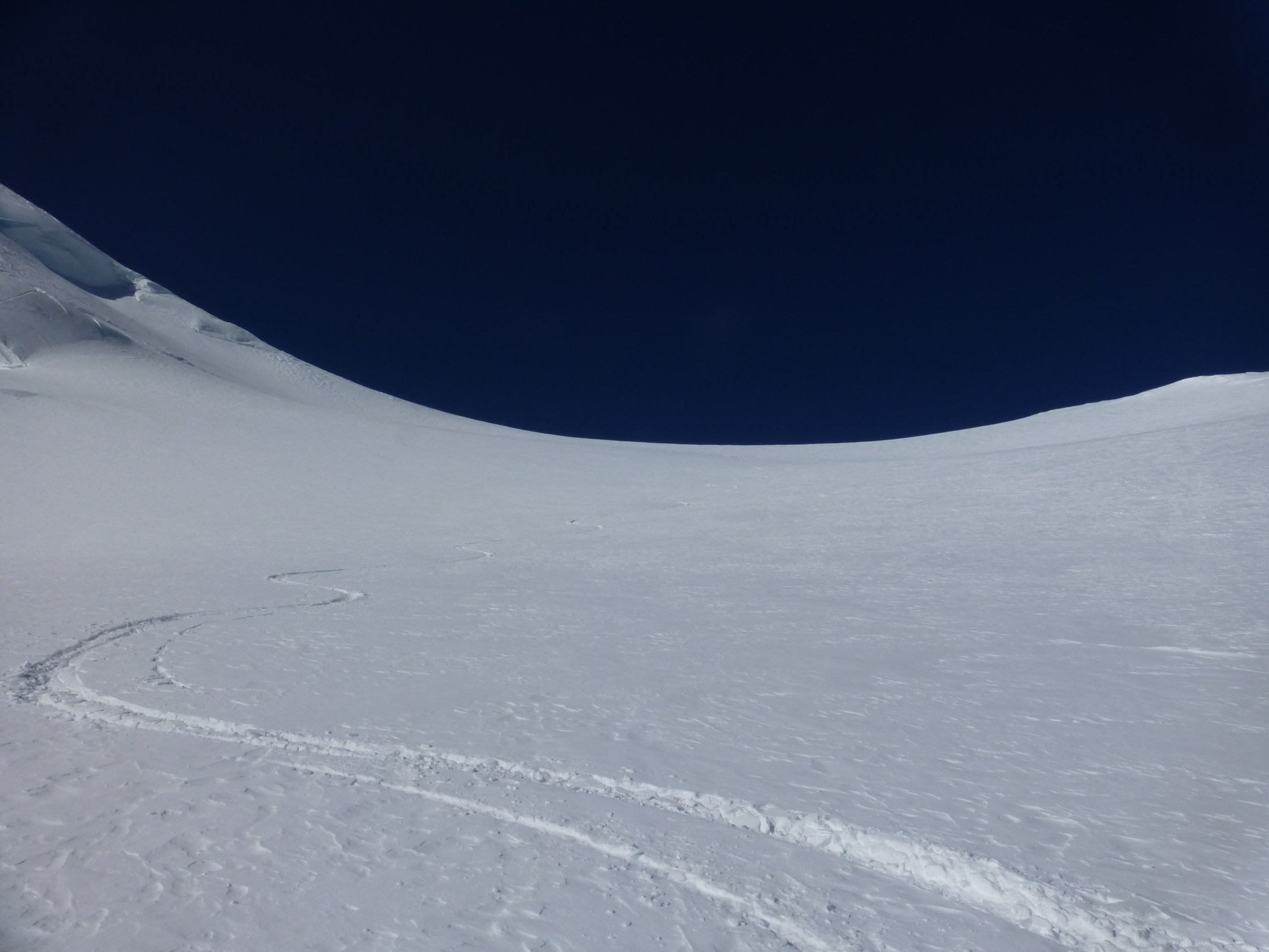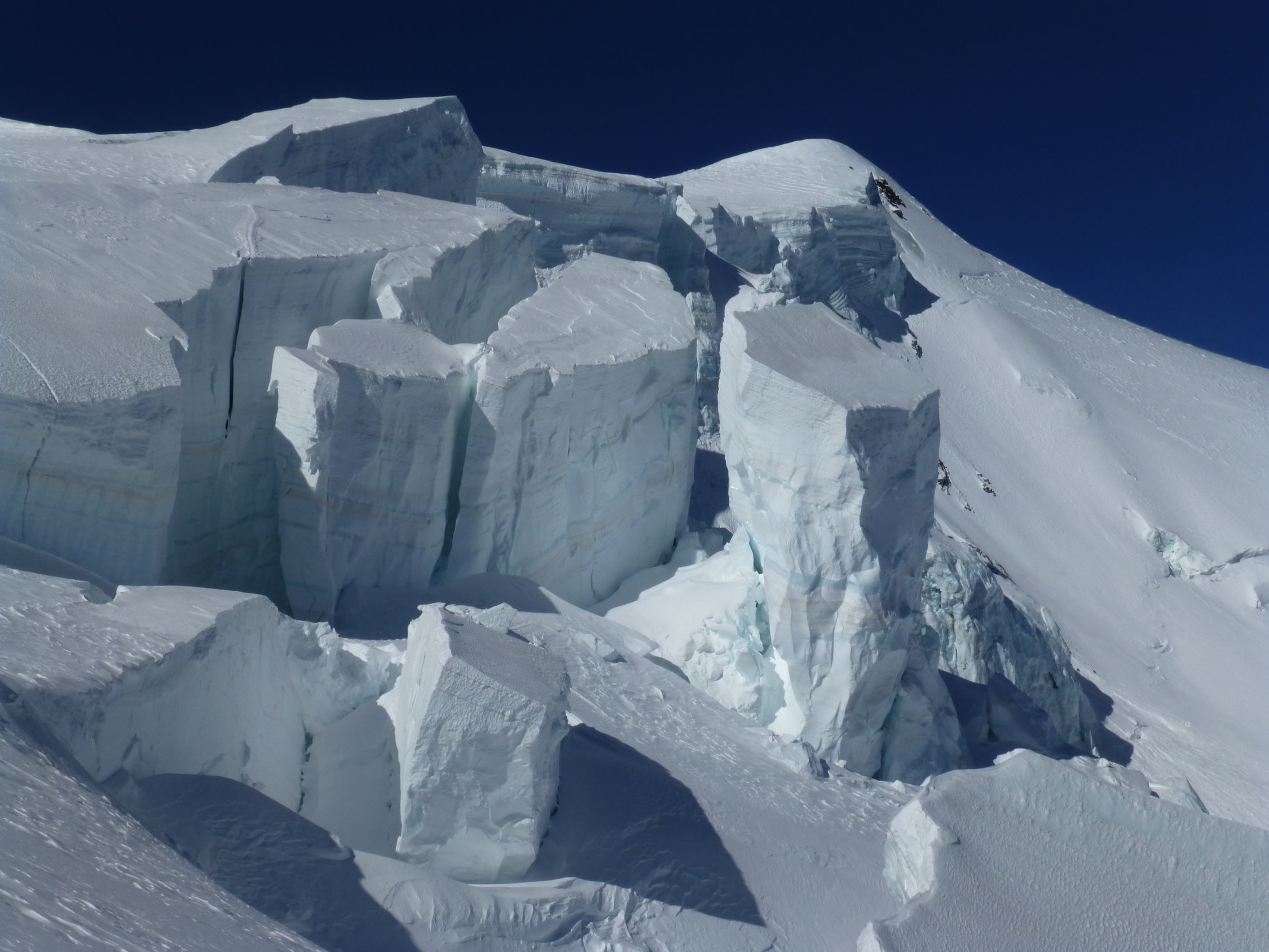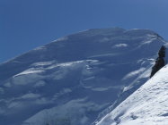 Top Verhälnisse am ganzen Berg. Gletscher sind sehr gut eingeschneit und es gab beste Abfahrtsverhältnisse, wie sie nicht allzu oft anzutreffen sind. Übergang Jonction (Gletscherbruch) problemlos, tief eingeschneit. Im Petit Plateau liegt eine große Lawine herunten und der nächste Eisturm wartet schon. Bosses Grat bis auf eine Stelle bestens gangbar. Diese hat es allerdings in sich. Auf 4600 m kommt man zu einer riesen Querspalte, die den Grat unterbricht. Hier heißt es reinsteigen in die Spalte und kurz rauspickeln (ca. 2,5 m 80°). Oder man quert ziemlich weit links in die Nordflanke und umgeht diese Spalte, was aber aufgrund des Tiefschnees und des eisigen Höhenwinds zu zeitaufwendig erschien. Am Vortag waren 3 Franzosen über Voi Royale am Gipfel, diese haben eine perfekte Spur durch den Bosses Gletscher gelegt. Leider war die Spur dann ab 3500 m verblasen, sodass eigenes "Kneten" gefragt war.