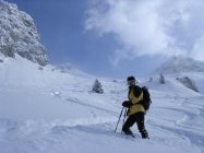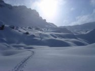 Aufstiegsspur bis Butzenboden (1900m/M) darüber war eigene Spuranlage im knietiefen Pulverschnee gefragt. Zunehmender Südwind; am Grat mässig-stark; tiefe Temperatur. Starker Dunst, typisch für Tiefdruck bestimmtes Schönwetter. Für die vorhandene Pulverschnee-Tiefe ist oberhalb 1900m/M die Neigung entlang der Abfahrtsroute zu gering. Aufstiegspur weitgehend zugeweht.