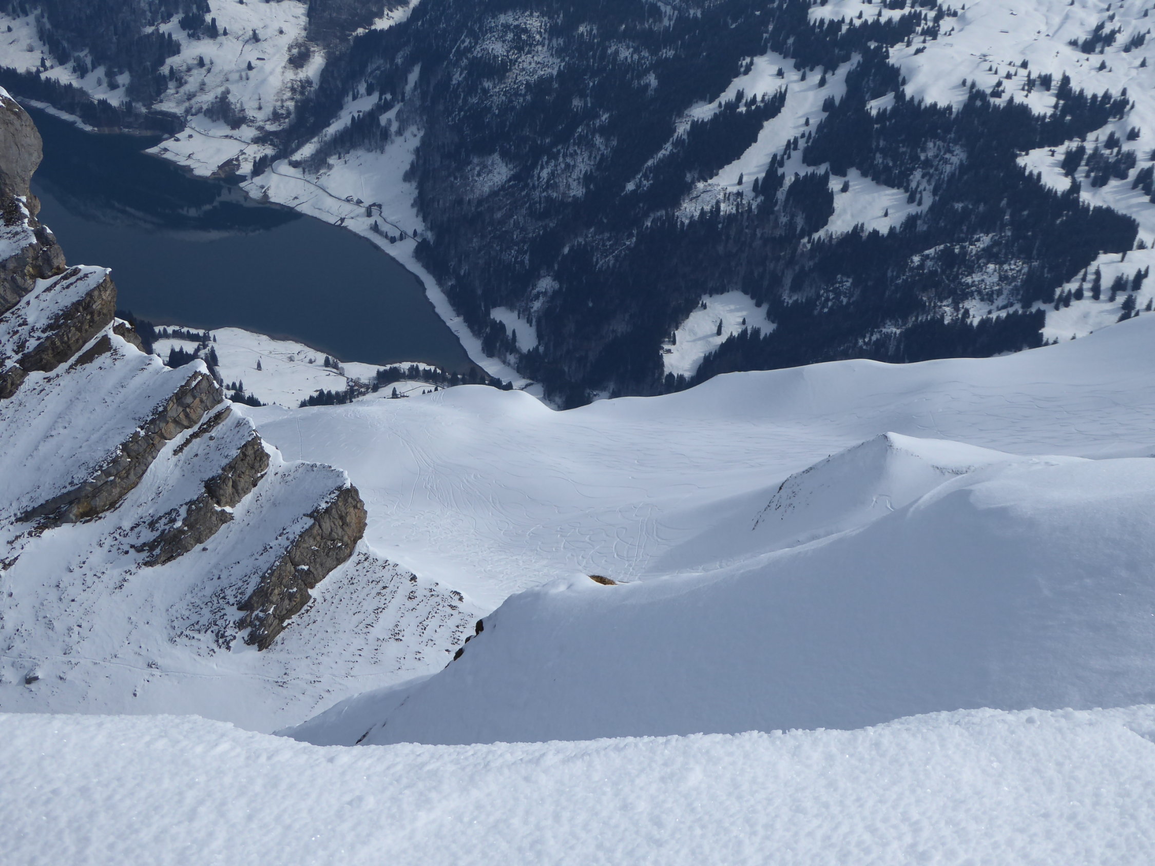 Heute herrschten am Fluebrig wunderbare Verhältnisse! Dank Start bereits um 7 Uhr war während der ganzen Tour vorwiegend sonniges Wetter. Die Aufstiegsspur war auch in den Steilhängen in bemerkenswert gutem Zustand – wahrscheinlich vom Wochenende her, wo offenbar einige Gruppen am Berg waren, bei der Abfahrt aber (bewusst oder unbewusst) die Aufstiegsspur schonten. Danke in jedem Fall! Es gab auch noch tolle unverfahrene Hänge, mit Pulver bis auf ca. 1400 m hinunter. Weiter unten war der nachts gefrorene Schnee bis ca. 10 cm tief aufgeweicht und auch sehr gut zu fahren – bis zum Parkplatz!