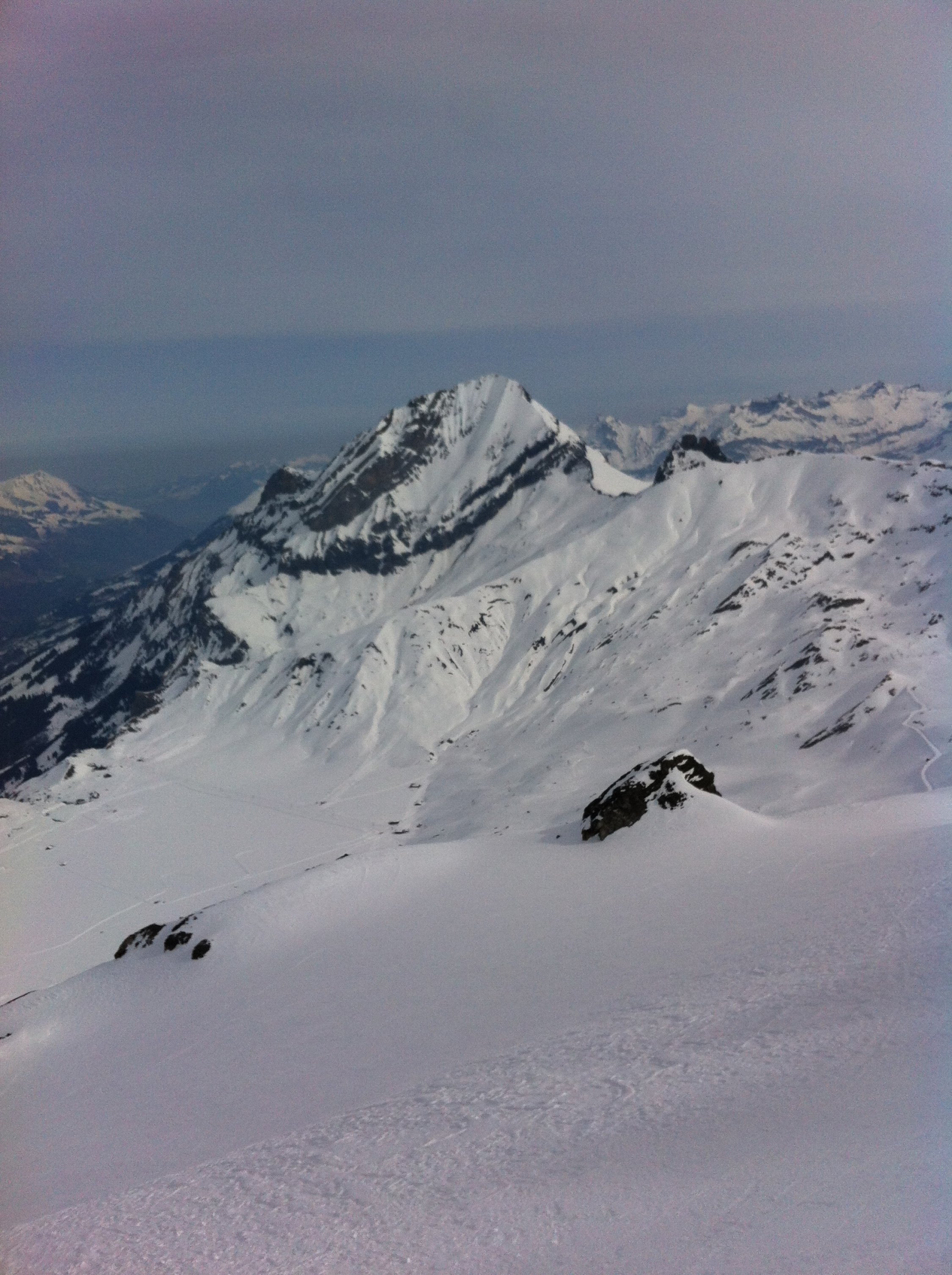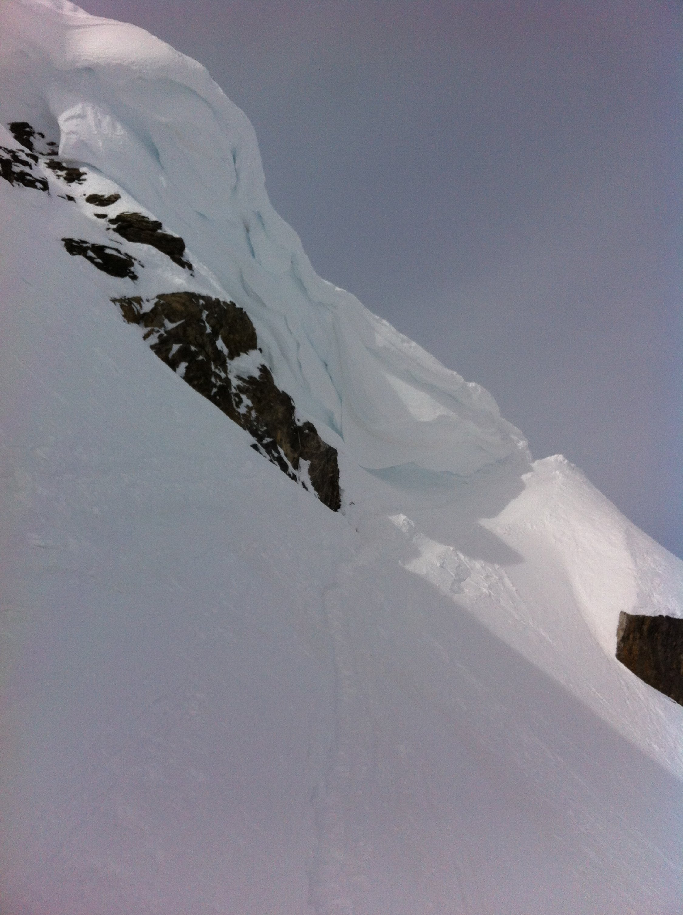 Die Verhältnisse sind gut. Sehr gut angelegte Spur! Frühstückplatztraverse gut begehbar. Harscheisen können von Vorteil sein, aber nicht zwingend. Es hat eine riesige ( fast) beänstigende Wächte am Frühstückplatz! Der Abfahrtsgenuss hält sich aber in Grenzen ! Viel verblasener Schnee, der zum Teil heimtükisch verlagert ist!
