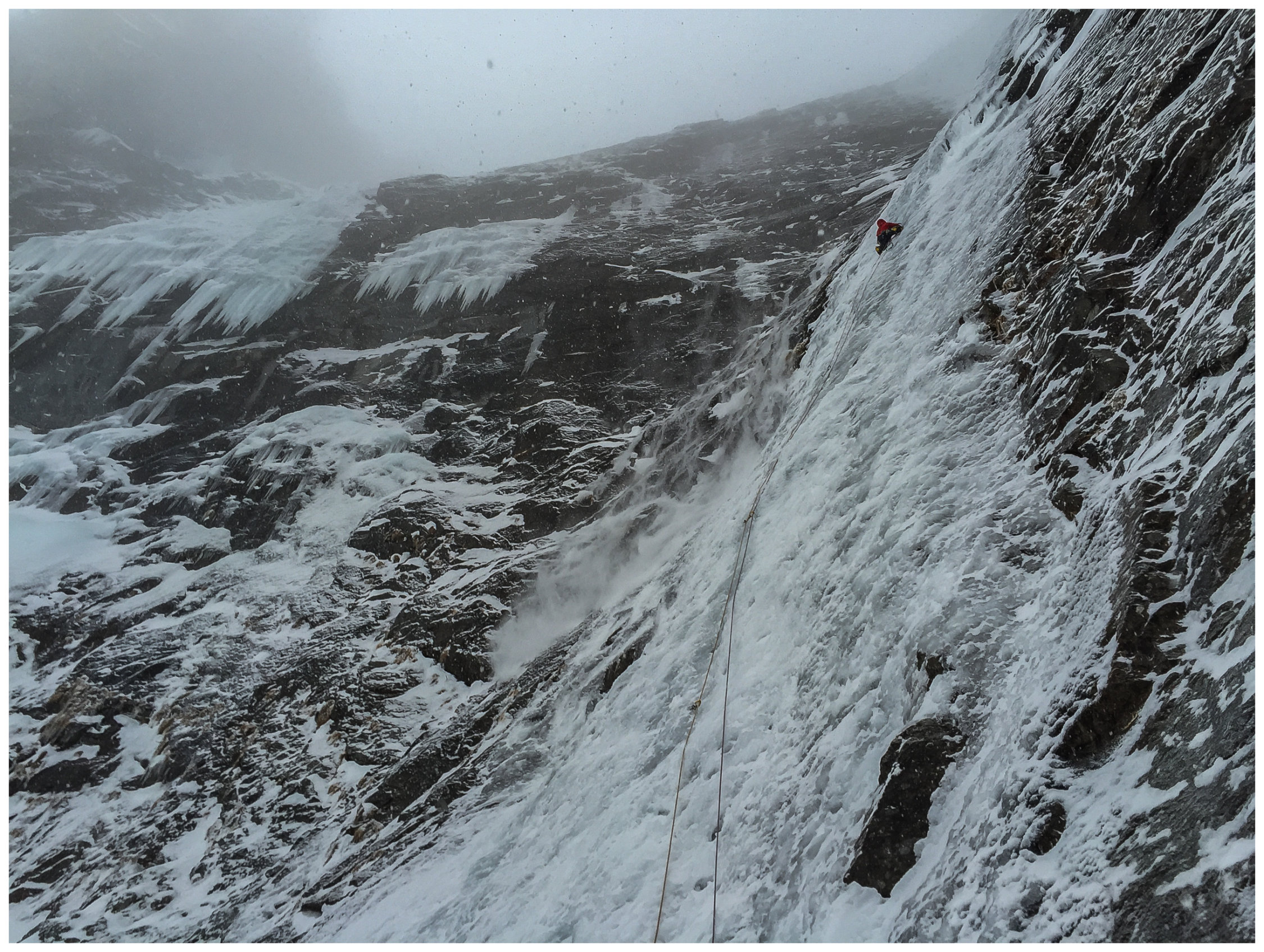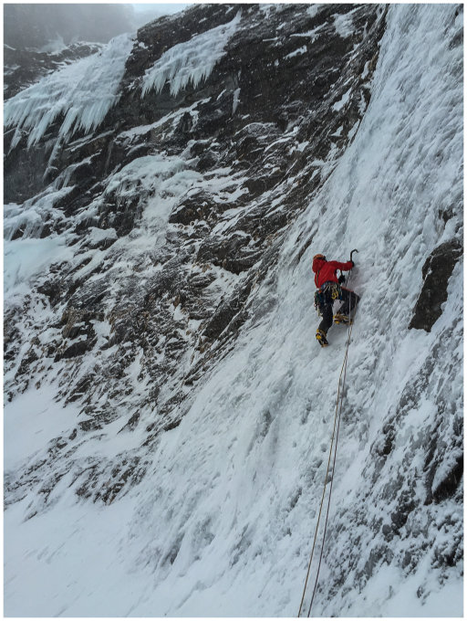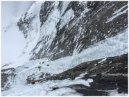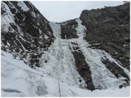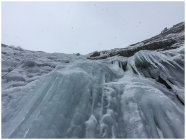 In den weniger steilen SL von Mordor ist das Eis z.T. von recht schlechter Qualität und hat viel Schneeeinschlüsse - also schlecht zum Absichern. Insgesamt war er aber gut kletterbar mit vielen Hooks von den zahlreichen Begehungen. Auf der gesamten Länge einige Abalakovs vorhanden. Einen Bohrhaken hat es: rechts (im Aufstiegssin) im Fels am Beginn der ersten steilen SL. Man kann ihn mit einem Friend hintersichern (BD Grösse 0,3 oder 0.5) Durch den Neuschnee und die Föhnlage in der Woche (um den 9.3. rum) gab es Schneeverfrachtungen auch oberhalb der Eisarena. Oberhalb von Mordor befinden sich rechte Schneemassen. im orografisch rechten Teil der Arena kamen (mehrheitlich am Sa. 12.03.) immer wieder kleinere Lawinen runter. Auch kollabierendes Eis war zu sehen. Am Sonntag 13.03. leichter Schneefall und regelmässig Spindriftladungen sowie gegen Nachmittag eine kleinere Ladung kollabierendes Eis von rechts neben Mordor - wahrscheinlich dünne Eisauflage vom Fels - die aber dann auch direkt über Mordor abgegangen ist (keine grossen Eisstücke dabei aber trotzdem nicht angenehm besonders im Vorstieg...