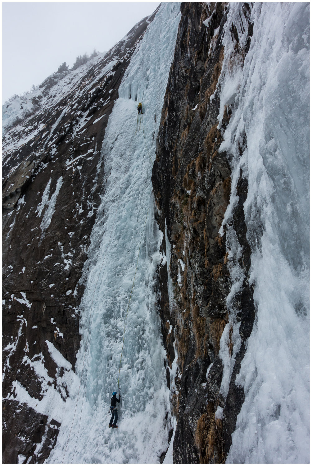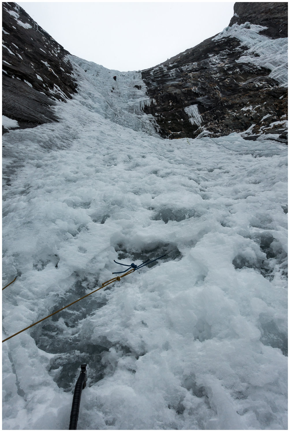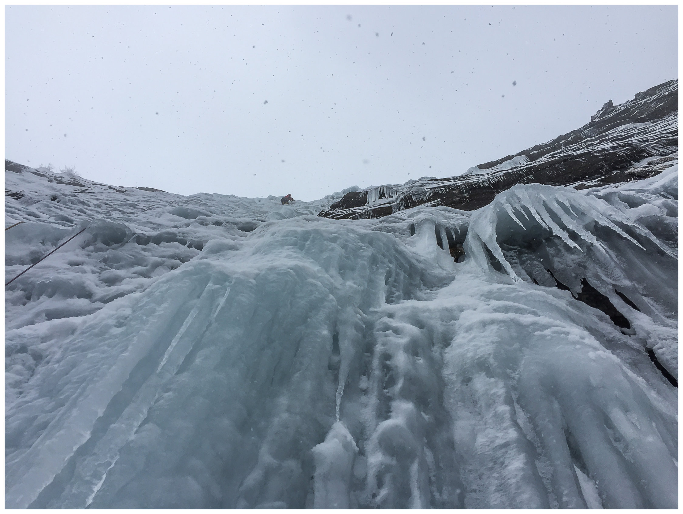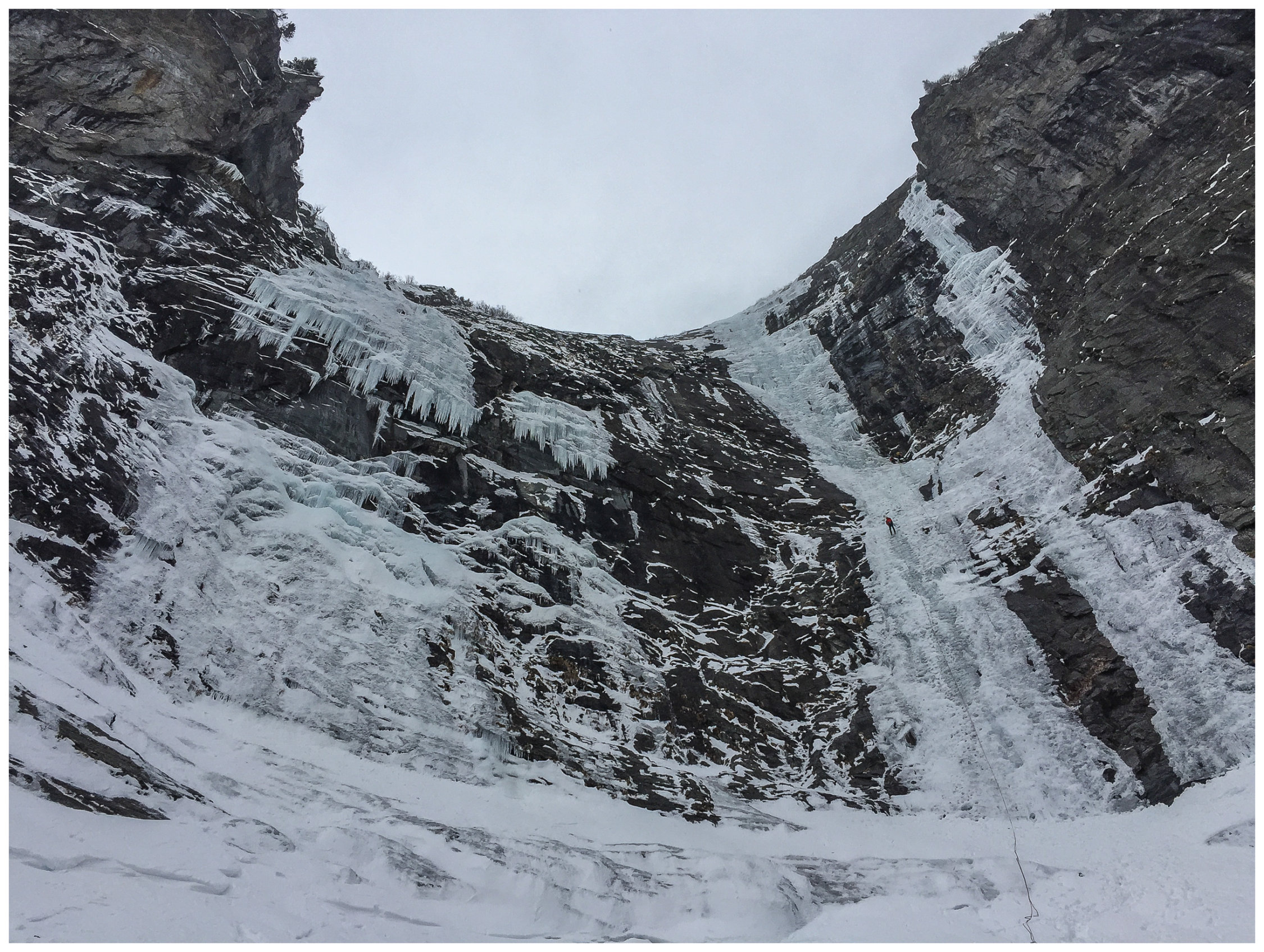 Toller Eisfall, jedoch recht gefährlich bei so vielen Seilschaften die da über- und untereinander klettern. Schon ein kleines Stück Eis wird doch zu einem rechten Geschoss wenn es über zig Meter runter saust... Wir hatten - dank Frühaufstehens - die Startnummer 1 :-)