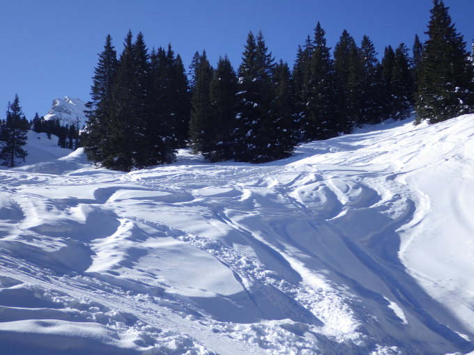 Traumlücke zum Zweiten: Skiroute durchgehend eingeschneit und gespurt. Oberhalb der Baumgrenze ist der Schnee windbearbeitet, aber immer noch pulvrig. Es war/ist noch kalt und die Hänge erhalten nur indirekte Sonneneinstrahlung. Deshalb ist die Oberfläche noch nicht mit einer Schmelzkruste überzogen. Gelegentlich Windharschdeckel stören das Abfahrtsvergnügen nicht – sie sind noch leicht zu durchbrechen. Abfahrt in die Wildgrimmi und dann der dortigen Aufstiegsroute entlang von Pkt. 1813 nach Pkt. 1540.