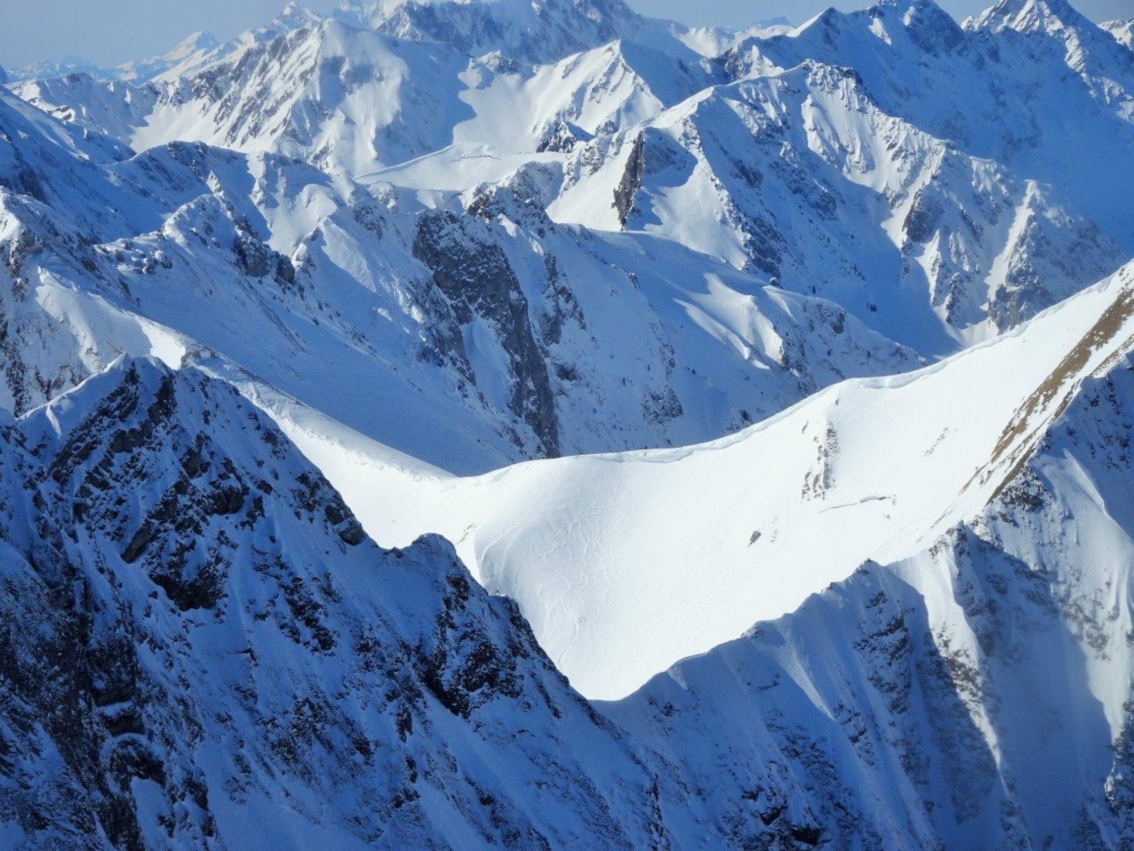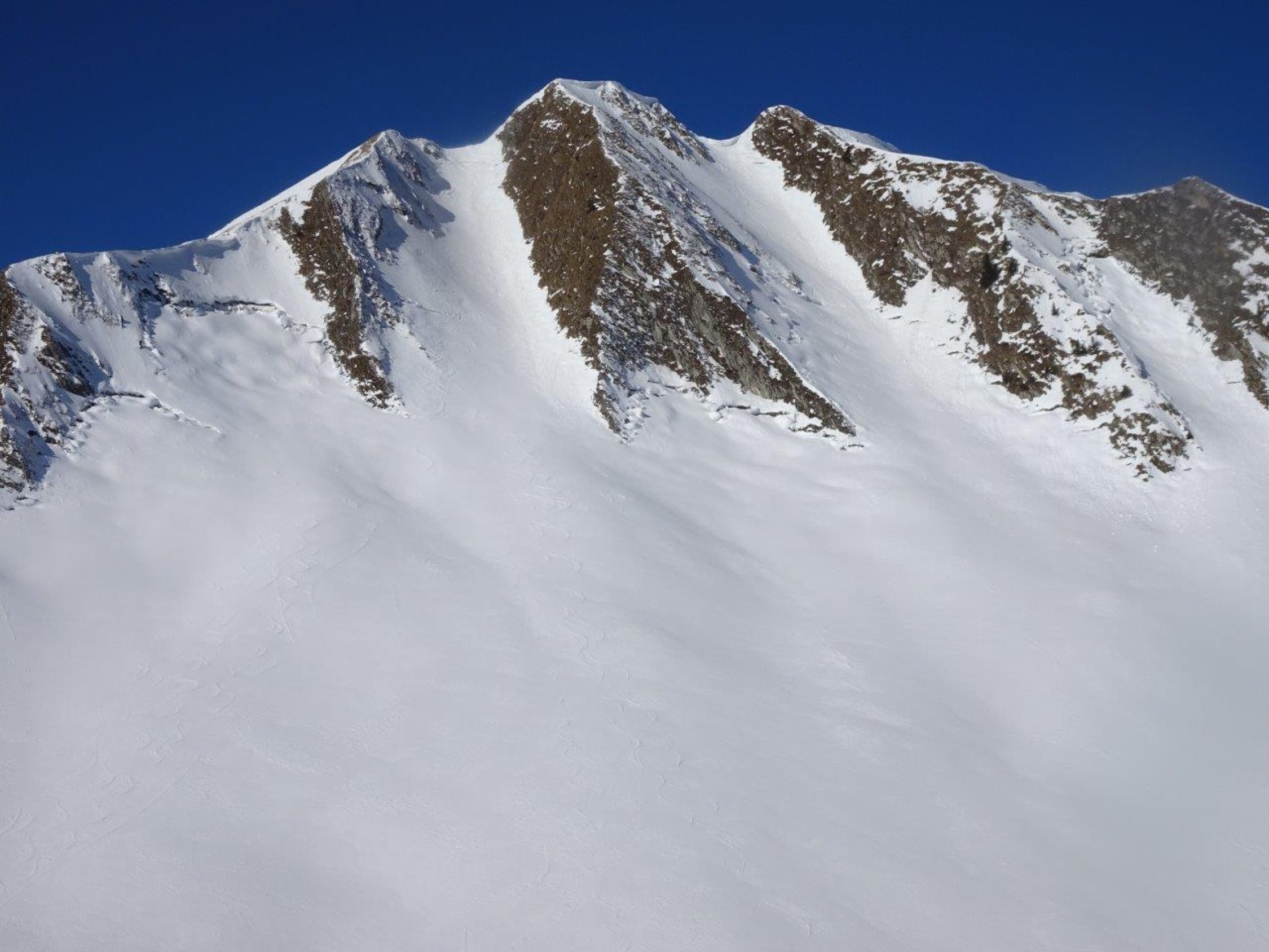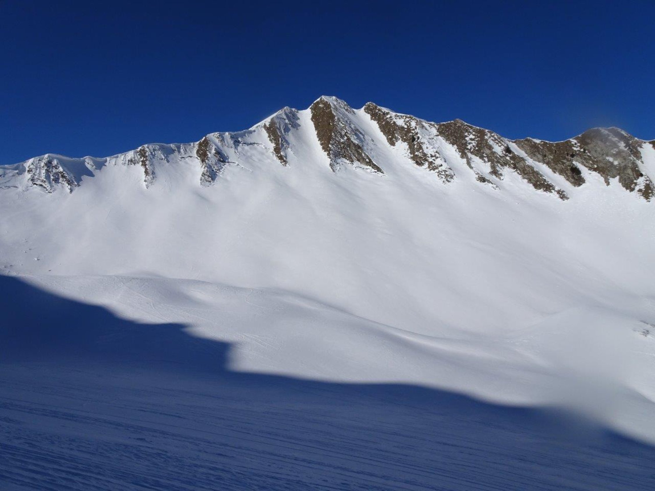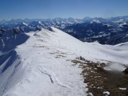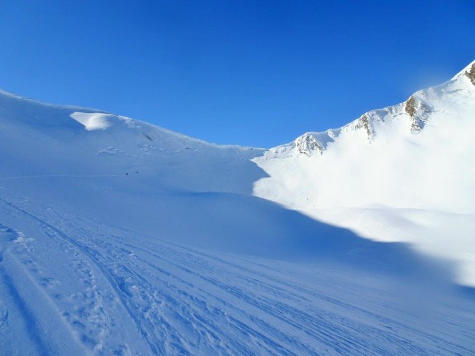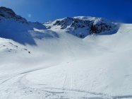 Gestern schneite es im Gebiet nicht viel - der Neuschnee überdeckte die alten Spuren nur mager. Daher war die Abfahrt in der Nordflanke eher etwas ruppig. Die Einfahrt oben hart aber gut befahrbar. Die Aufstiegsspur kurz vor dem Morgentenpass war nicht optimal so dass die Ski getragen werden mussten.
