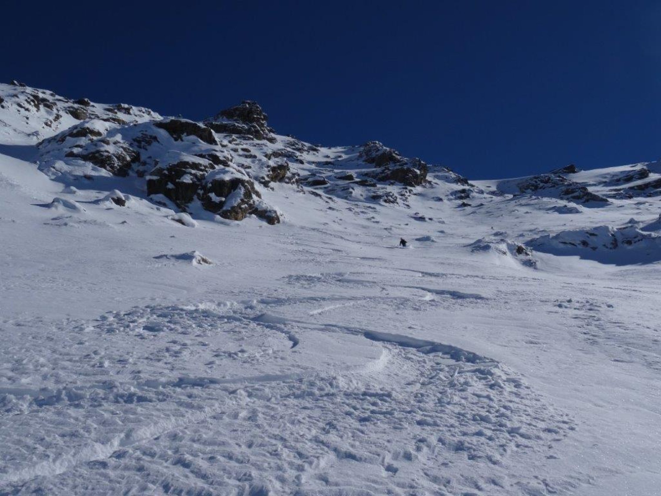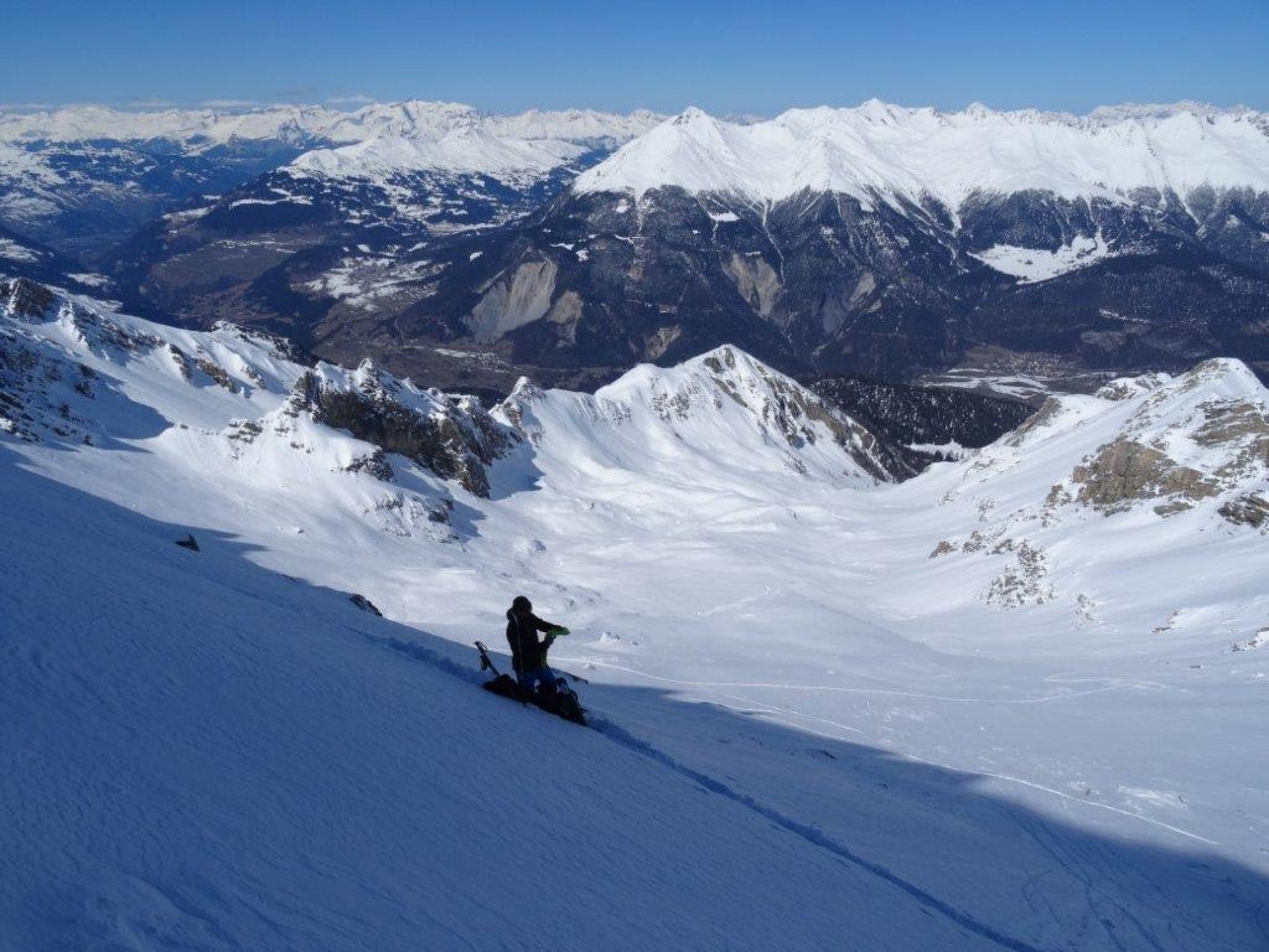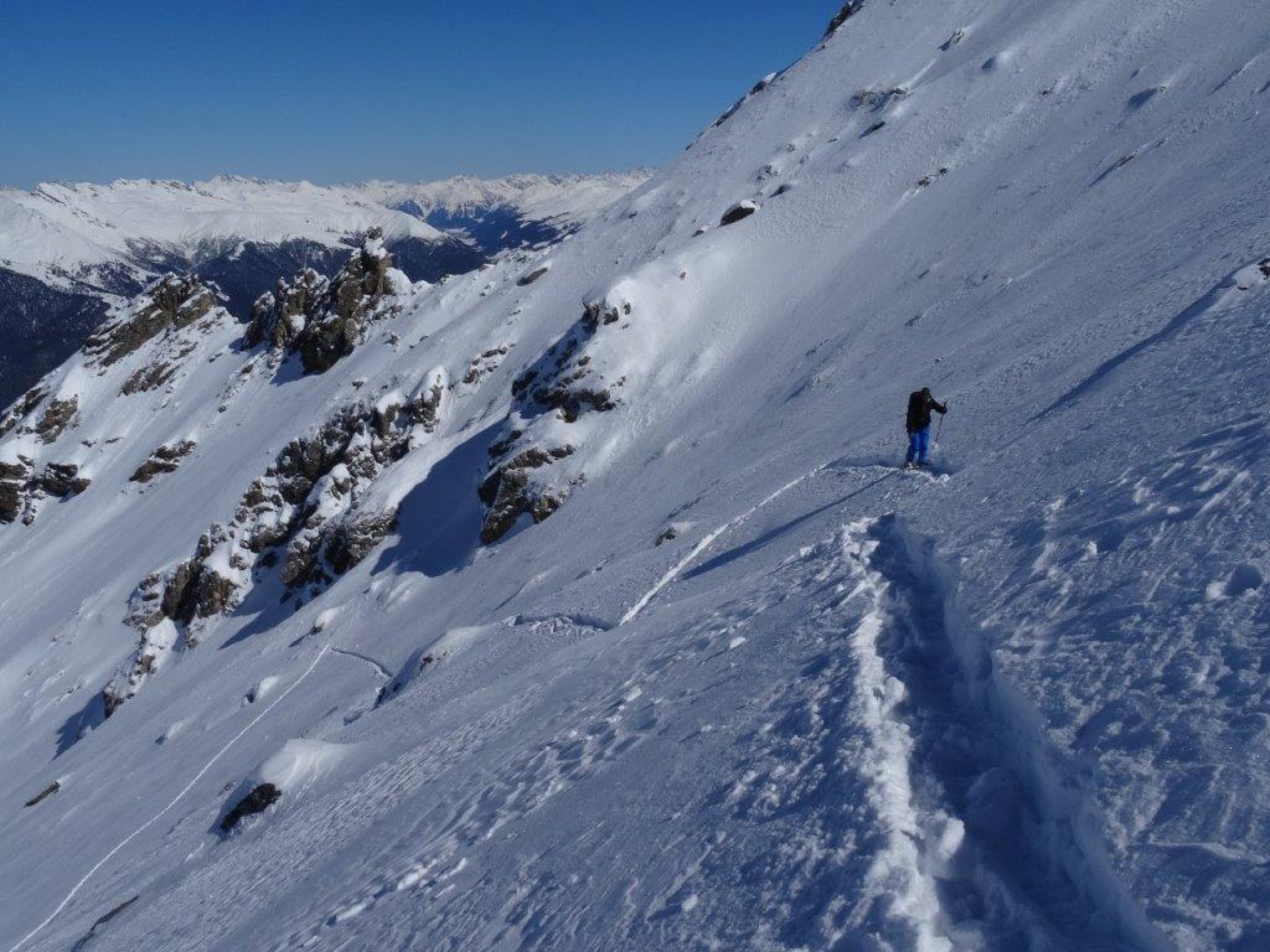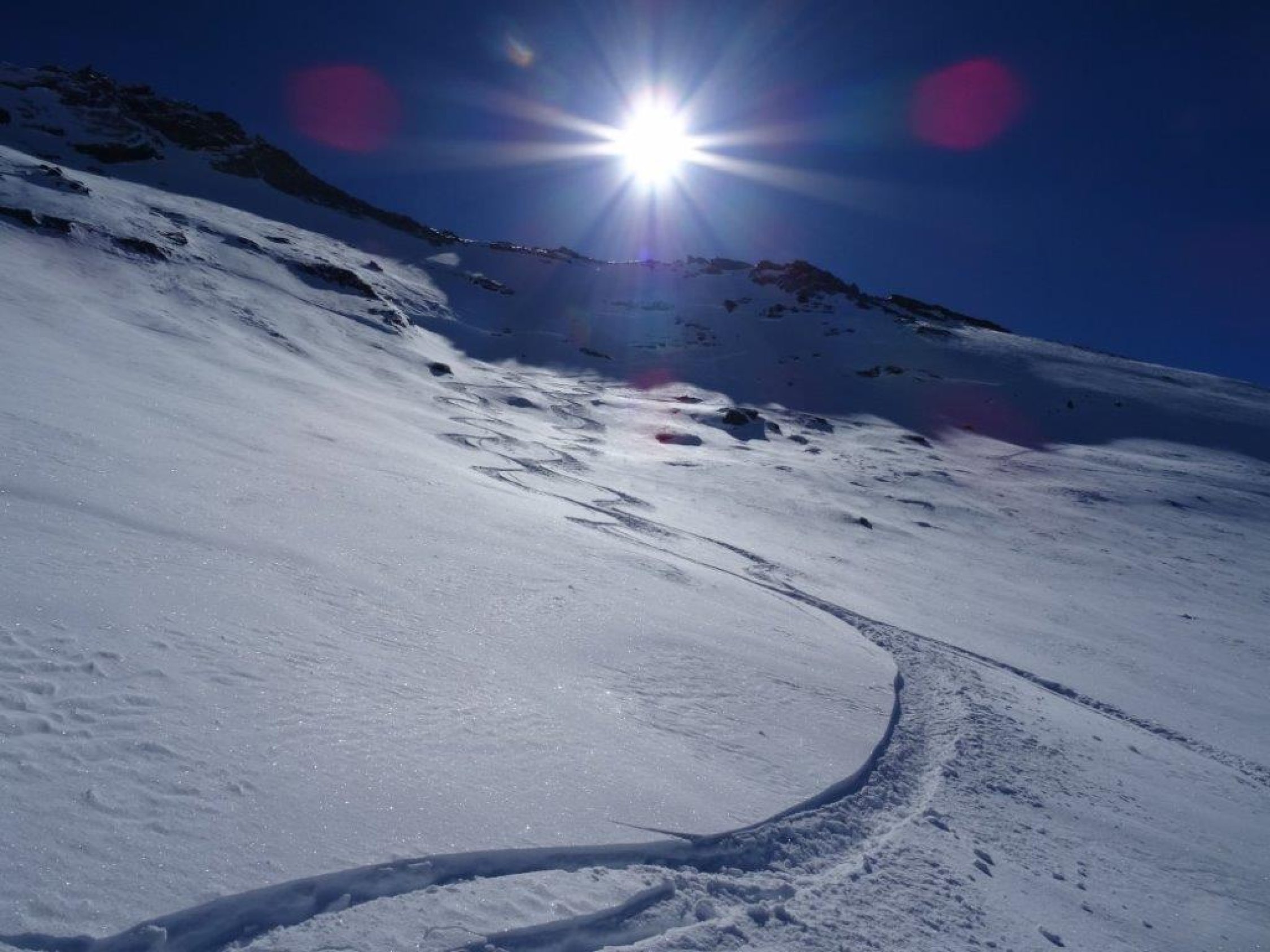 Das knacken in der Querung bewog uns zum umkehren, obwohl wir uns nicht ganz sicher sind, ob es überhaupt stattgefunden hat. Aber nur ein kleiner Rutsch kann in der Querung zu P.2905 fatale folgen haben, da keine Fluchtmöglichkeit vorhanden ist und man oberhalb einer 200m hohen Felswand steht. Vielleicht reagierten wir zu empfindlich und der Gipfel wäre heute machbar gewesen, wer weiss. Wir genossen jedenfalls die tollen Pulverhänge und hatten auch ohne Gipfelerfolg eine super Tiefschneetag. (Die ganze Tour schlägt etwa mit 2600Hm zu Buche, heute mit 2300Hm)