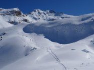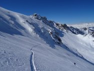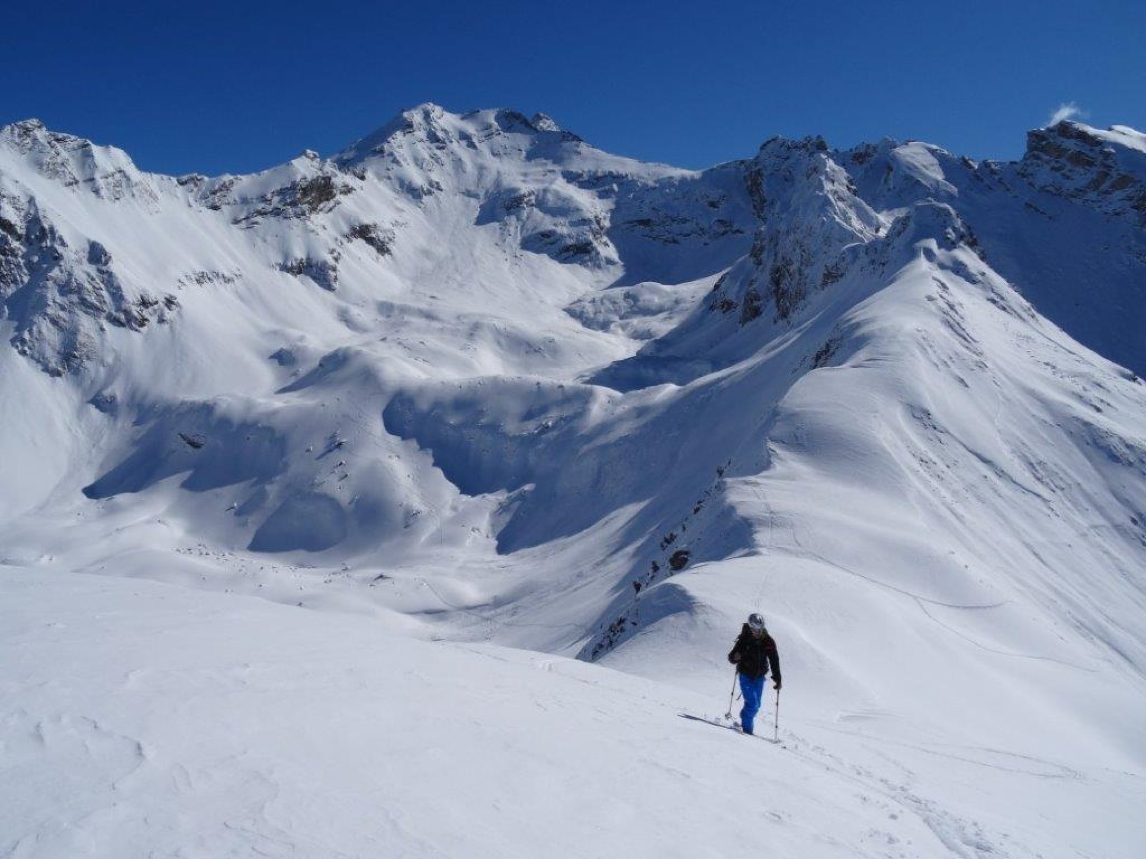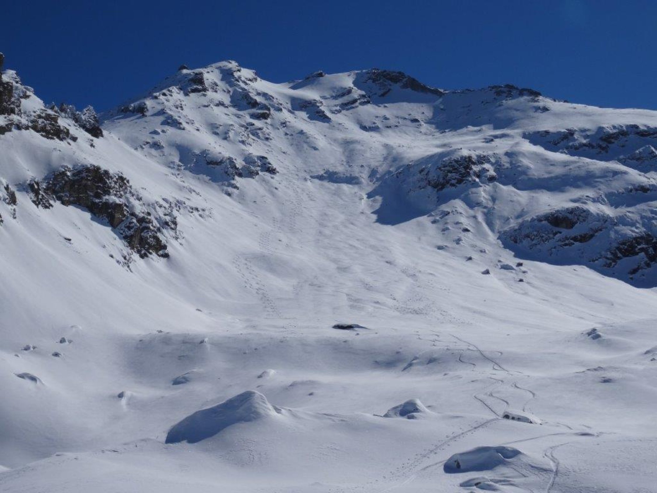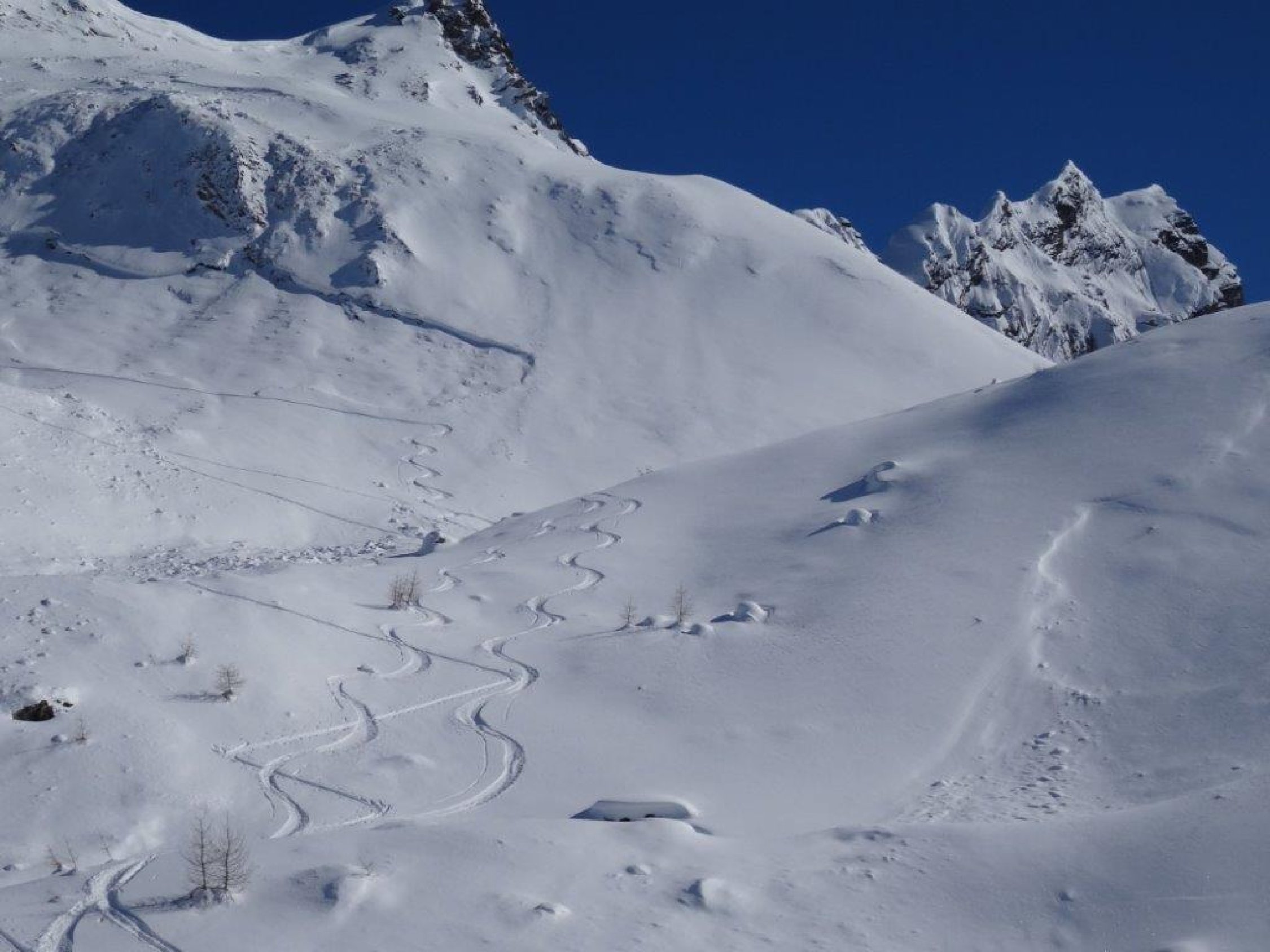 Das knacken in der Querung bewog uns zum umkehren, obwohl wir uns nicht ganz sicher sind, ob es überhaupt stattgefunden hat. Aber nur ein kleiner Rutsch kann in der Querung zu P.2905 fatale folgen haben, da keine Fluchtmöglichkeit vorhanden ist und man oberhalb einer 200m hohen Felswand steht. Vielleicht reagierten wir zu empfindlich und der Gipfel wäre heute machbar gewesen, wer weiss. Wir genossen jedenfalls die tollen Pulverhänge und hatten auch ohne Gipfelerfolg eine super Tiefschneetag. (Die ganze Tour schlägt etwa mit 2600Hm zu Buche, heute mit 2300Hm)