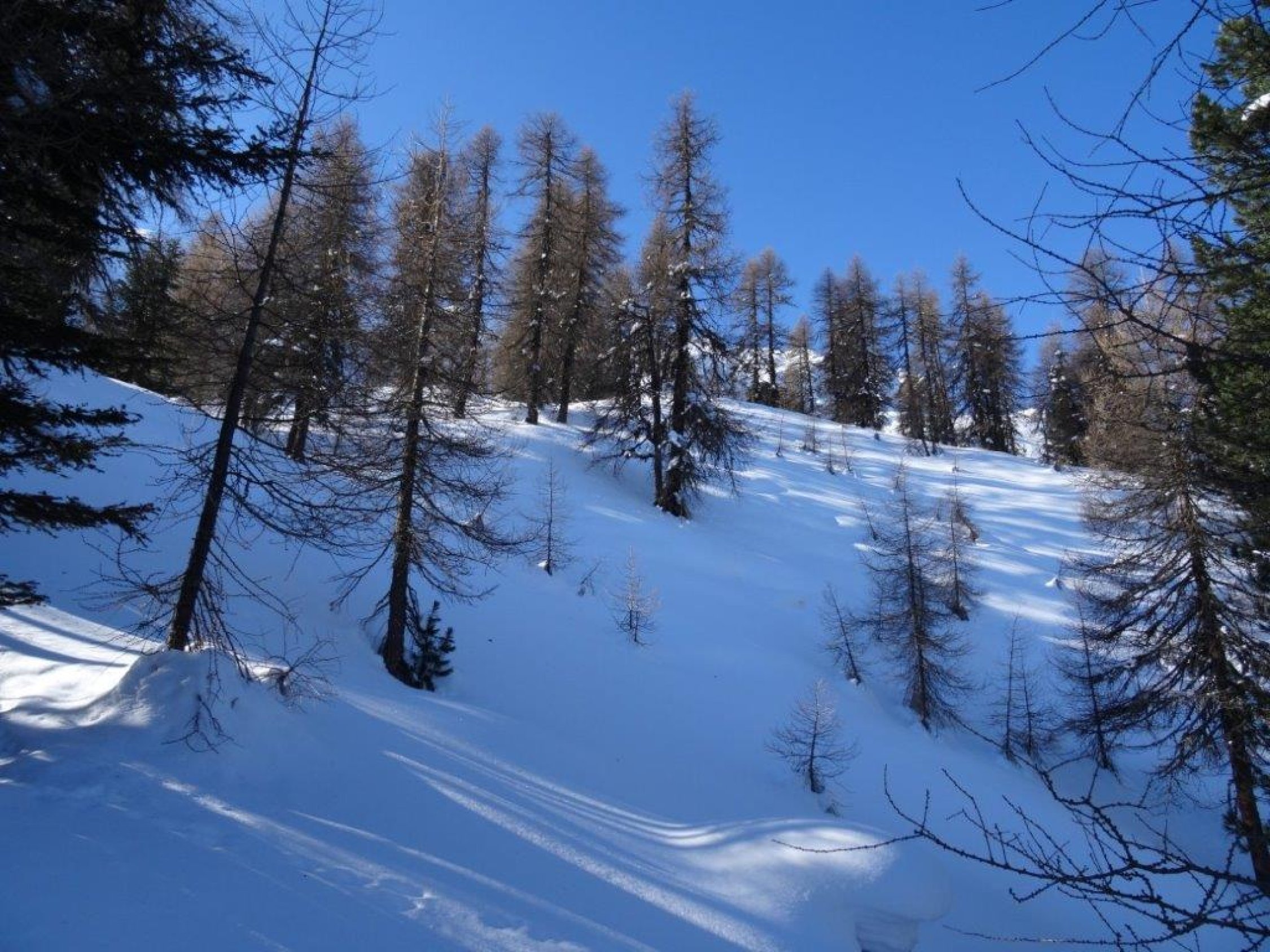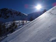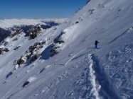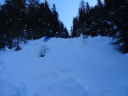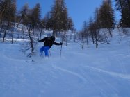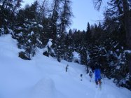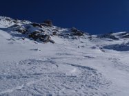 Ski vom Parkplatz 5 min tragen, dann können im Aufstieg die Ski's angeschnallt werden. In der Abfahrt muss man die letzten 200 Hm die Skis ins Tal tragen. Die Tragepassagen werden länger aber die Tour ist noch lange machbar. Wird mit dem kommendem Frühling und der Erwärmung sicher besser, das Risiko minimiert, die Abfahrt dafür aber nicht unbedingt schöner. Aber Firn verschmähen wir auch nicht.