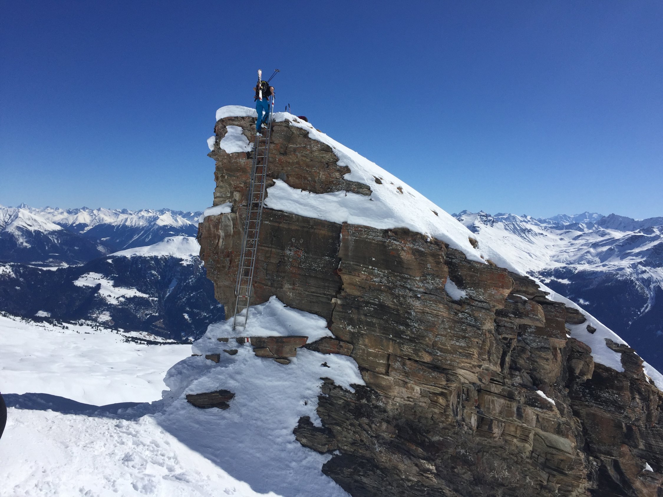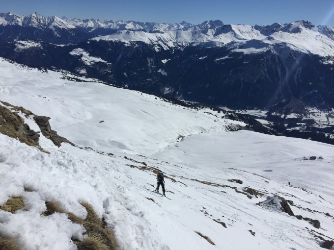 Auf den ersten 200 Hm ab Mathon tauchen die ersten braunen Flecken auf und der Schnee ist schon recht dünn. Südseitig zum Beverin Pintg dasselbe Phänomen. Auf dem Rücken ist der Schnee verblasen.