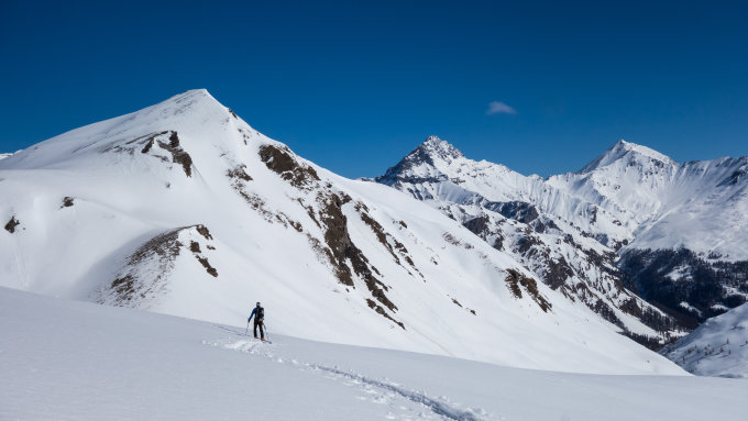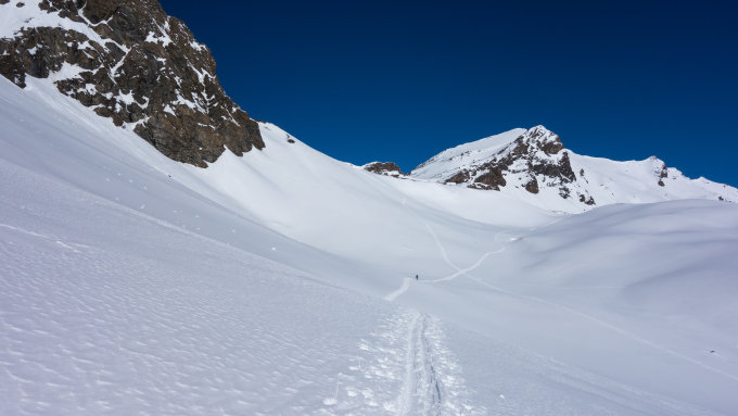 Traumwetter, wolkenlos. Guter Trittschnee am sehr steilen Gipfelhang, Steigeisen hilfreich aber heute kein muss. Wir haben die Ski auf den Gipfel getragen und sind direkt die steilen Nordwesthänge hinuntergefahren und dann talauswärts flach zur Heidelbergerhütte. Sehr wenig Schnee im Gipfelbereich, viele Steine. Dort mussten wir die Ski z.T. hinuntertragen. Danach eine Passage mit herrlichem Pulver, dann bis zur Heidelbergerhütte sehr unterschiedliche Schneeverhältnisse von Pulver über Hartschnee und Bruchharscht.