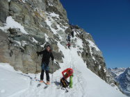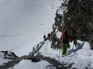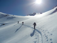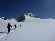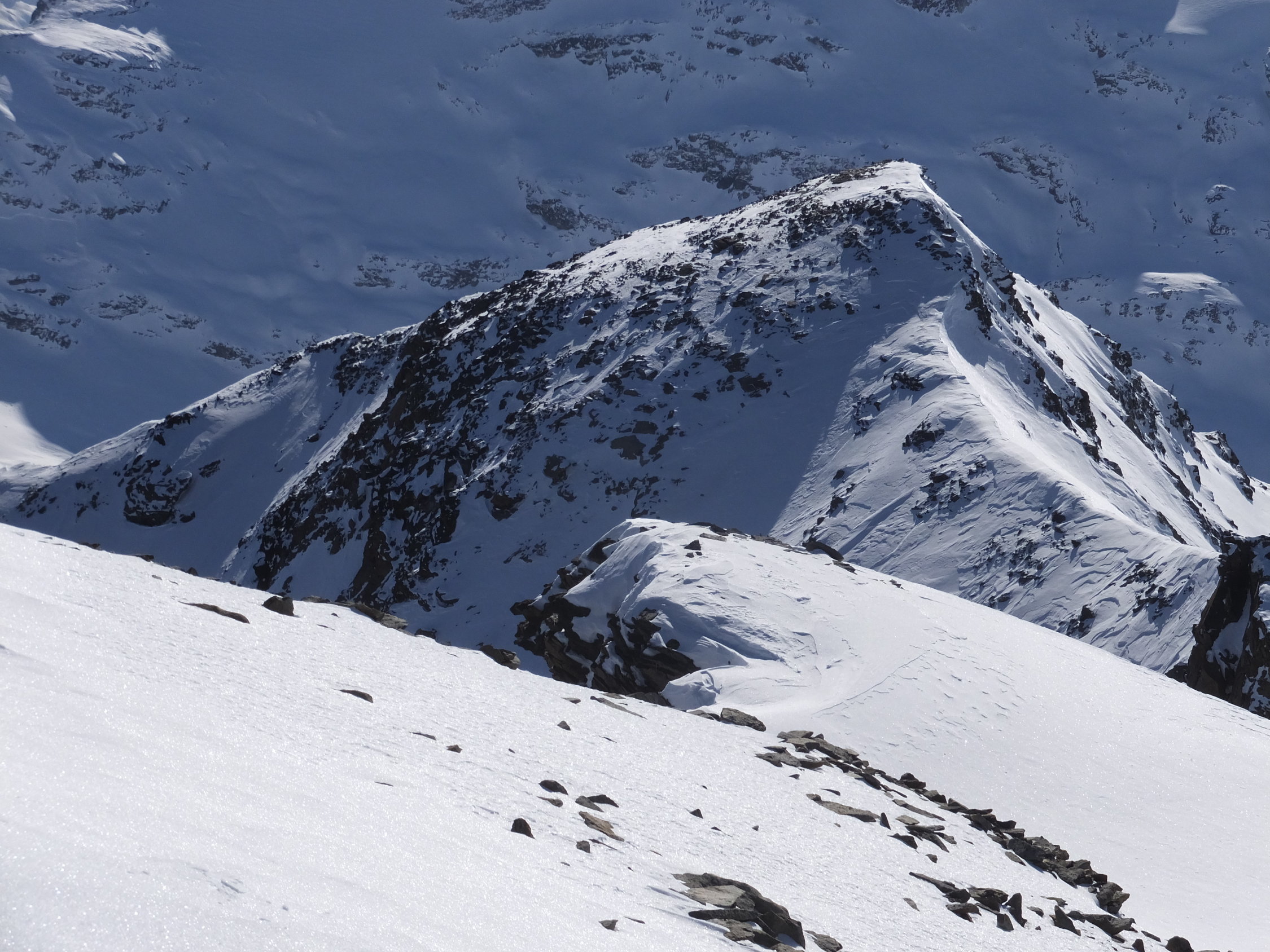 Sehr gute Schnee Bedingungen auf der Route 770a und auf dem Vadret dal Chapütschin. Steinige Gipfelaufstieg mit ein paar Steinplatten auf 3340m, die man mit einen 15m Fix-Repschnur gut entscharfen kann. Traumhafte Pulverabfahrt nach Coazhütte.