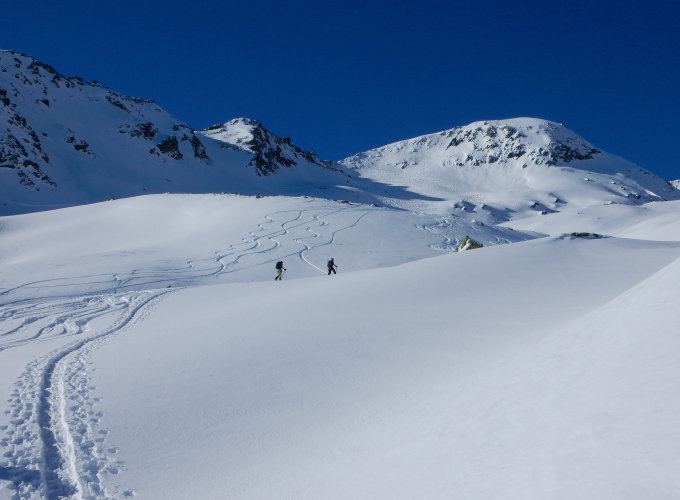 Die durchgehend steile Abfahrt (oben 45°, weiter unten 40°) durchs Nordcouloir war alles in allem sehr eindrücklich. Sie ist nur versierten Skitourenfahrer/innen bei optimalen Lawinenverhältnissen zu empfehlen. Die Querung ins Couloir über schneebedeckte abwärts geschichtete Felsplatten war etwas difizil, zumal noch keine Spur vorhanden war. Im Couli im oberen Abschnitt bis zu einem halben Meter Powder, zwischendurch auch mal vom Winde verweht, unten dann etwas weniger, aber durchgehend Pulverschnee.