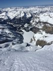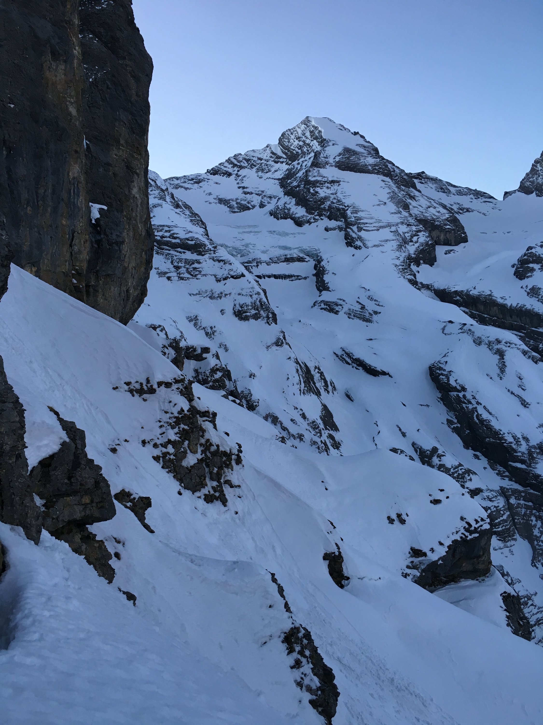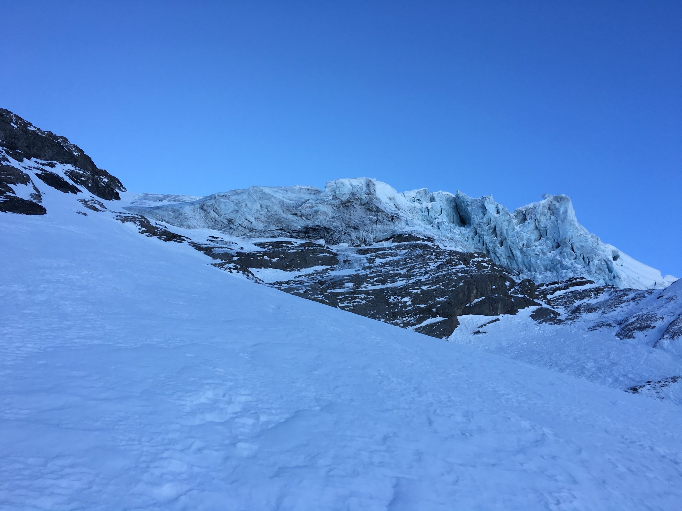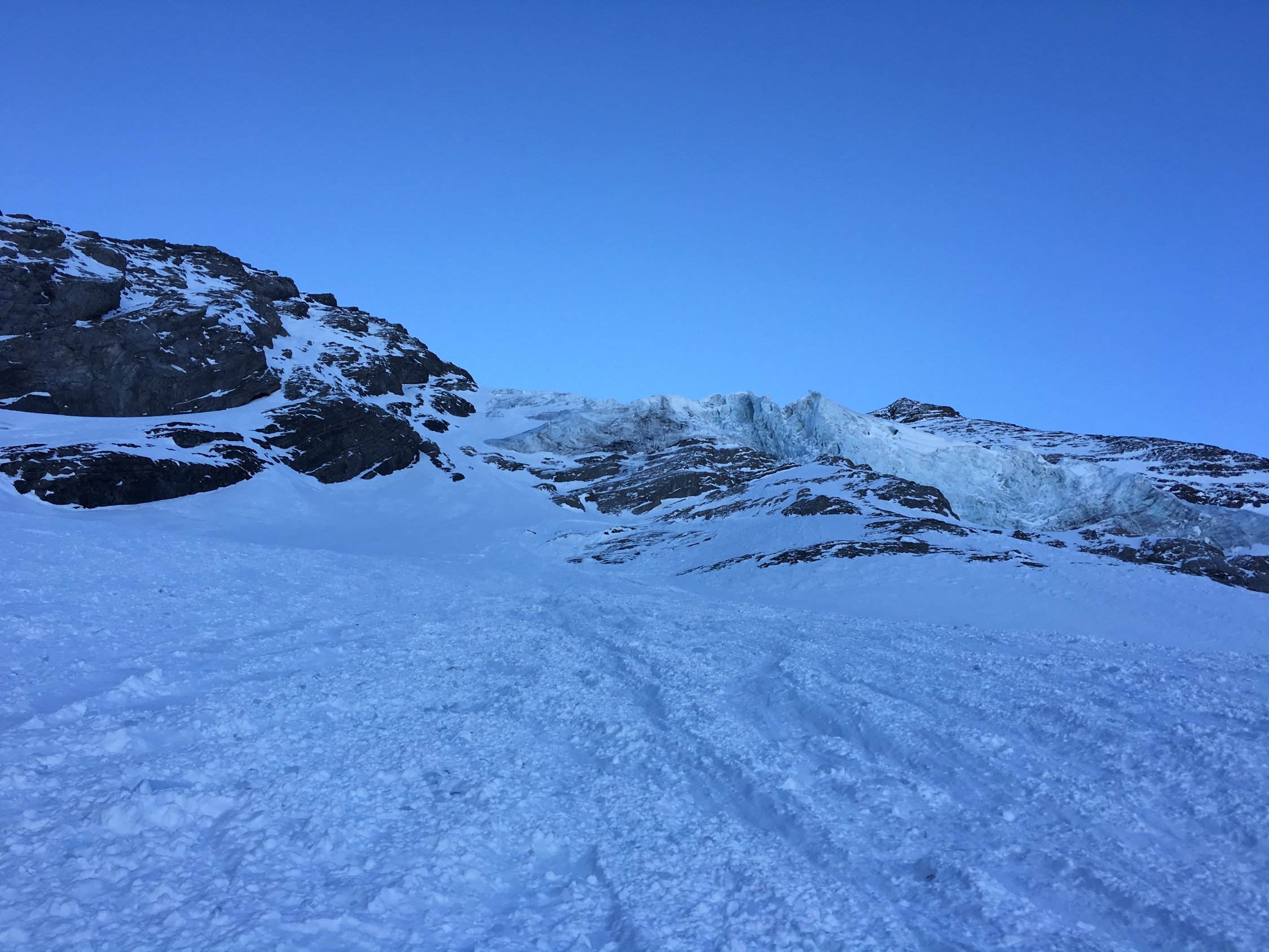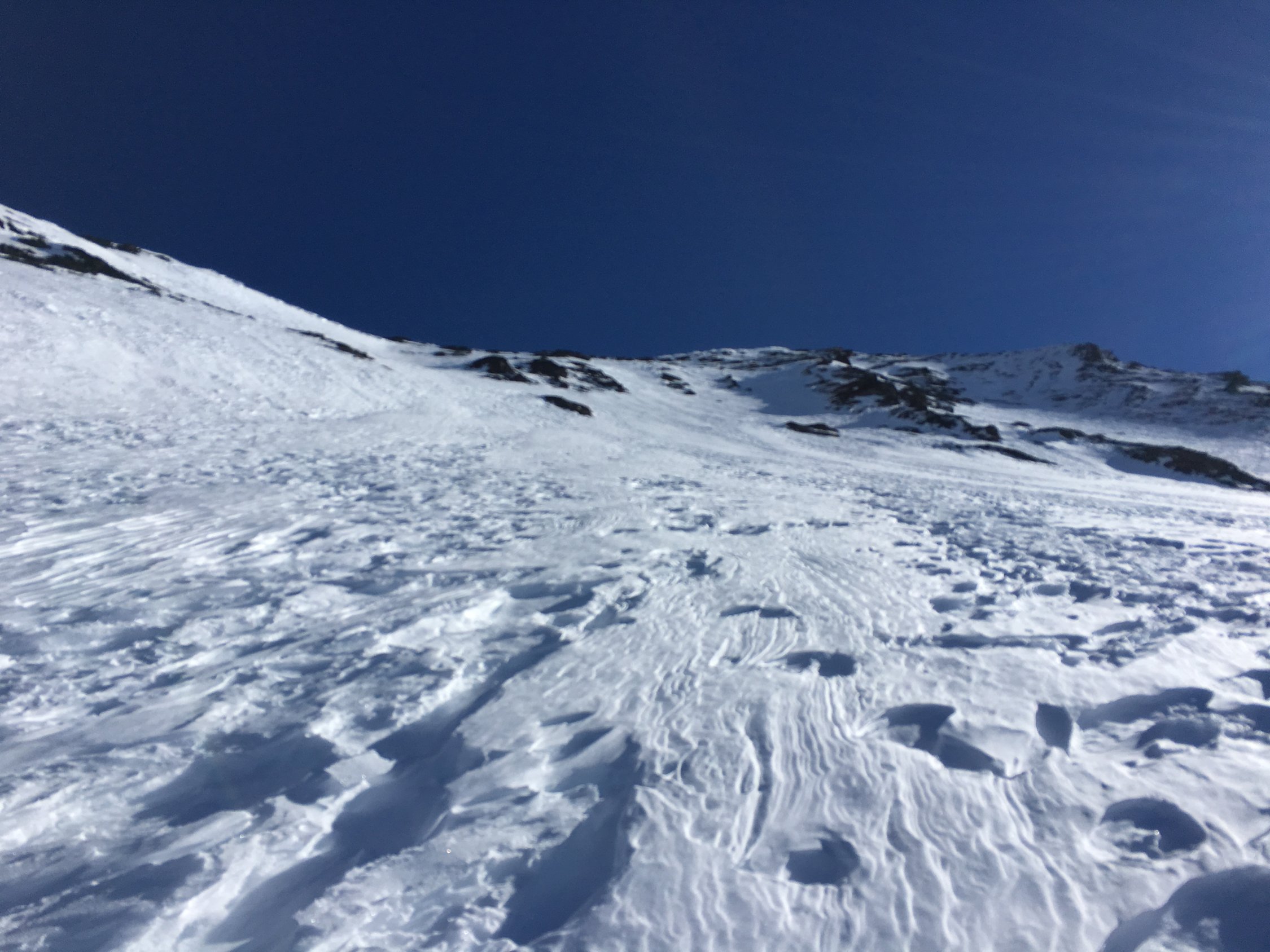 Die folgenden Felsbänder können problemlos im Schnee umgangen und umfahren werden. Das Couloir entlang des Gletschers ist sehr gut passabel, aber mit windgepresstem Schnee hart. Die Gipfelflanke ist zuoberst mit Felsen durchsetzt und schwierig zu fahren auf vereistem Schnee.