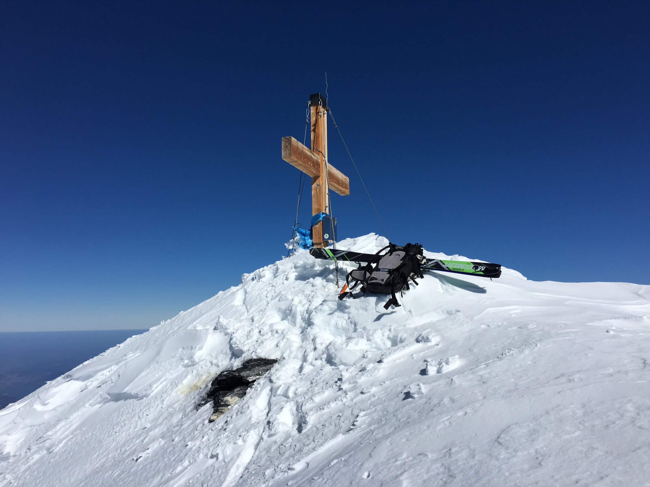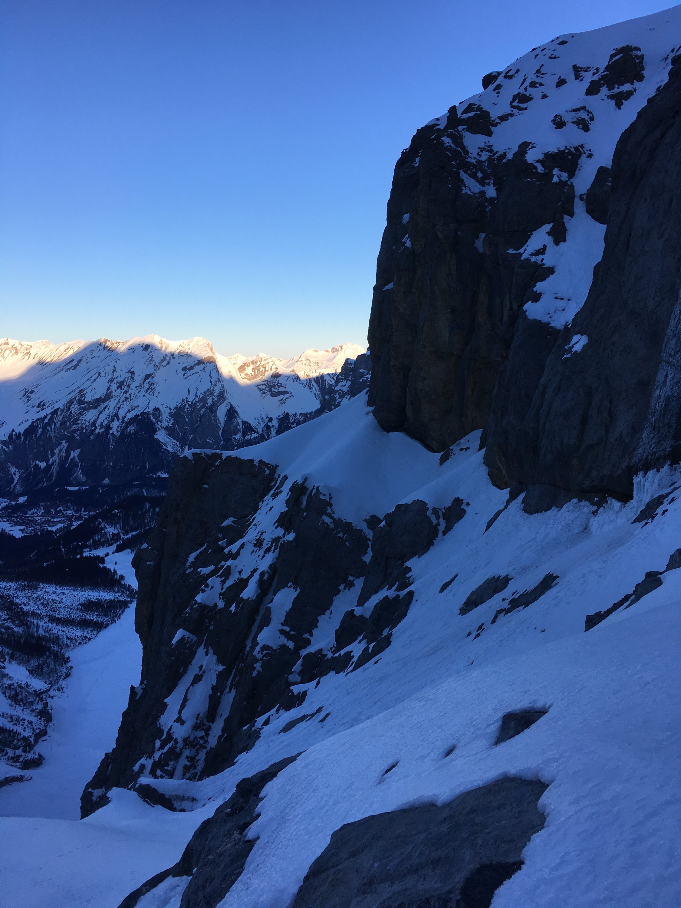Ski auf dem Rucksack getragen ab Läster bis auf den Gipfel. Die Schneelage ist sehr gut in den unteren Teilen; der zu überkletternde Felsspalt nach der Fründenschnur kann (noch) im Schnee umgangen werden.