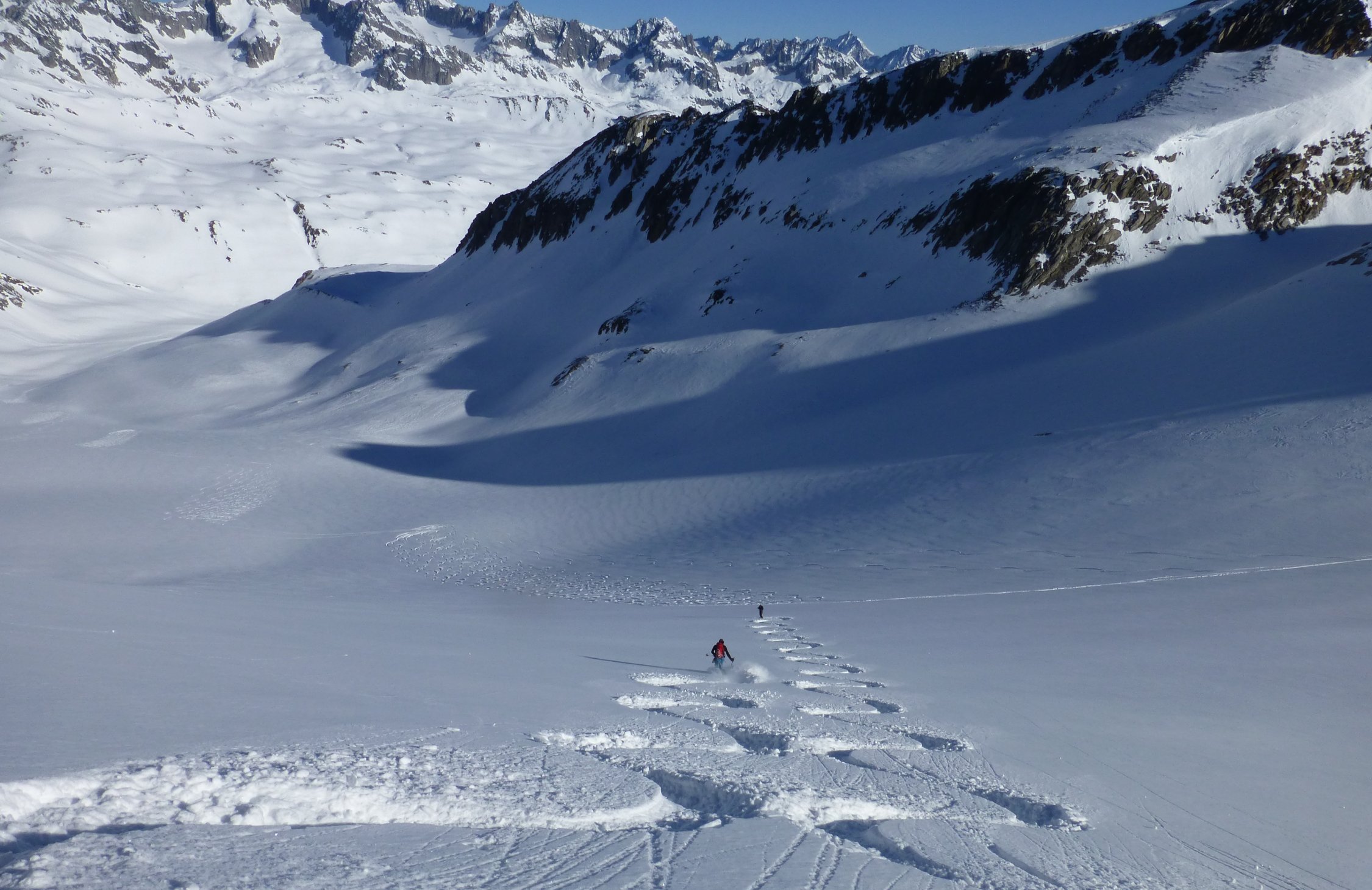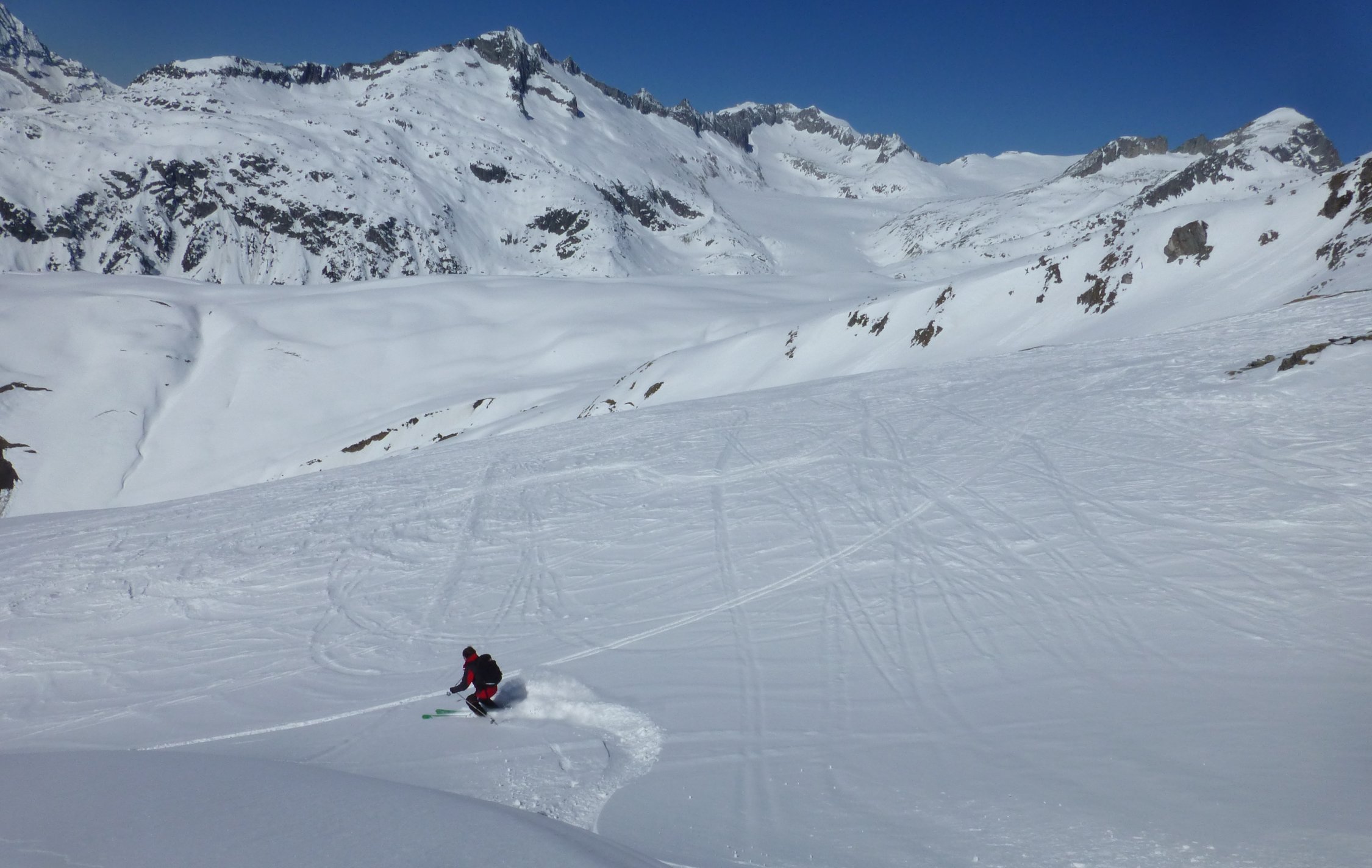 Auf der Abfahrt vom Gipfel etwas verblasen mit zugedeckten Steinen bis zum Gletscher und dann wieder Traumpulver bis nach dem Tällistock. Nun toller Sulzschnee bis nach Oberwald.