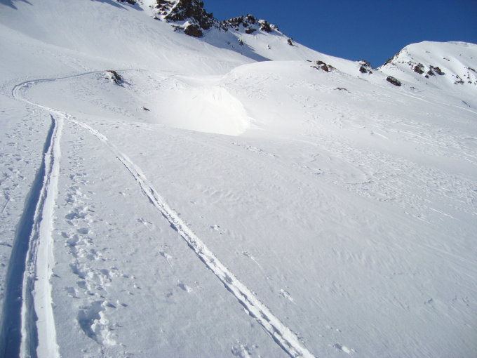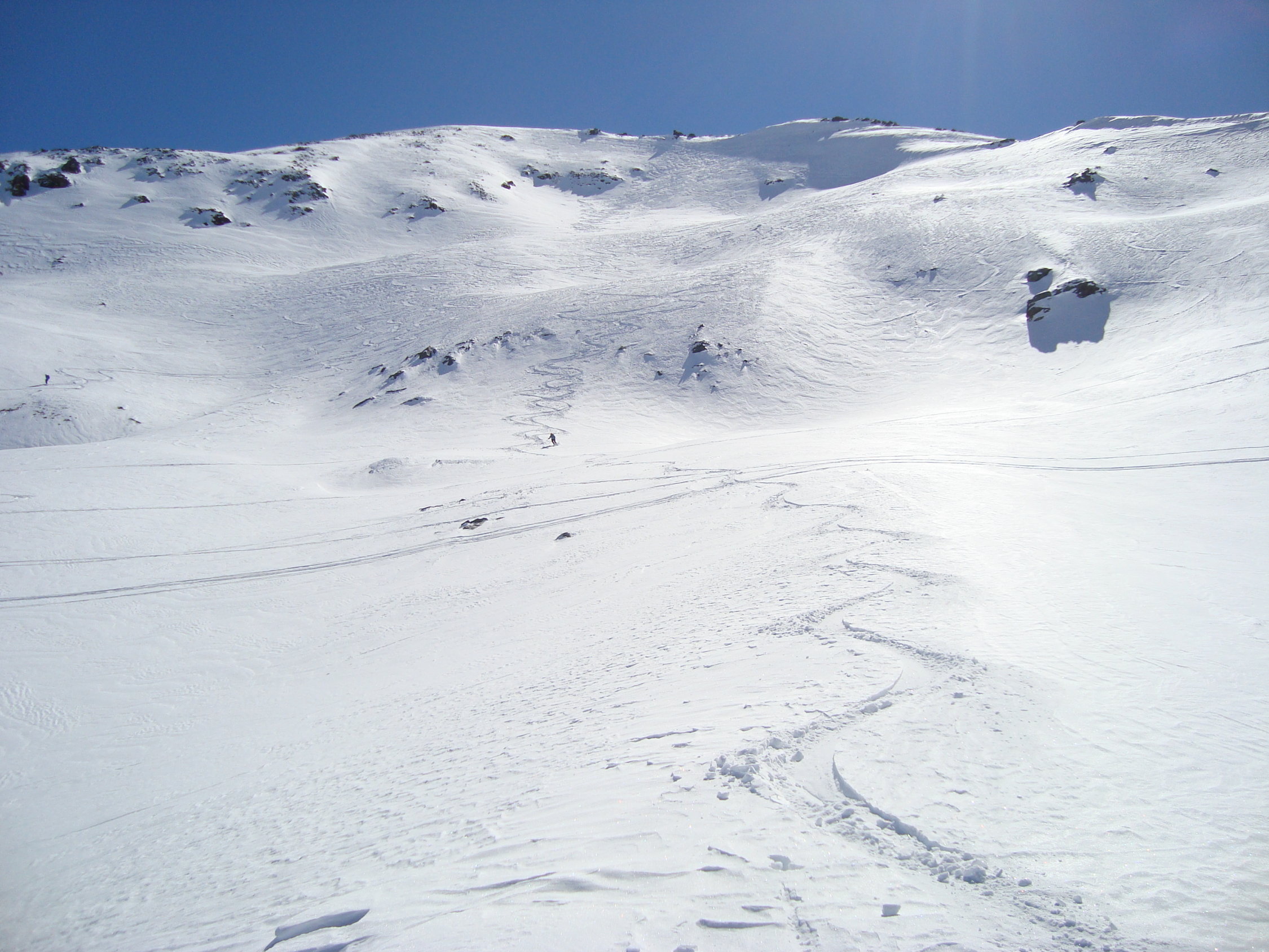 Wiederaufstieg auf Ginalshorn durchs schwarzu Tälli. Abfahrt gleicher Weg zurück, zT leicht sulzig, zT Windharsch, zT auch Pulver. Piste bis Unterbäch sehr gut, wird aber unten langsam knapp.
