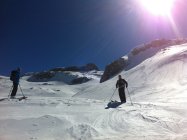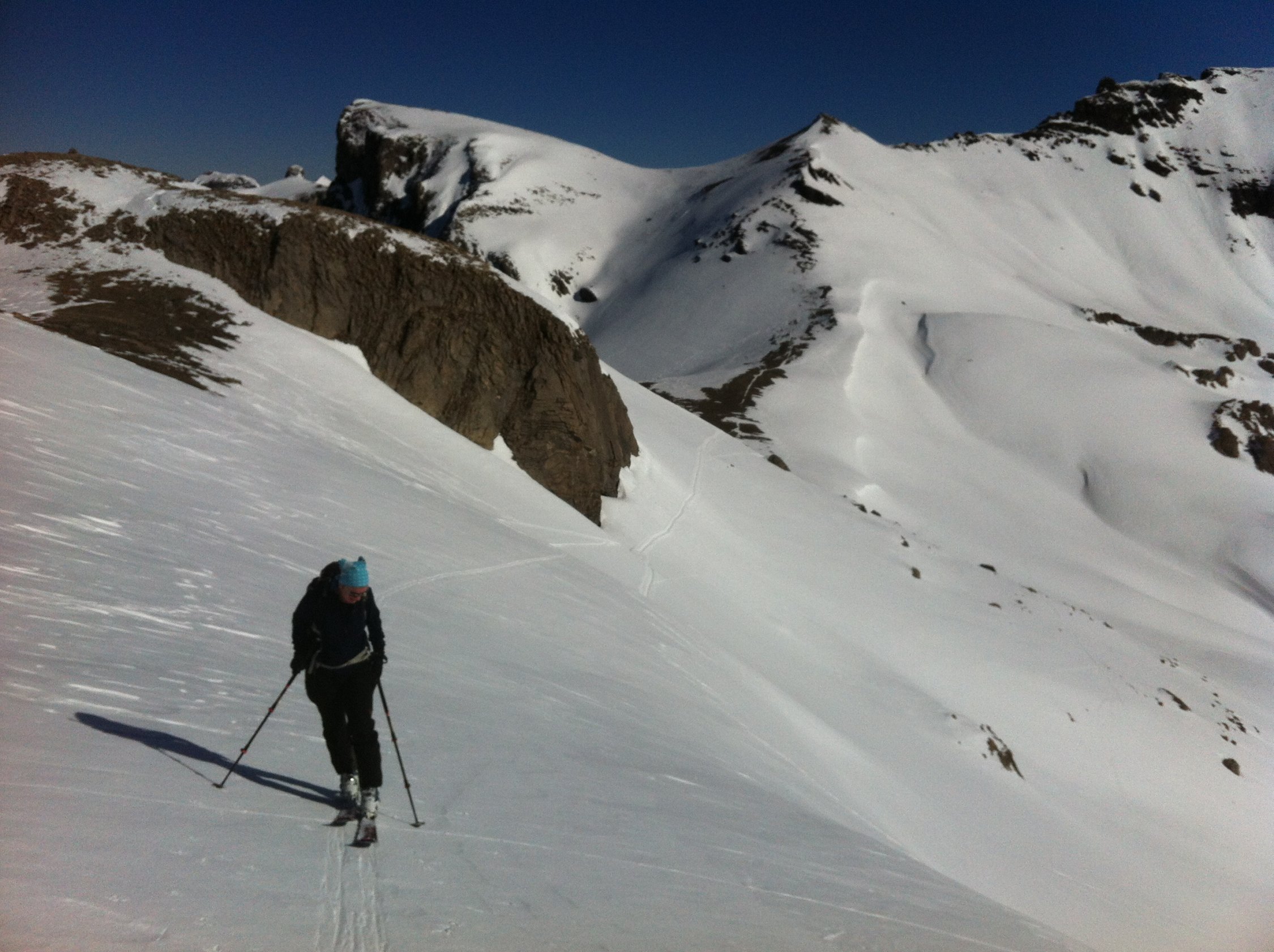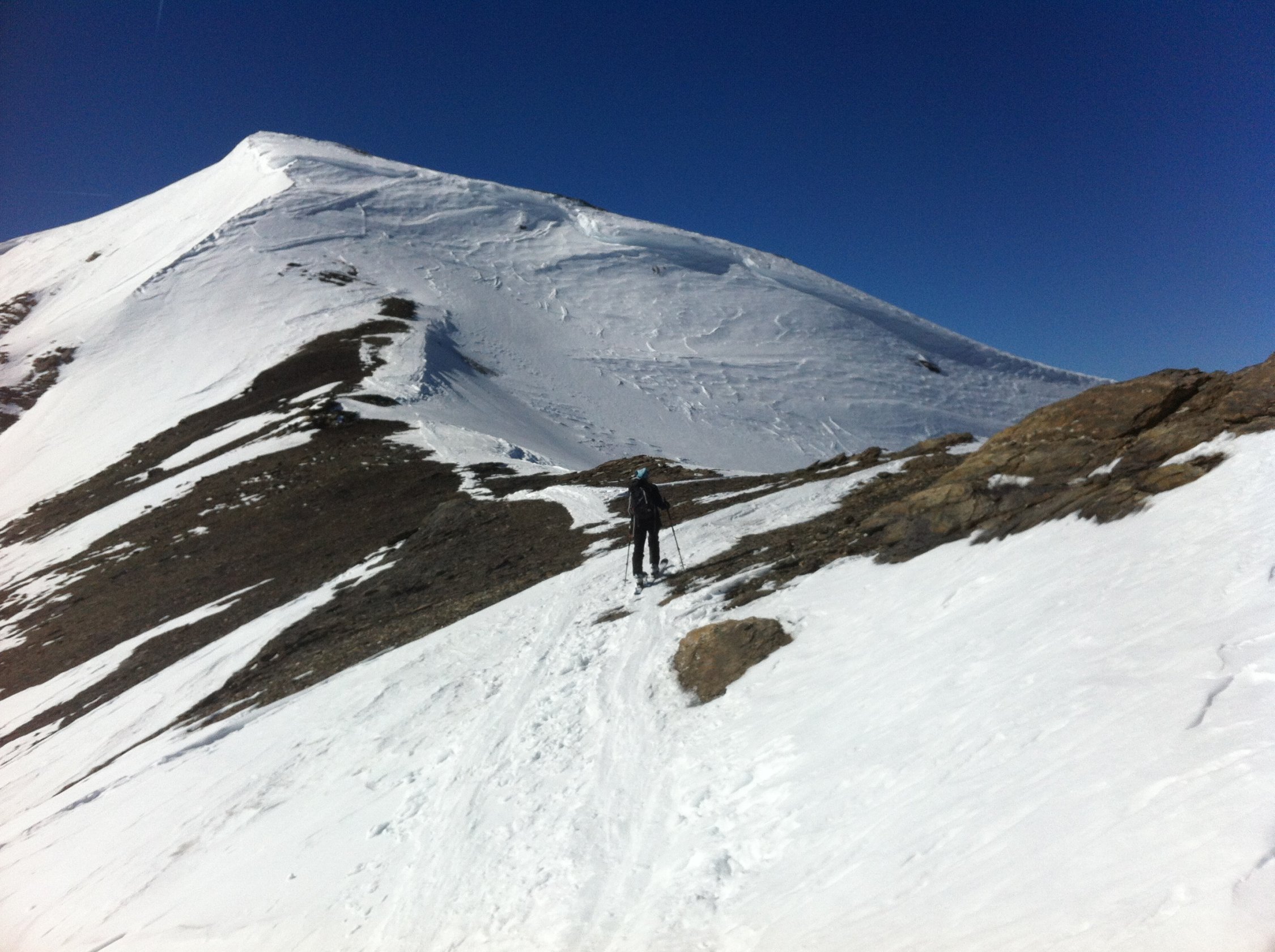 Die Abfahrt ist nach der von Osten kommenden Kaltfront am Mittwoch mit dem nachfolgenden Föhn nicht mehr lohnend. Der warme Sturmwind hat auf der ganzen Abfahrt bis Hohkien eine unberechenbare Mischung von Harst, Windharst, ein bisschen Pulver und auch aufsulzende Teile geschaffen.