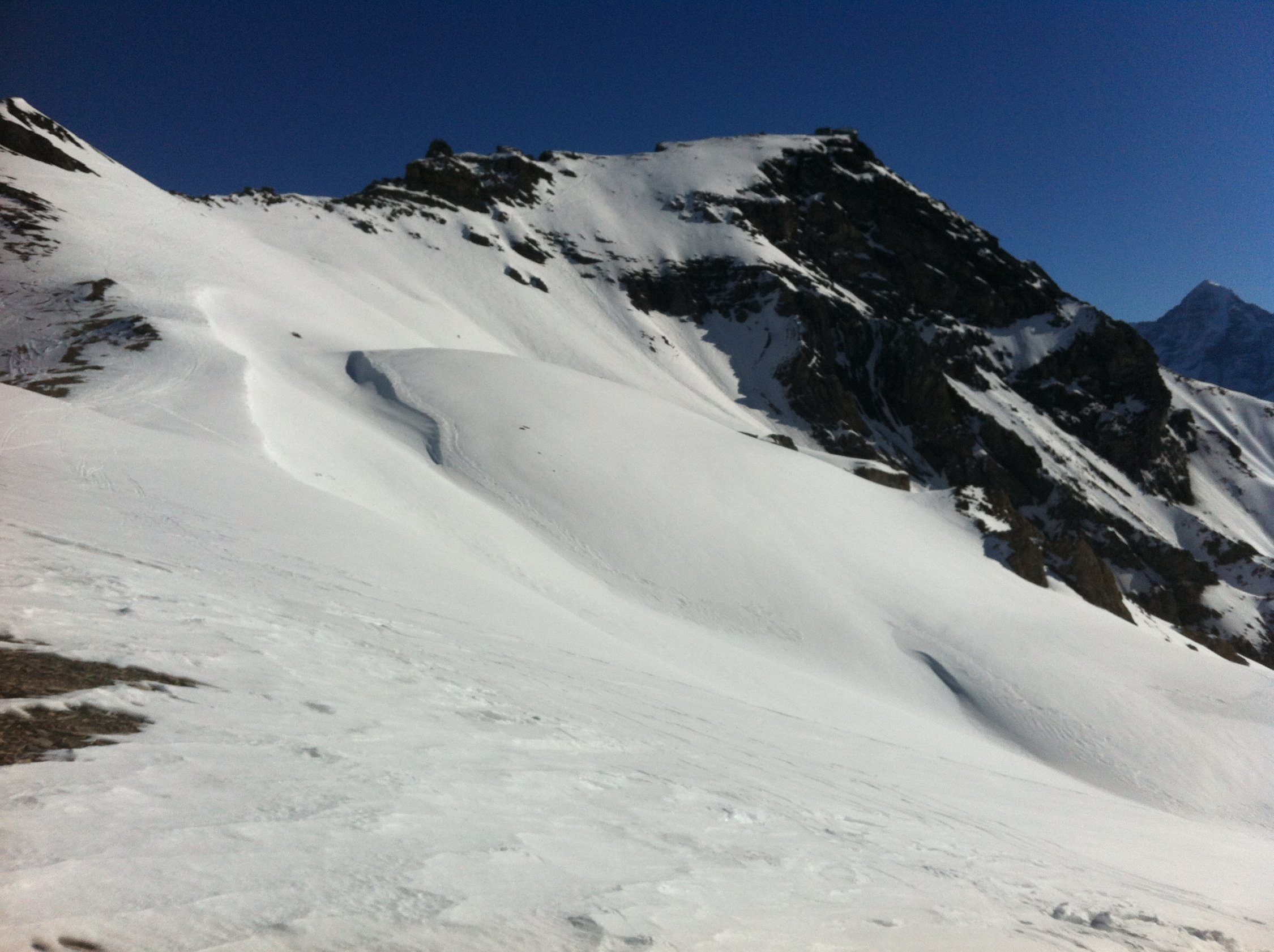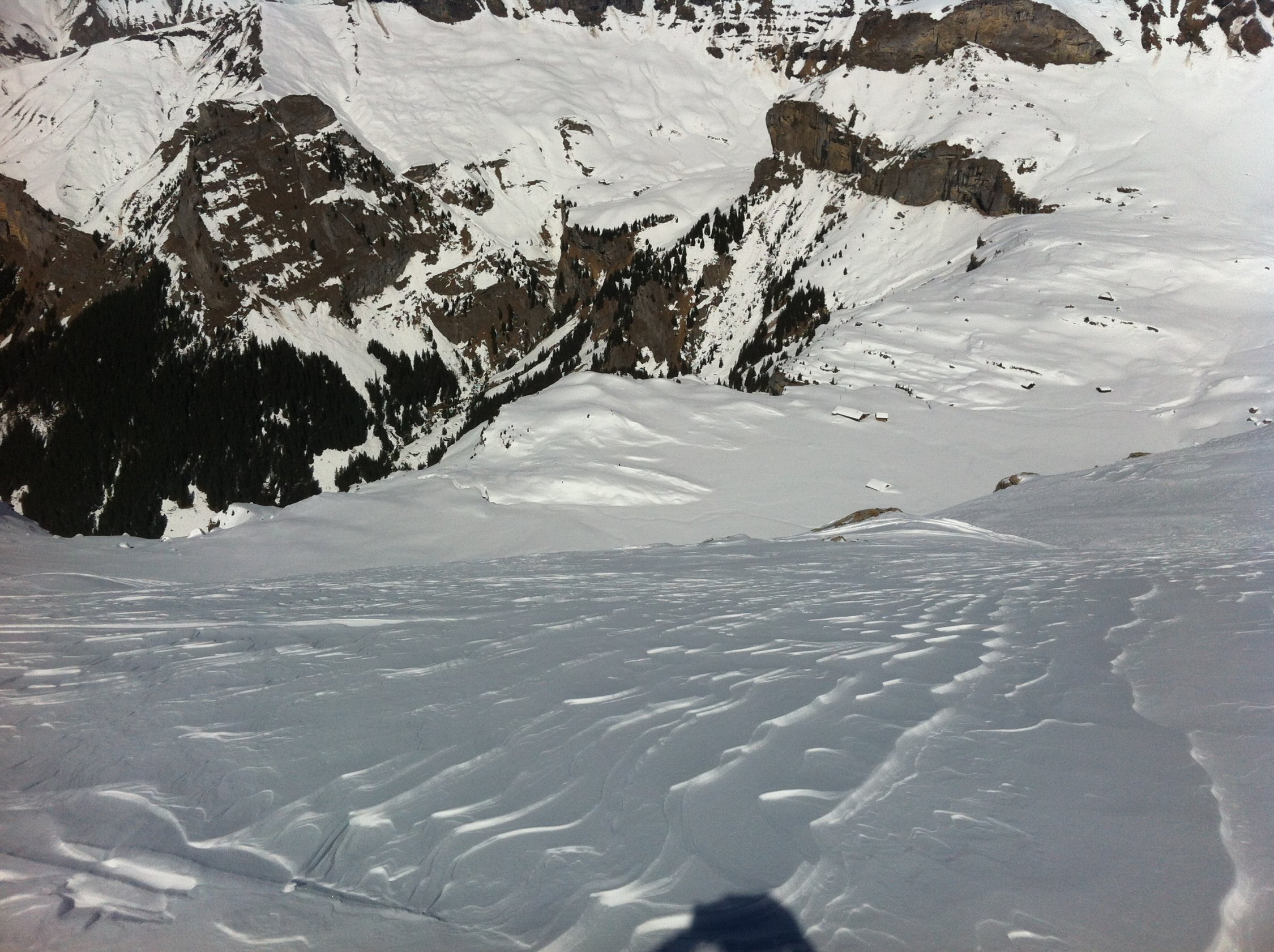 Die aussgesetzte Passage vom Schilthorn kann noch gefahren werden, vereist und "versteint" aber zunehmend. Gute Spur aufs Hundshorn.