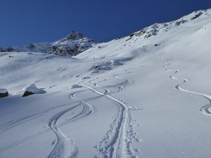 Perfekt, im Aufstieg Trittschnee und Pulver auf der Abfahrt
